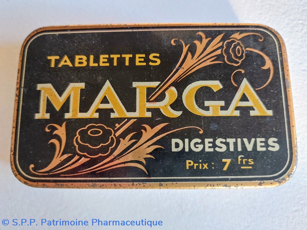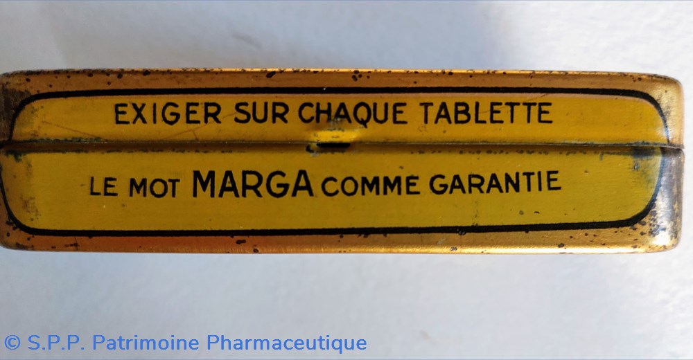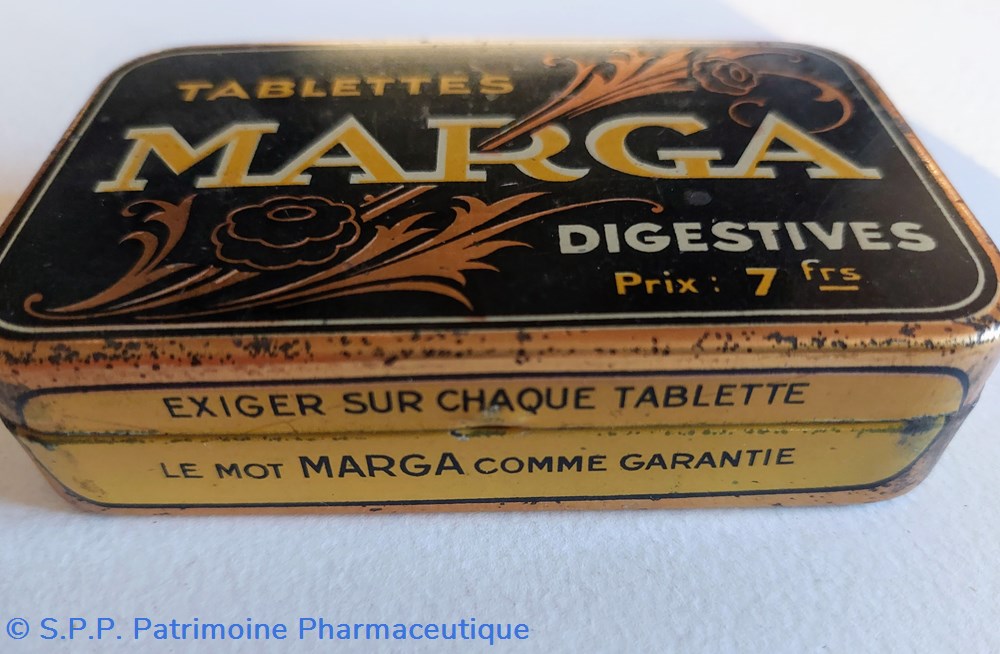 Boîte métal vide 10*6 cm ayant contenu des tablettes MARGA pour gastrites gastralgies aigreurs et maux d'estomac.