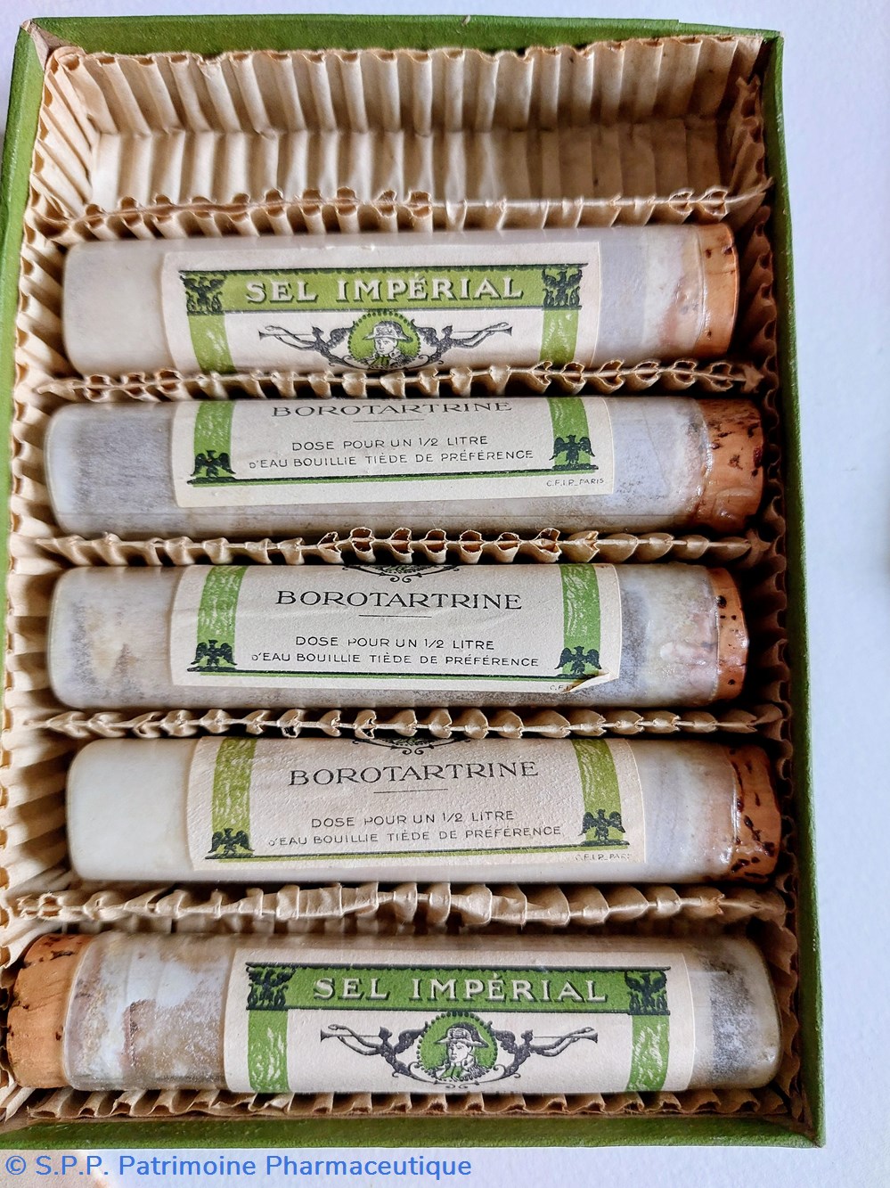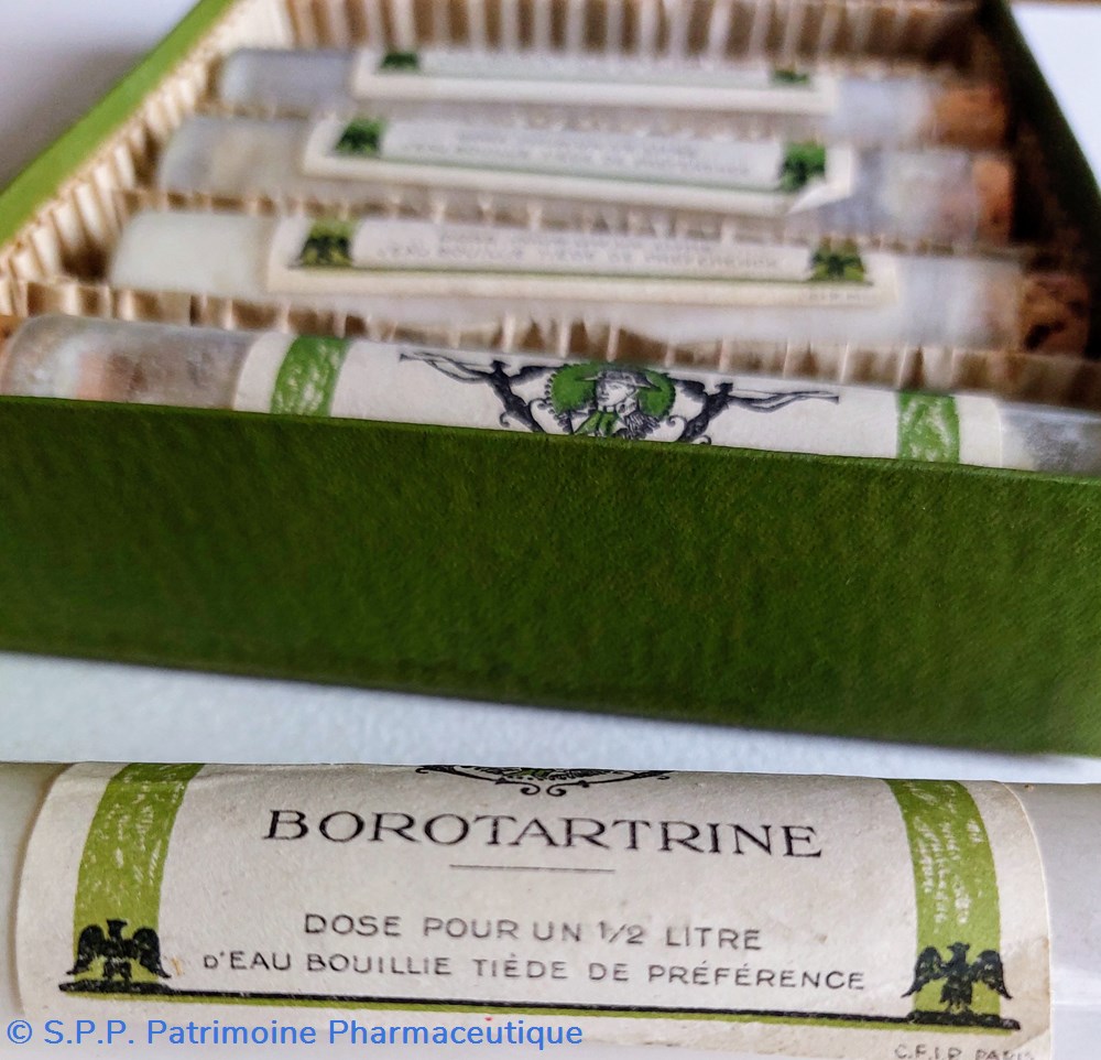 Belle boîte en carton ( 16,5 * 12 cm *- H. 3 cm) contenant 5 tubes en verre ( 1 manquant) remplis de poudre blanche. Chaque tube est une dose pour un demi litre d'eau bouillie.