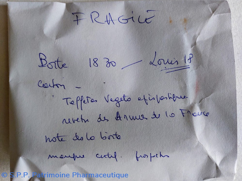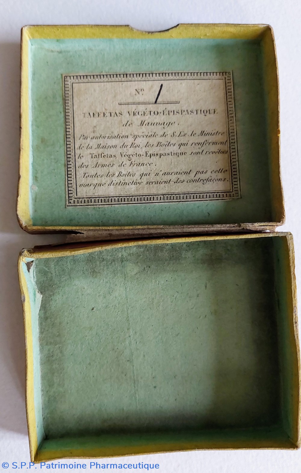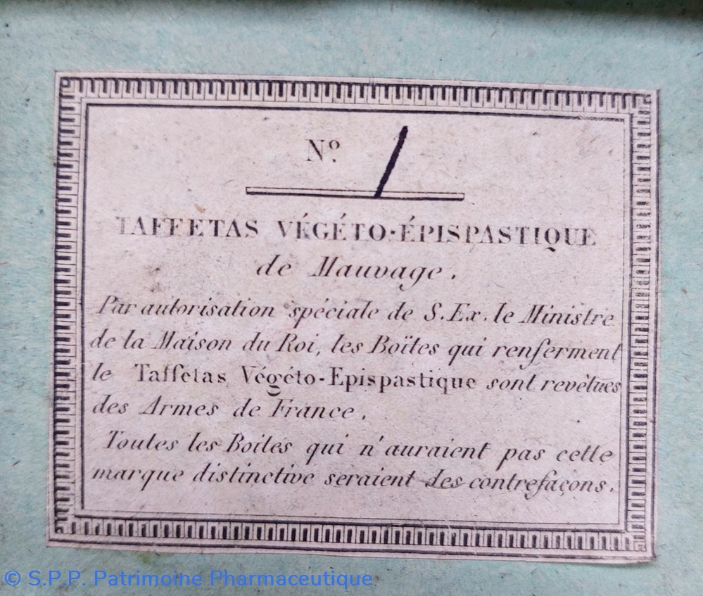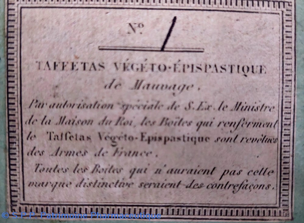Les boîtes contenant le TAFFETAS ÉPISPASTIQUE sont revêtues des Armes de France.