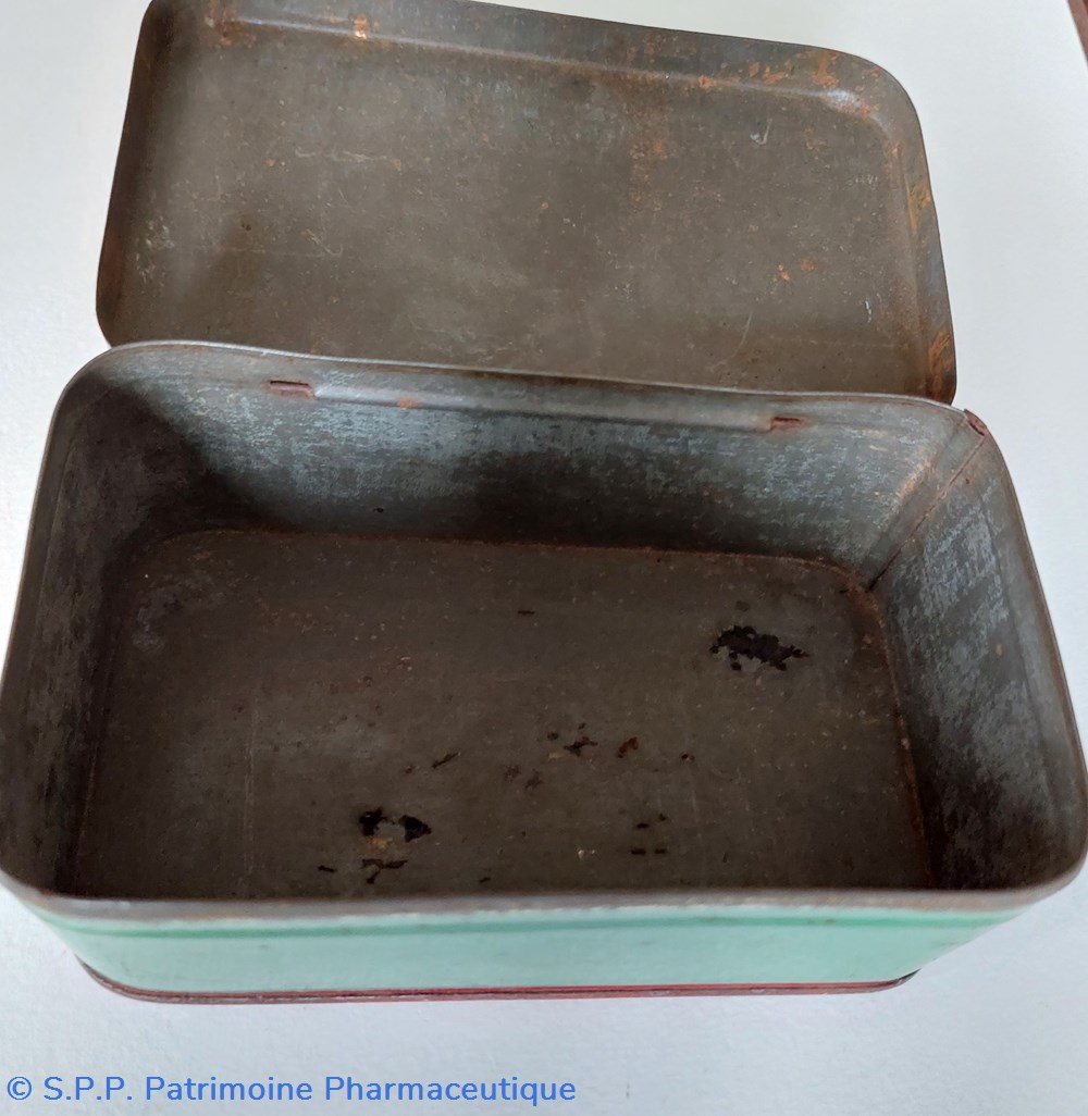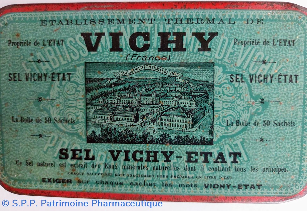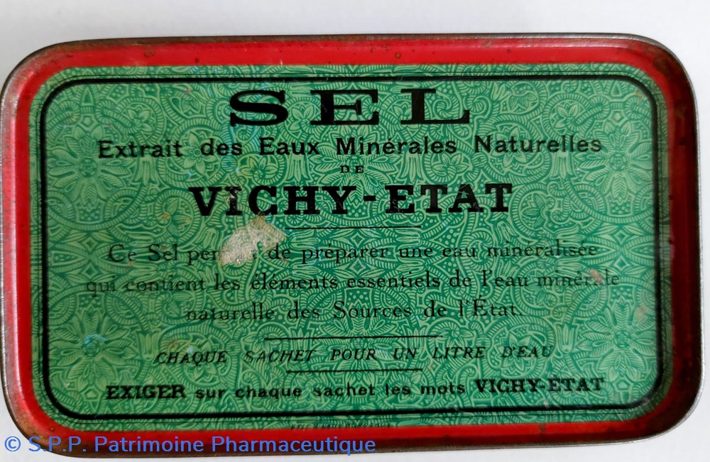 Boîte métallique vide 14 * 8 cm hauteur 5,5 cm ayant contenu 50 sachets de SEL VICHY - ETAT : PRÉPARATIONS pour mineraliser 1 litre d'eau.