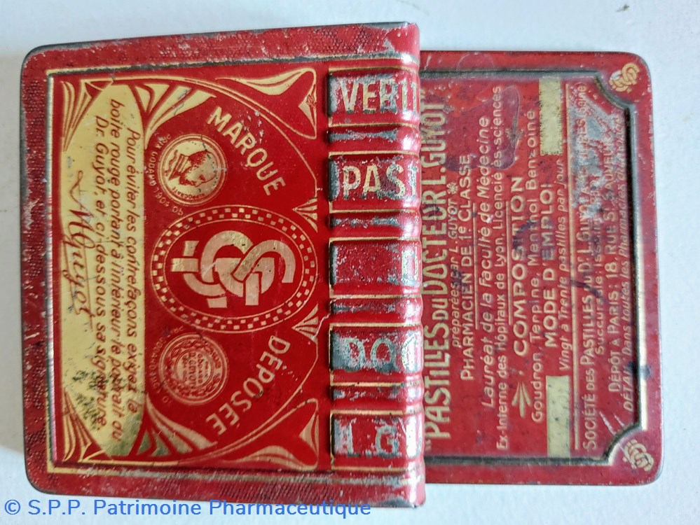 Petite boîte métallique vide ayant la forme d'un livre ayant un contenu LES PASTILLES DU DOCTEUR GUYOT