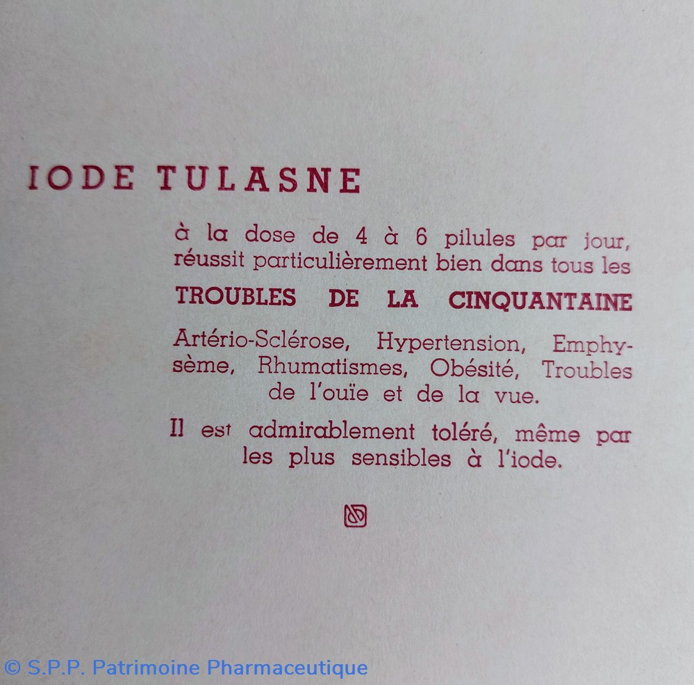 IODDE TULASNE contre les troubles de la cinquantaine : Artériosclerose Hypertension Emphysème Rhumatismes Obésité Troubles de l'ouïe et de la vue.