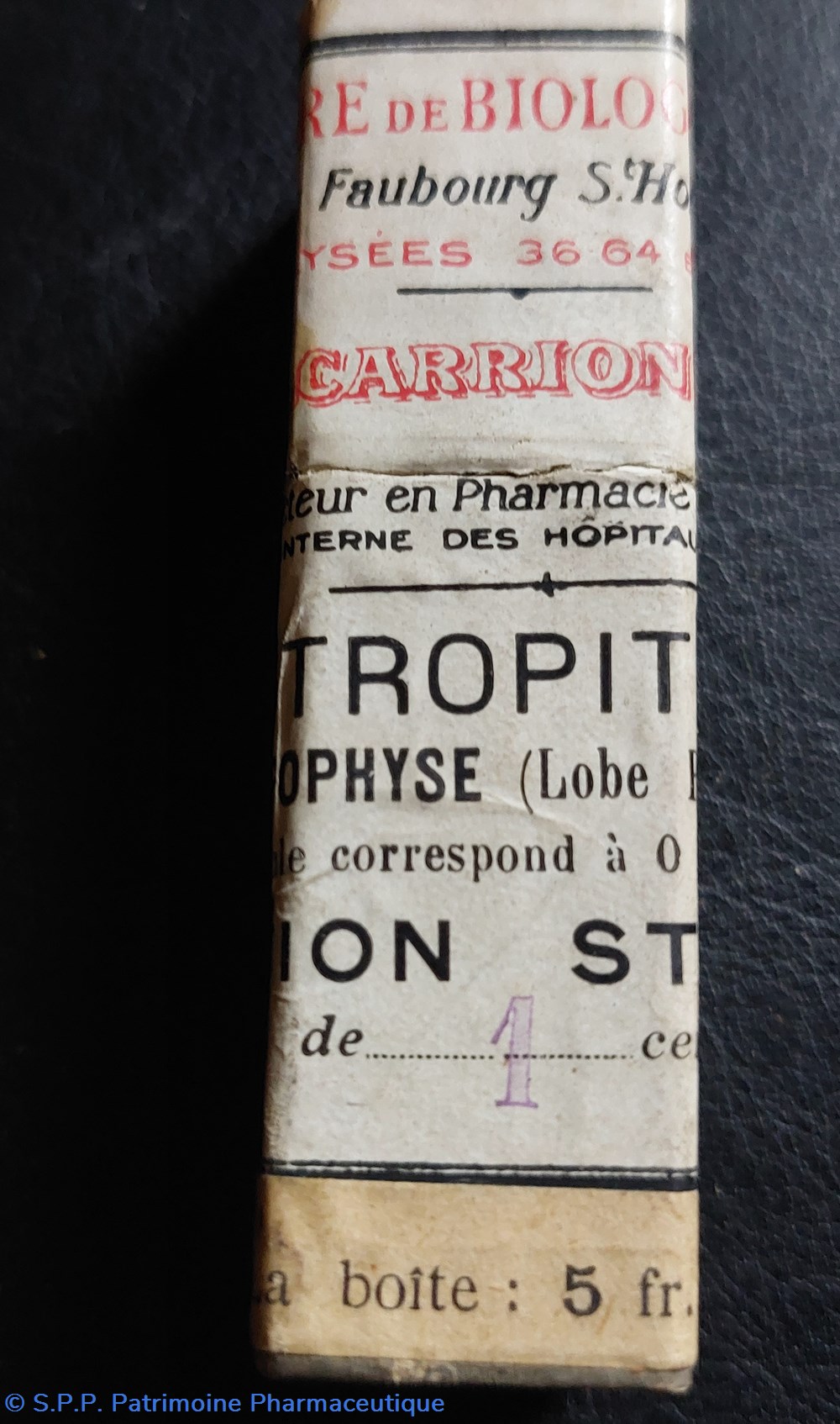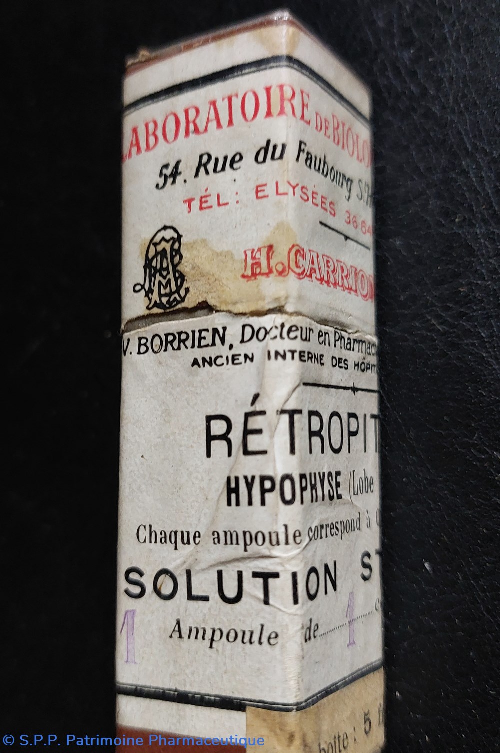Emballage carton hauteur 7,5 cm base 2*2 cm ayant contenu une ampoule de RETROPITUINE Emploi obstétrique permettant la contraction de l'utérus.