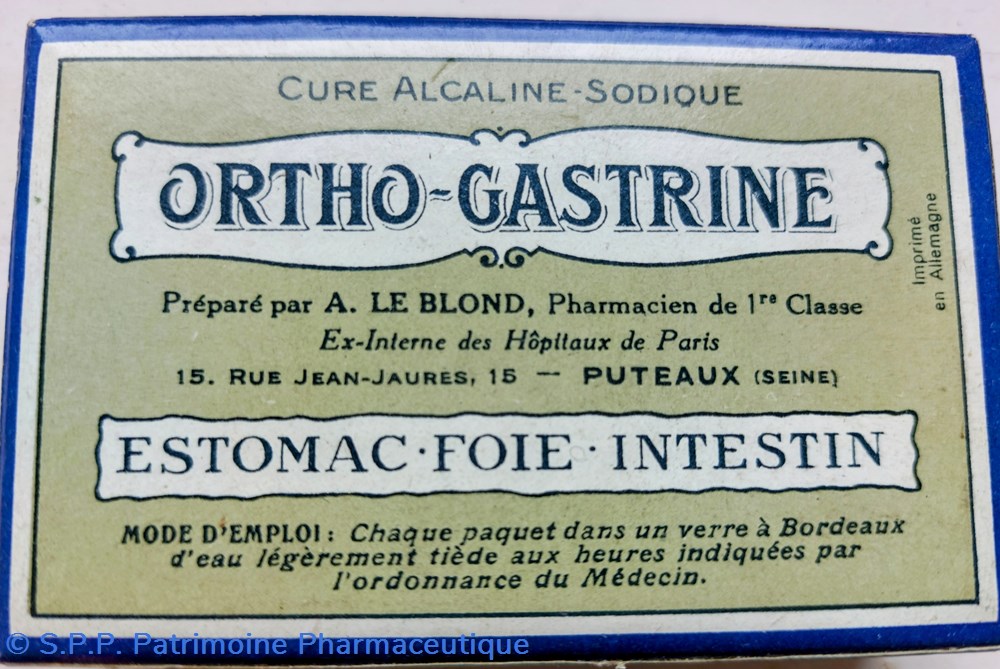 Boîte carton contenant des sachets de poudre pour estomac, foie, intestin. Cure Alcaline Sodique.