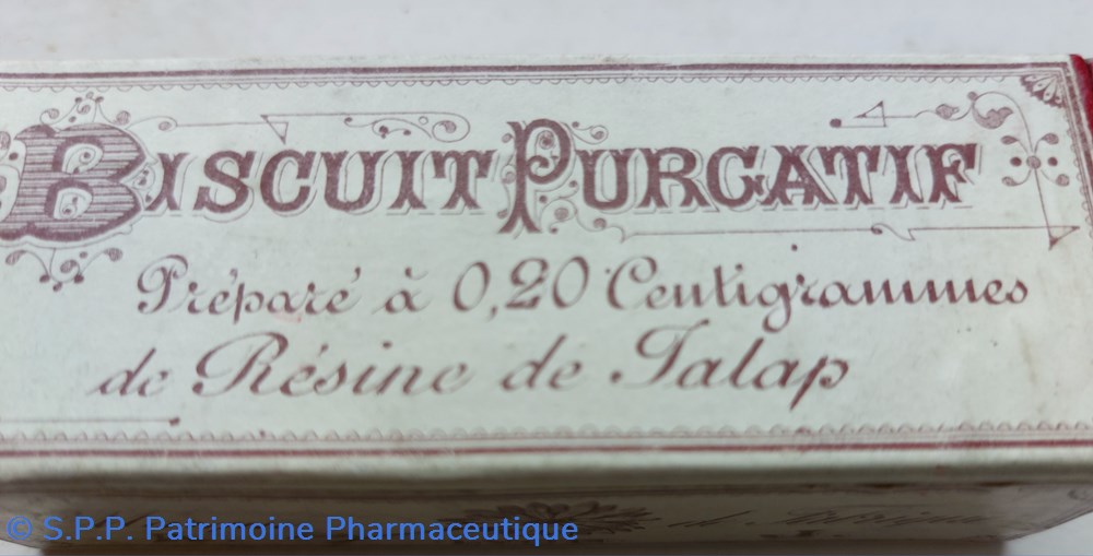 Boîte carton scellée contenant des biscuits Purgatif préparé à c 0.20 cg de résine de jalap ( Racine de plante herbacée du Mexique.