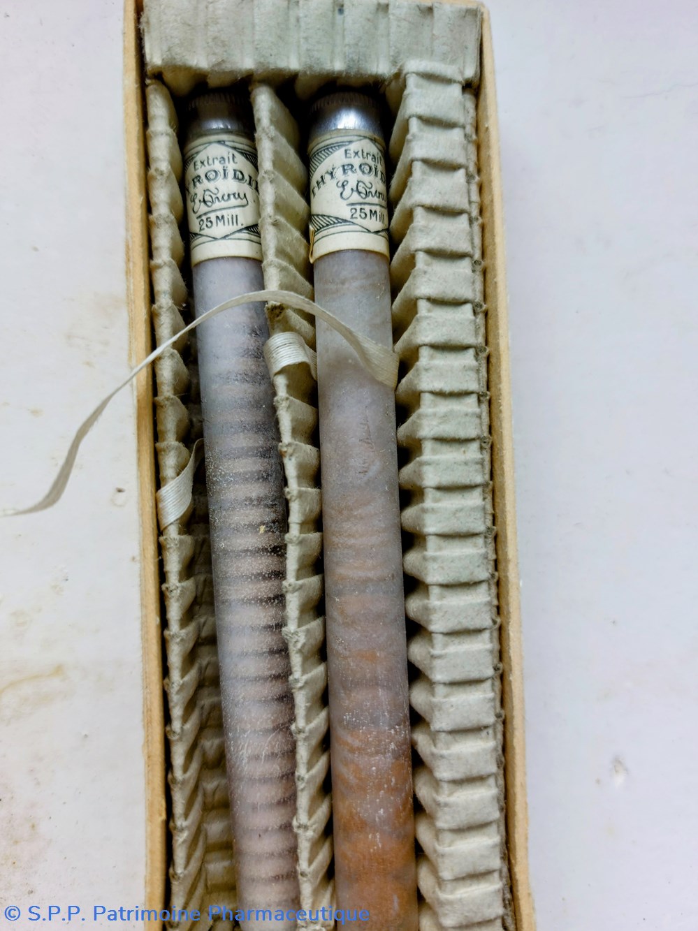Boîte carton contenant deux tubes de comprimés d'extrait Thyroïdien. Dosage 0gr 025 par comprimé.