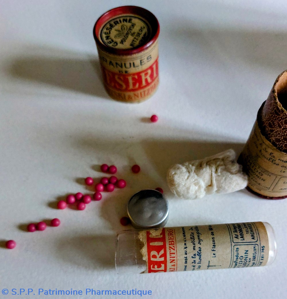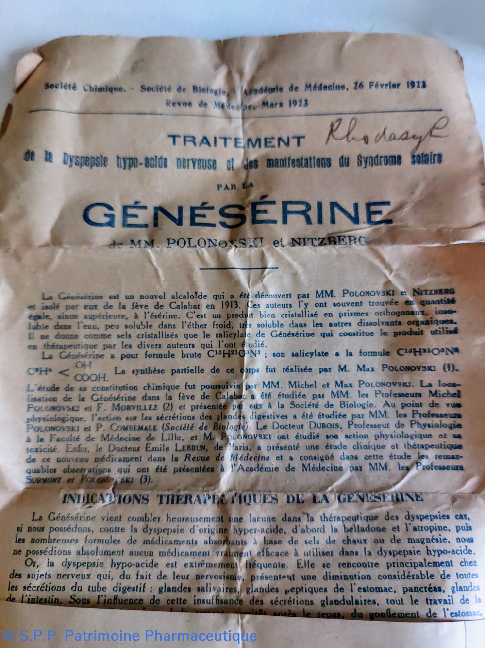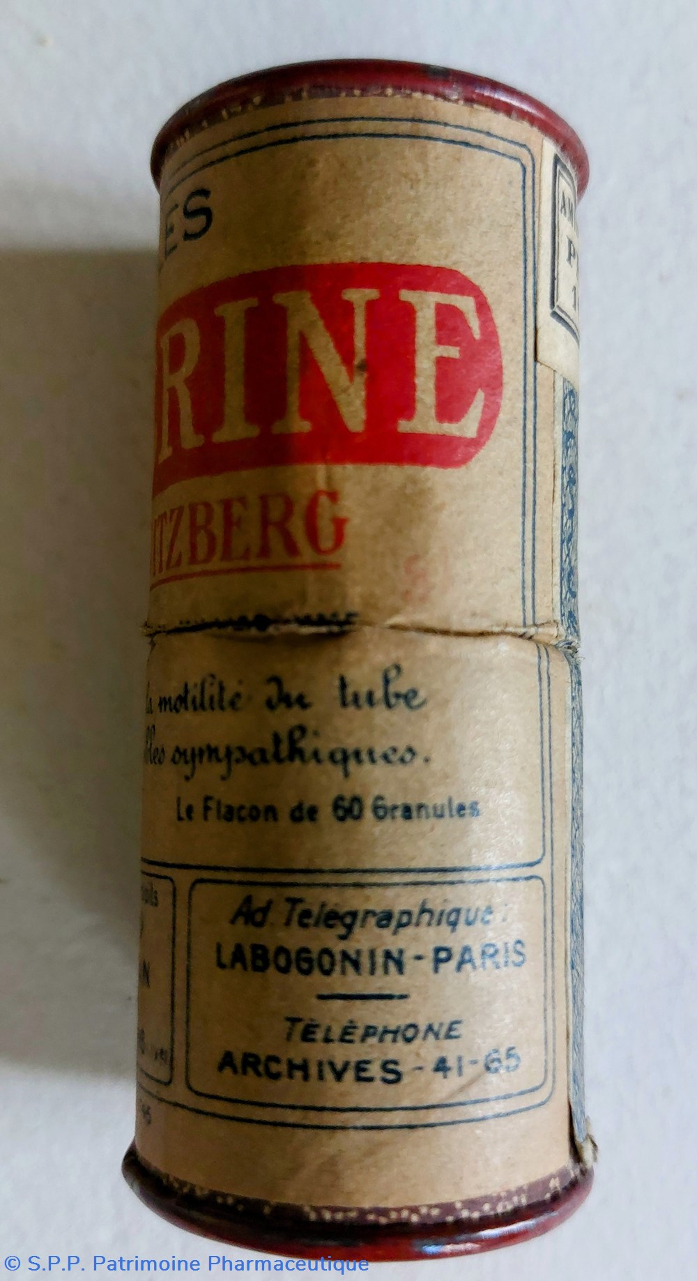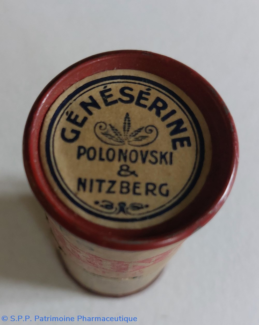 Emballage cylindrique contenant un tube transparent de 60 granulés de GENESERINE POLONOVSKI et NITZBERG pour traitement de la Dyspeptie hypo et acide nerveuse et des manifestations du syndrome solaire.