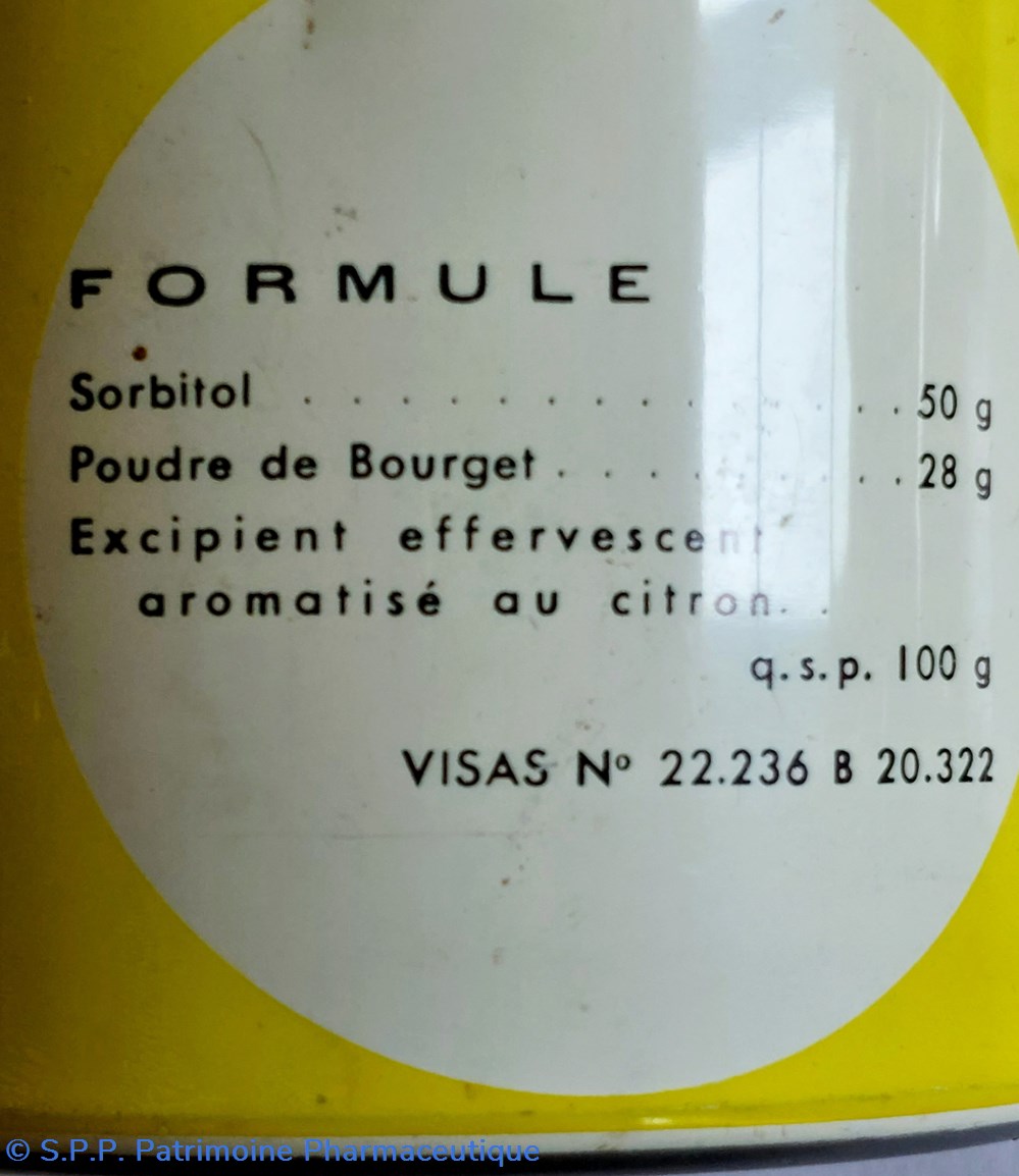 Formule: Sorbitol, Poudre de Bourget et excipient effervescent aromatisé au citron .