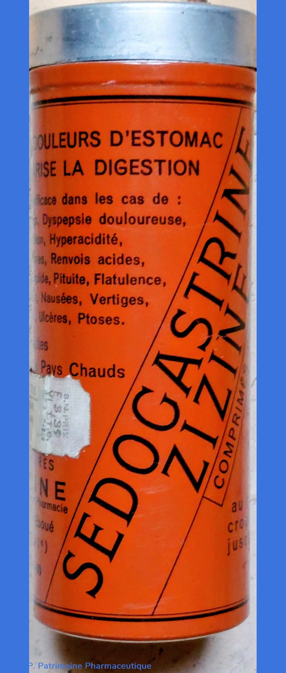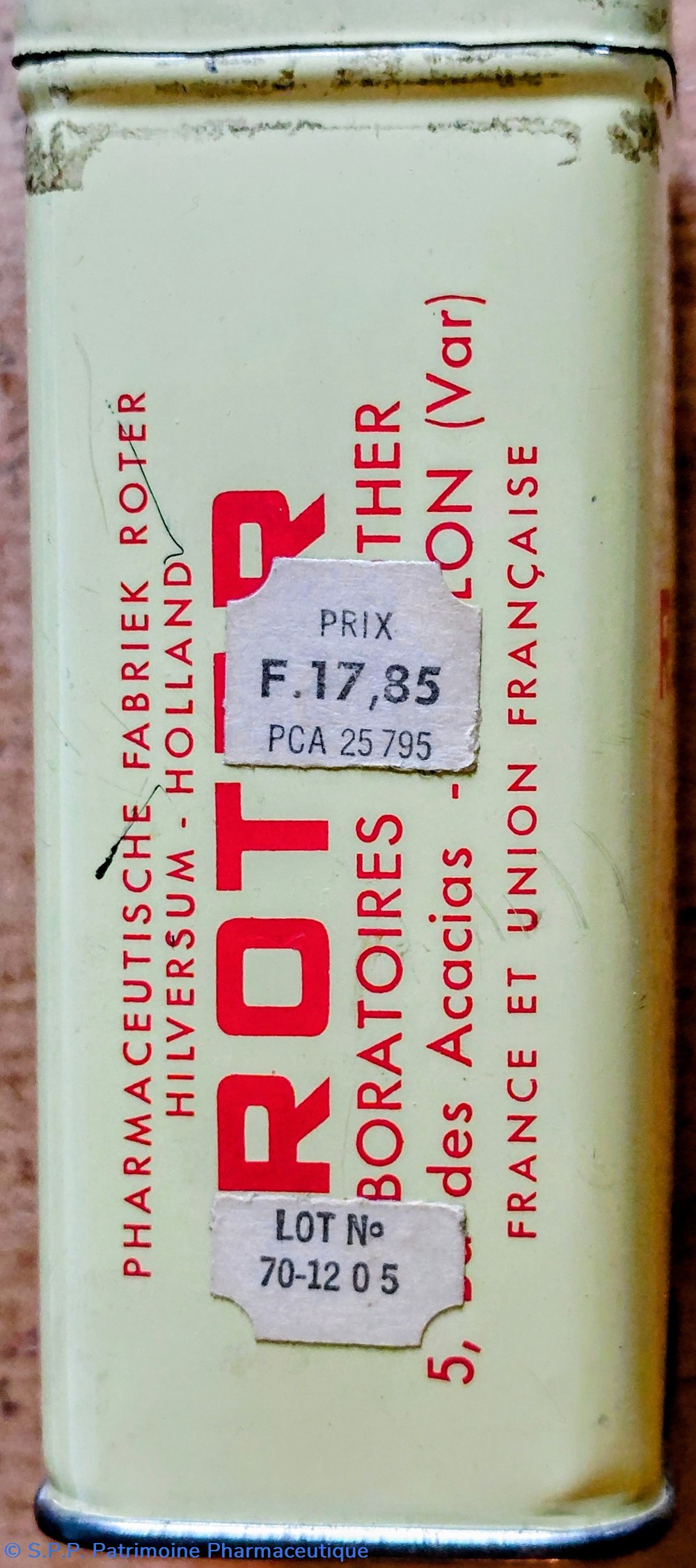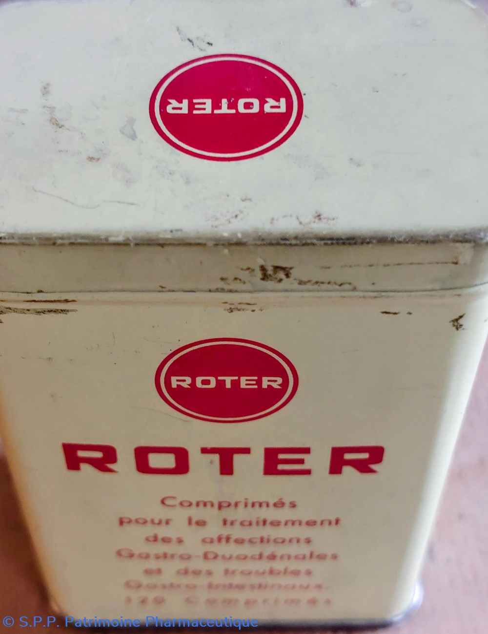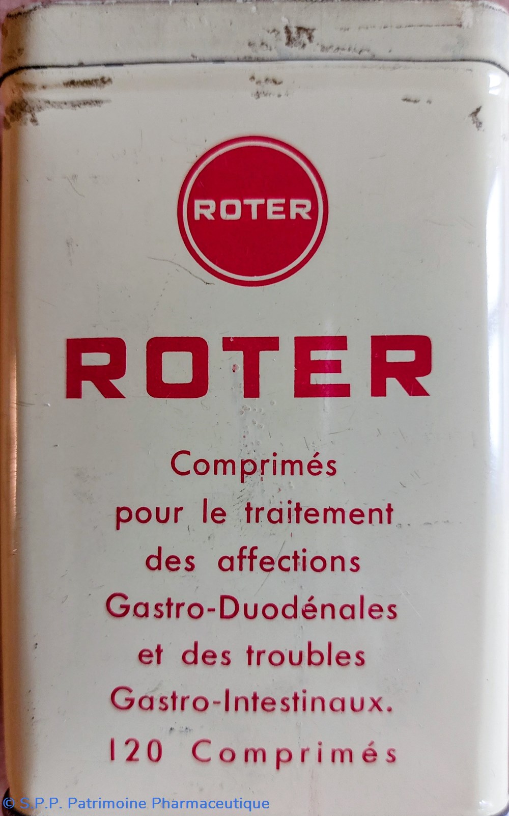 Boîte métallique vide ayant contenu 120 comprimés ROTER pour le traitement des affections gastro- duodénales et des troubles gastro- intestinaux.