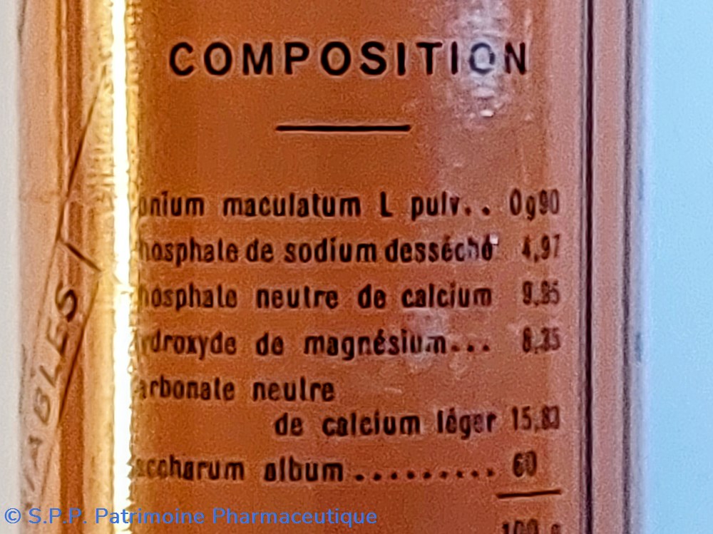 Coposition : Conium maculatum, Phosphate de sodium désseché, Phospate neutre de calcium, Hydroxyde de magnésium, Carbonate neutre de calcium, Saccharum album.