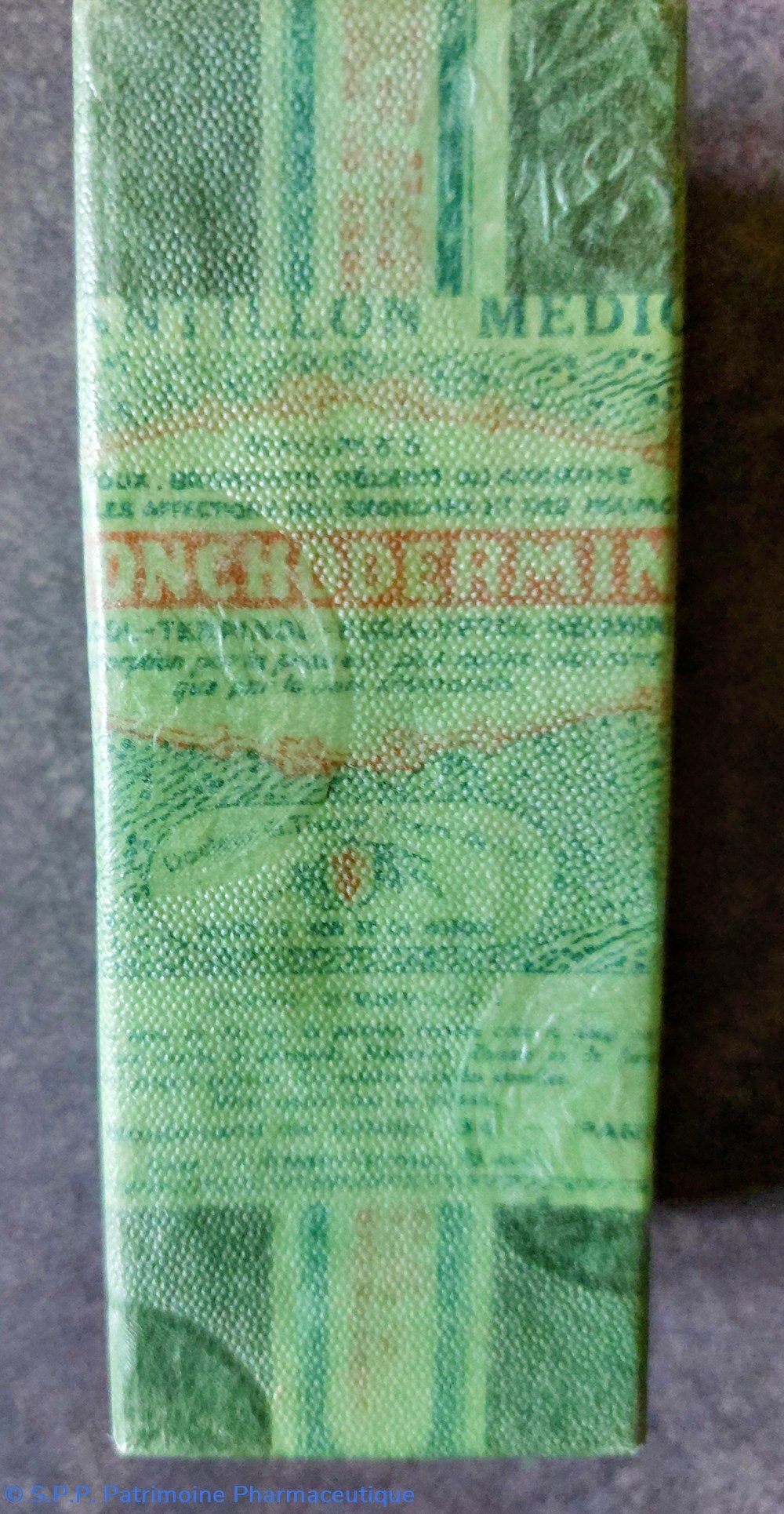 Boîte carton sous emballage d'origine contenant BRONCHODERMINE pour traitement rhumes, toux, affections des bronches et des poumons....