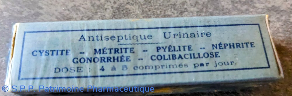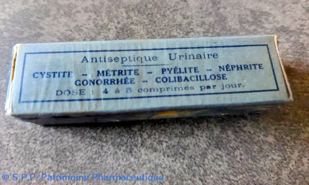 Petite boîte bleue sous cellophane contenant des comprimés pour cystite métrite pyélite néphrite