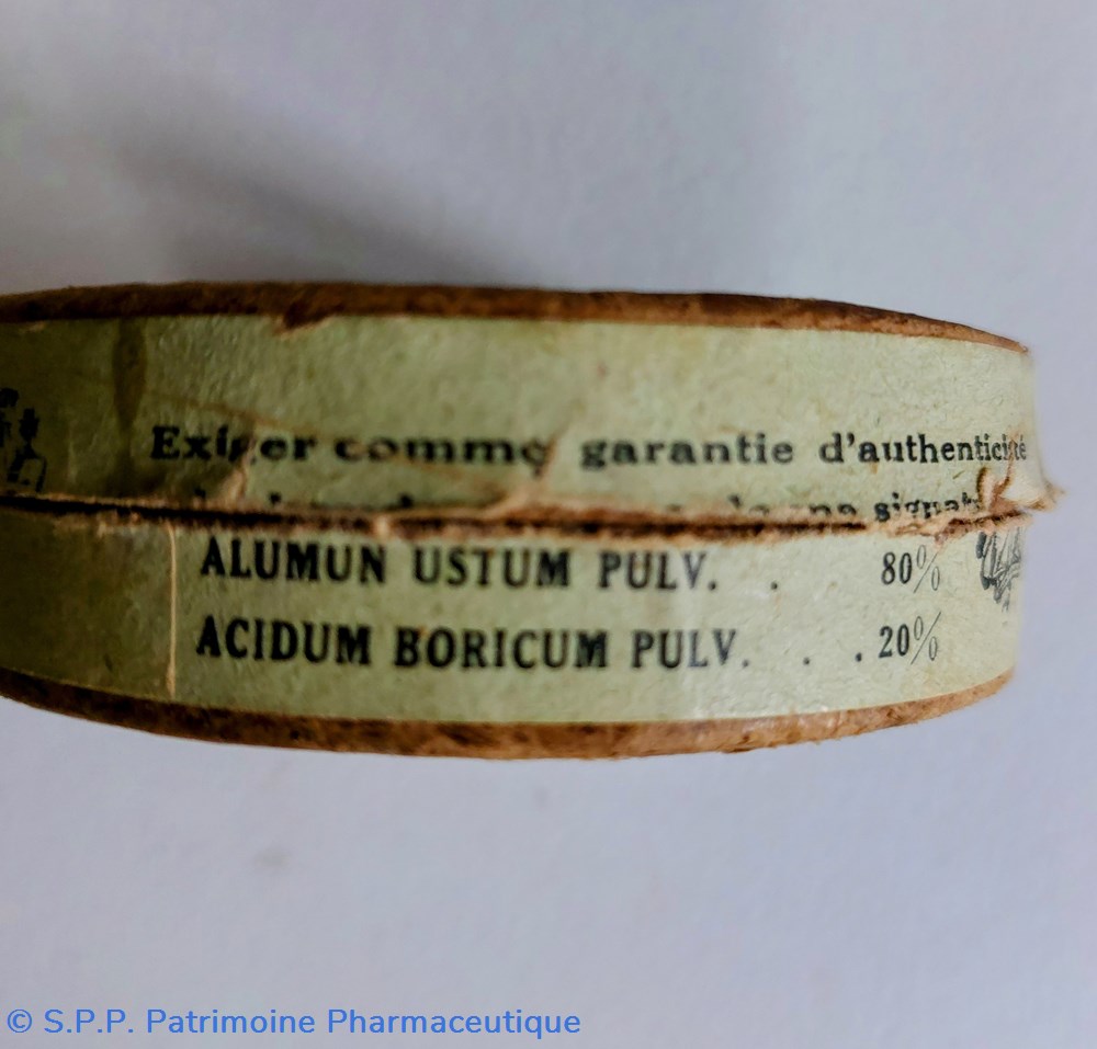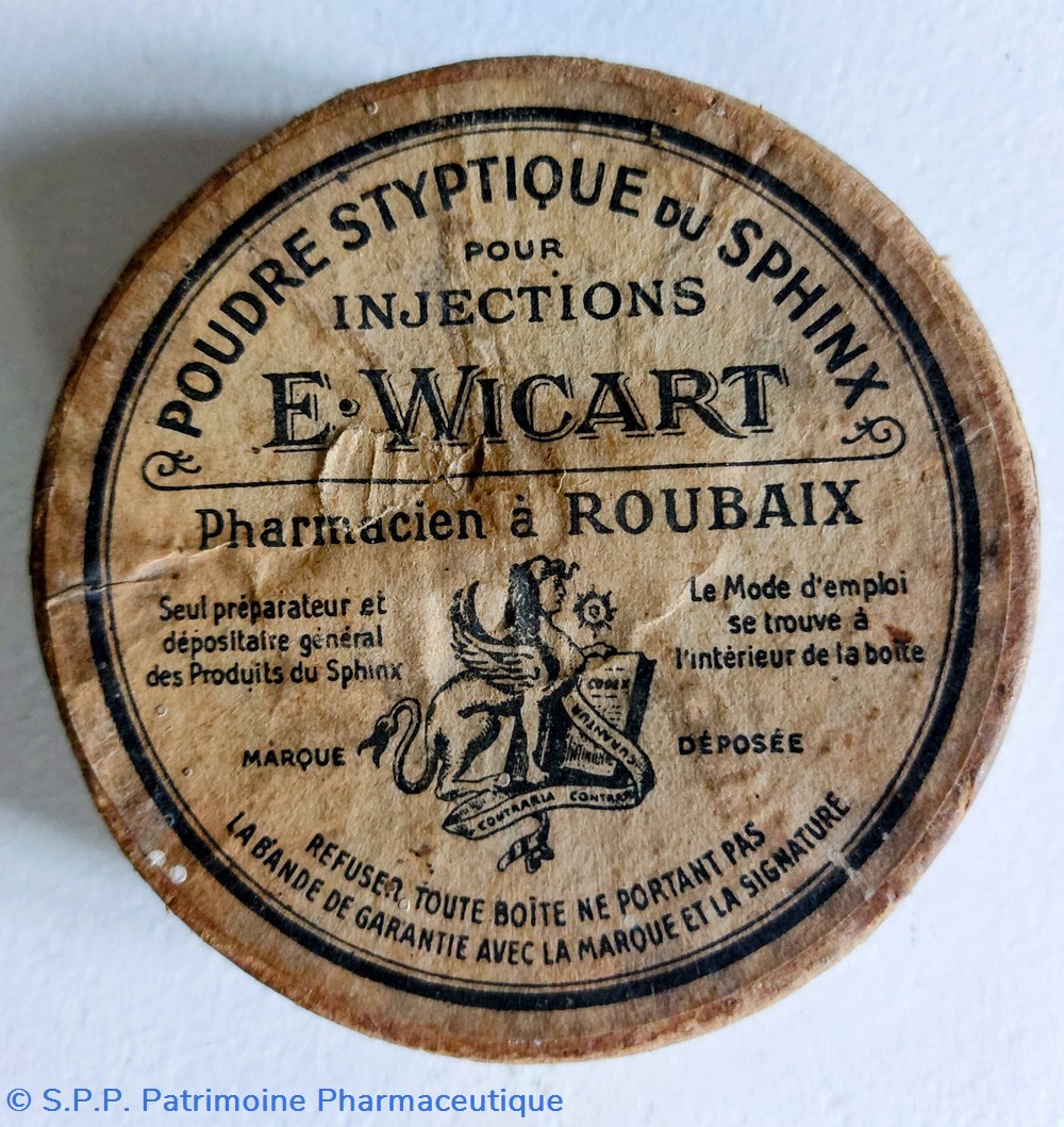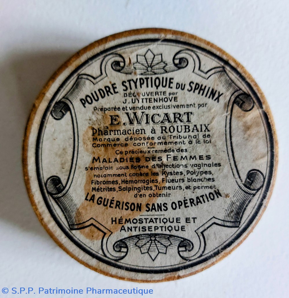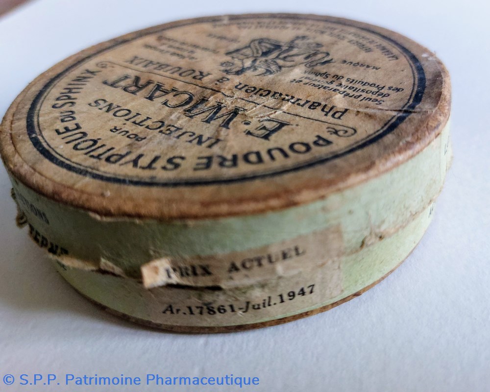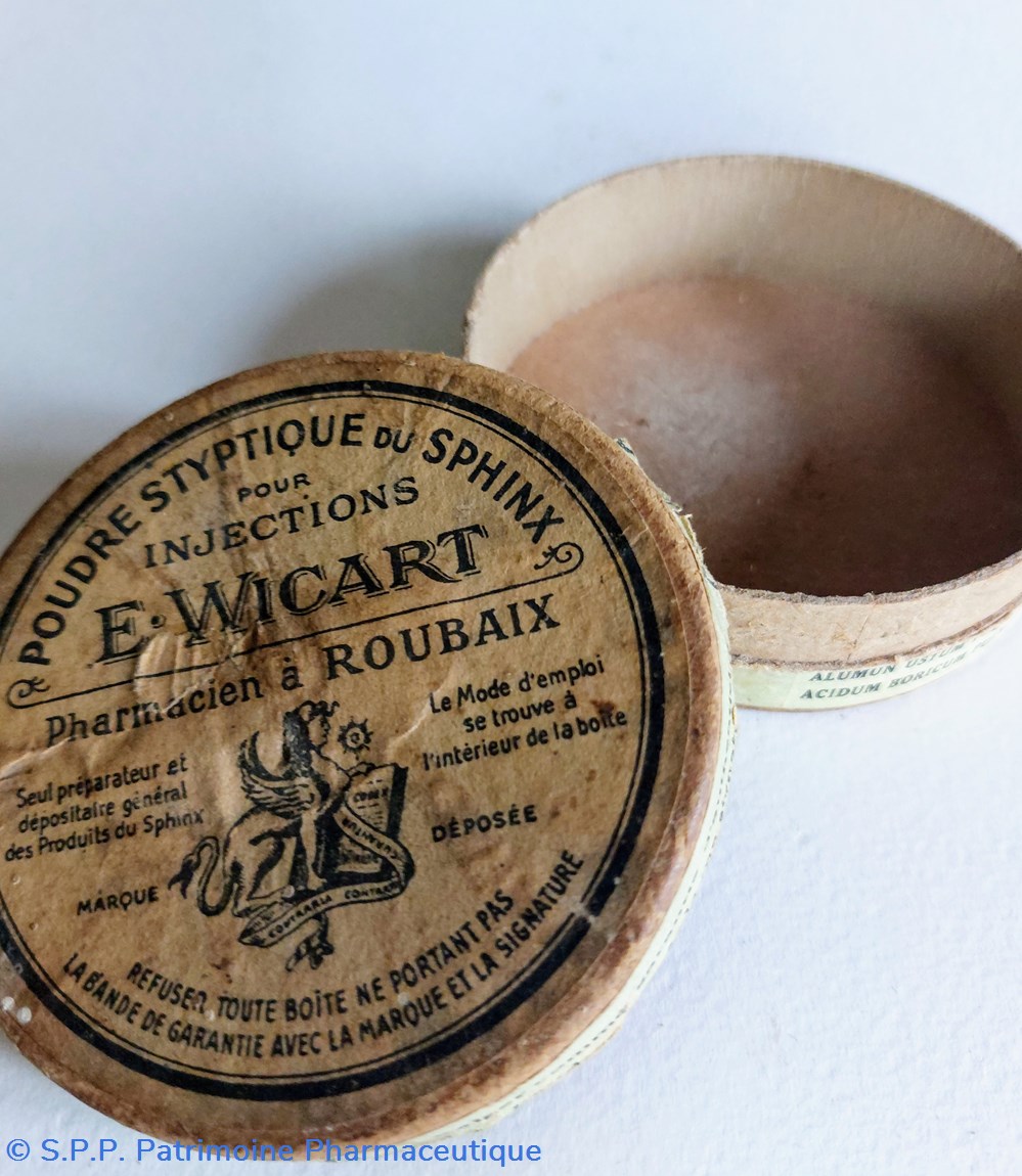 Boîte ronde cartonnée ( datée 1947) contenant de la poudre STYPTIQUE du SPHINX pour injections vaginales.