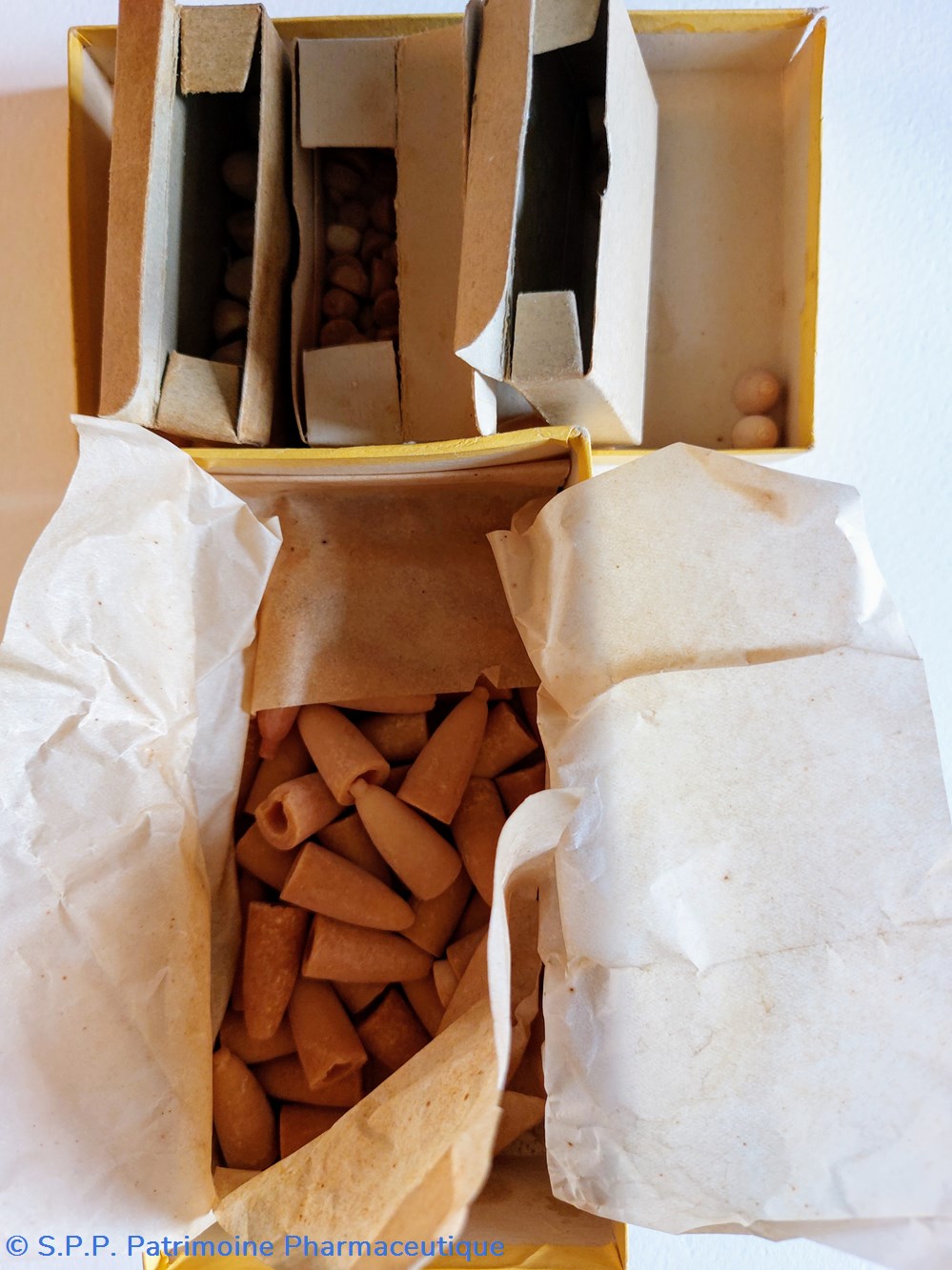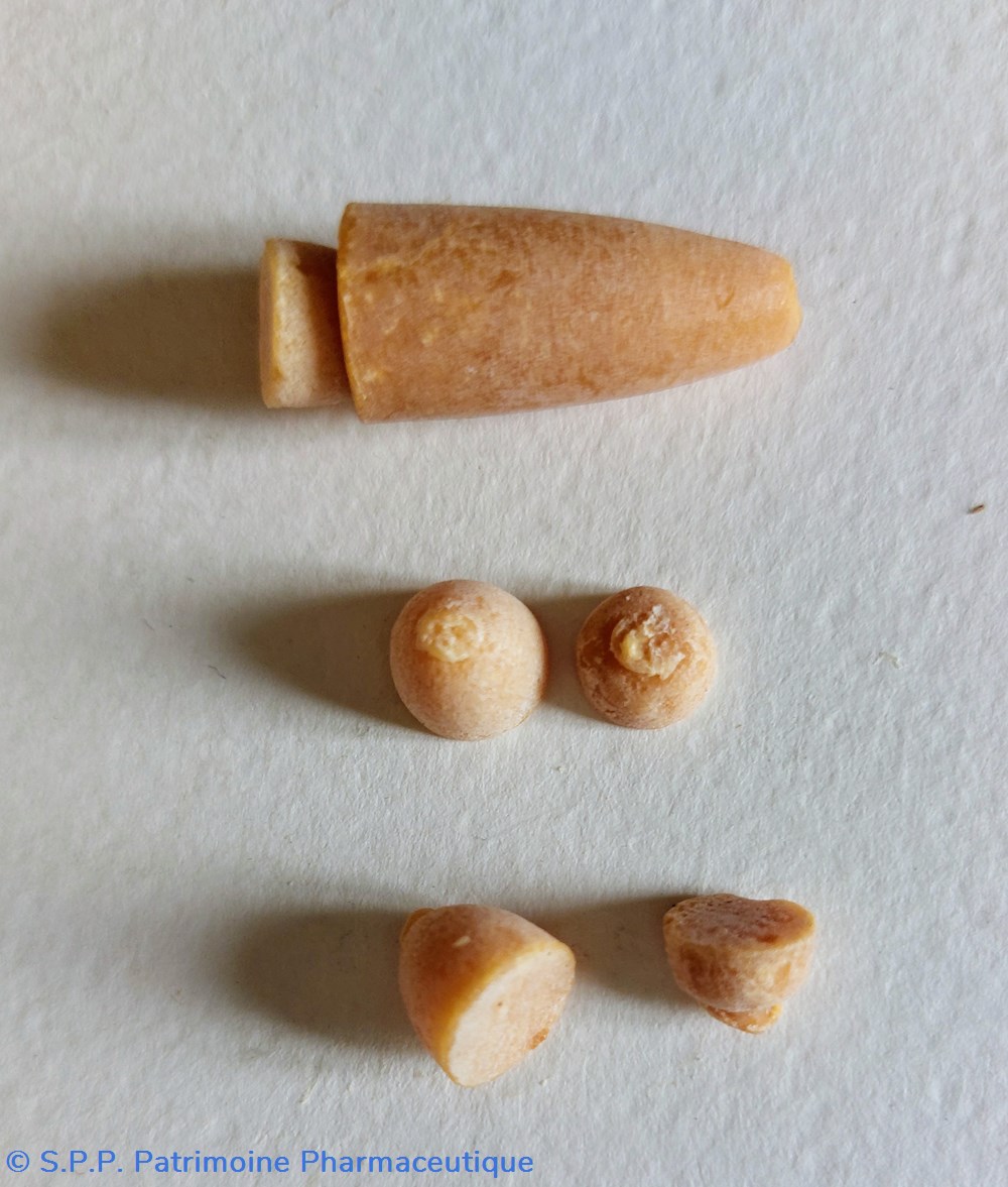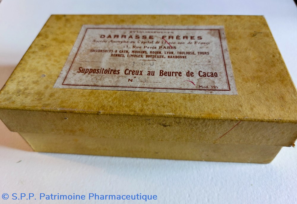 Selon Olivier Lafont, les suppositoires étaient creux et constitués d'une enveloppe conique en beurre de cacao à l'intérieur desquels sont introduits les principes actifs. On ferme à chaud avec avec un bouchon de beurre de cacao fondu. D'autres exipients ont remplacé le cacao pour des raisons d'acheminement lors de la seconde guerre mondiale.