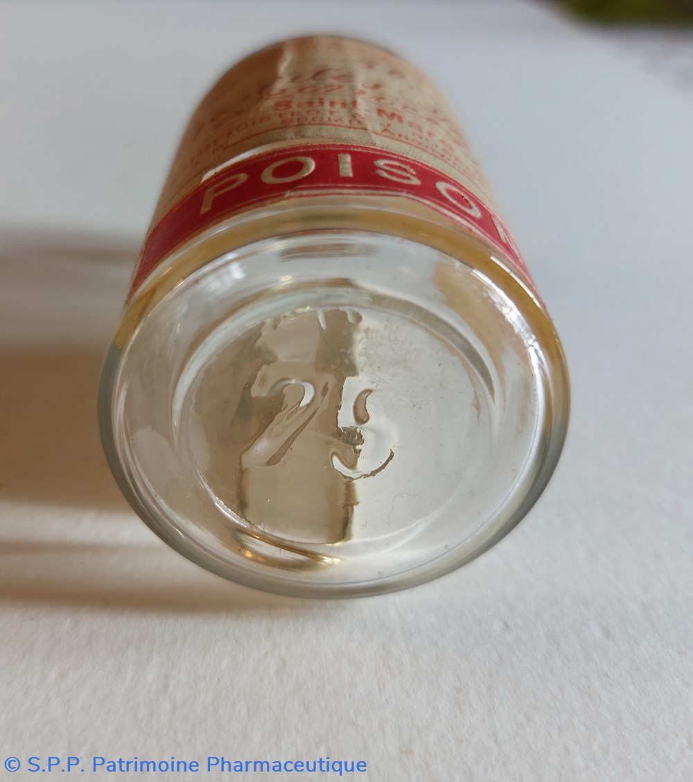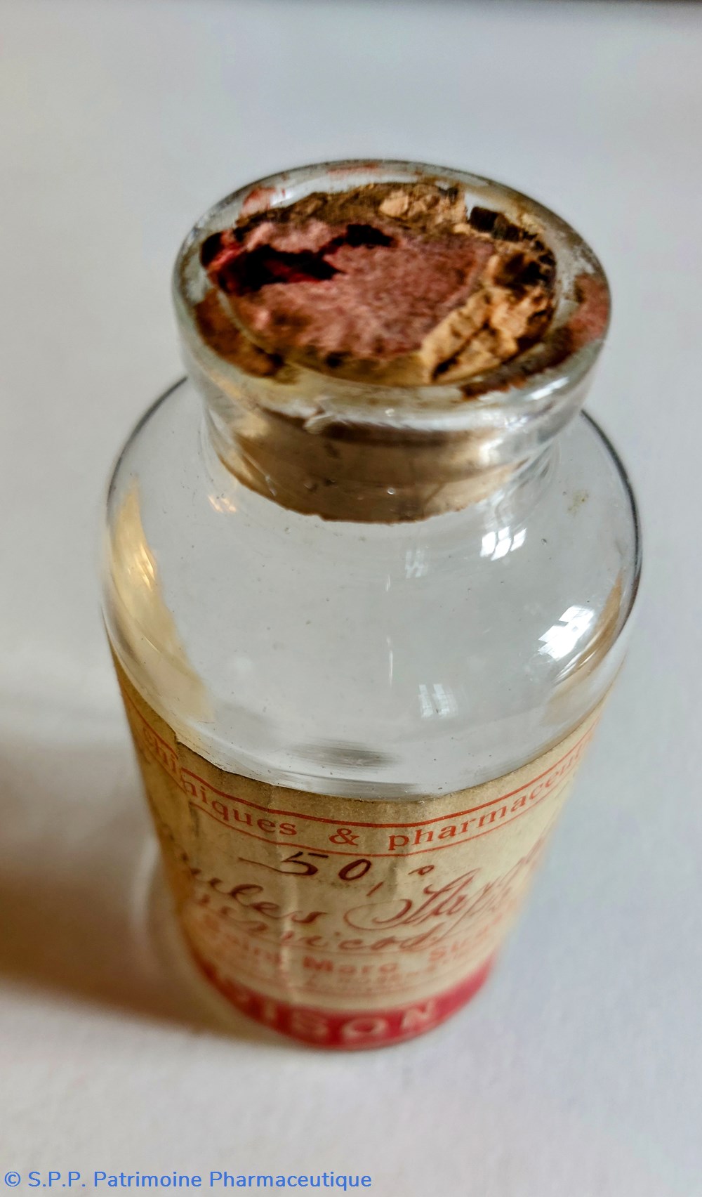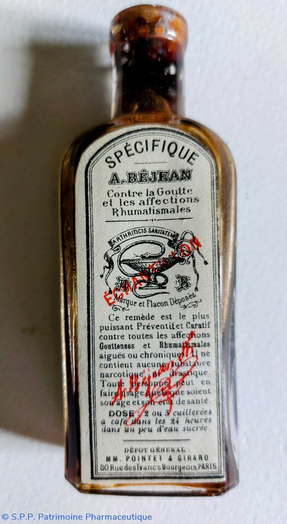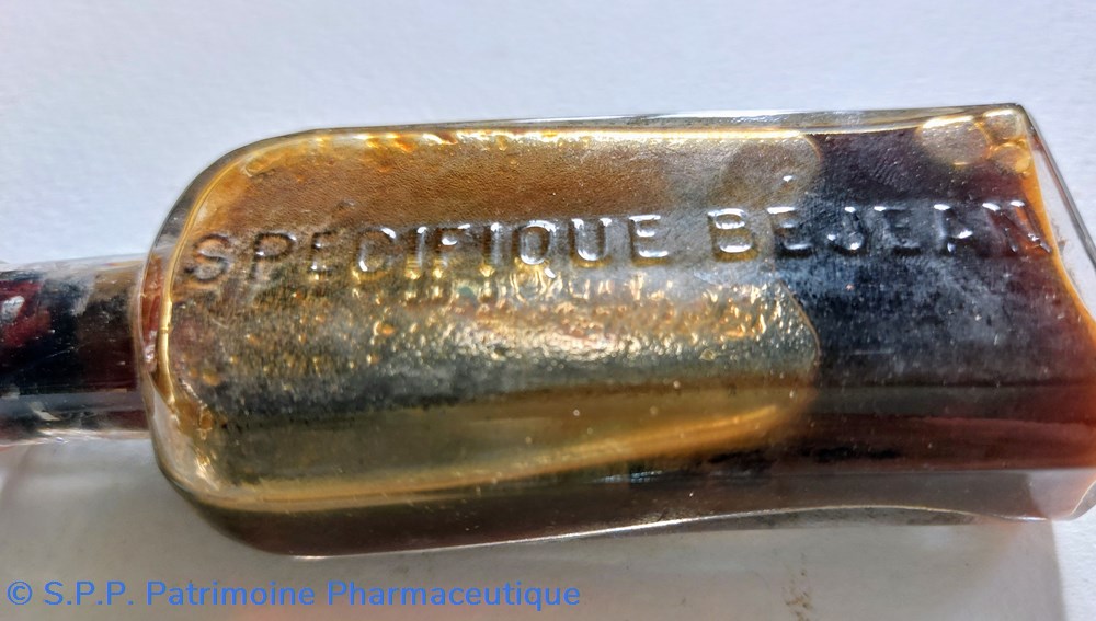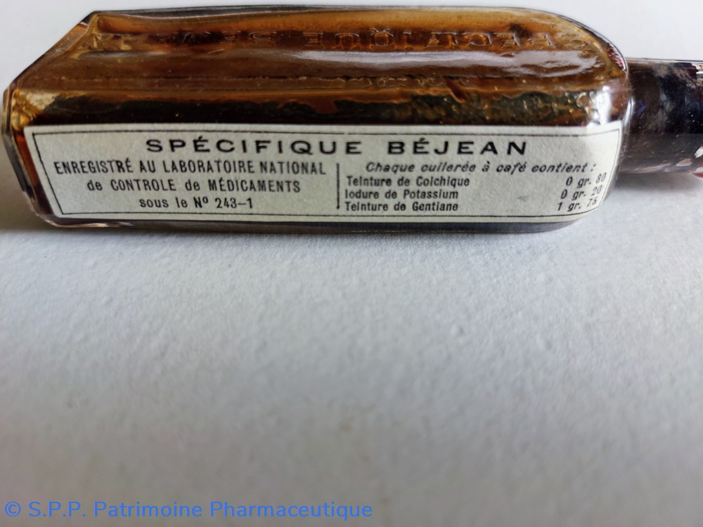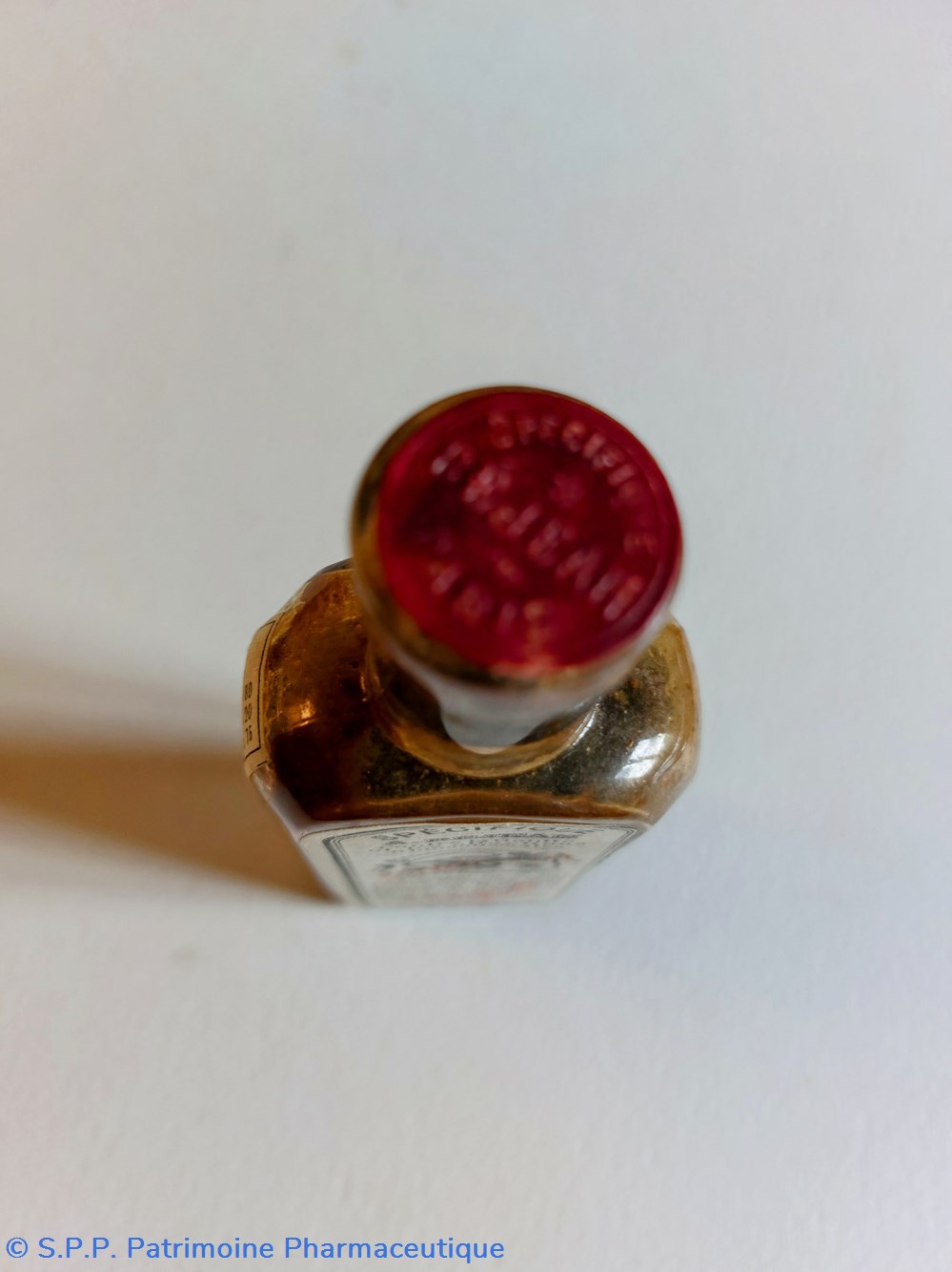 Flacon contenant du 'liquide marron scellé avec une Pastille "Spécifique Bejean"