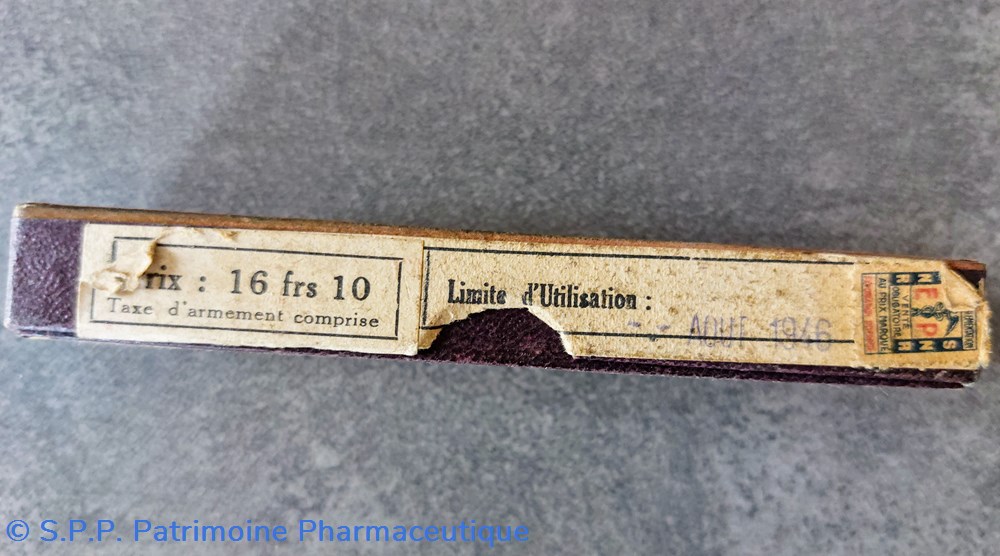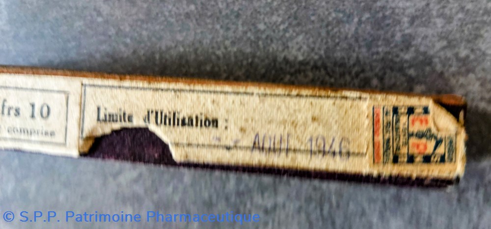 Le tube vide devait être rendu au pharmacien. Limite d'utilisation Août 1946 16f10 taxe d'armement cprise