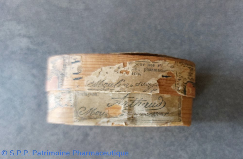 Petite boîte ovale ancienne en bois léger contenant quelques petites pilules rondes