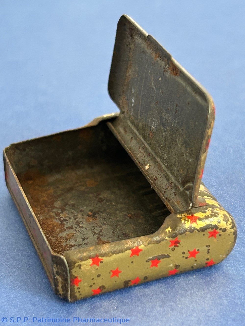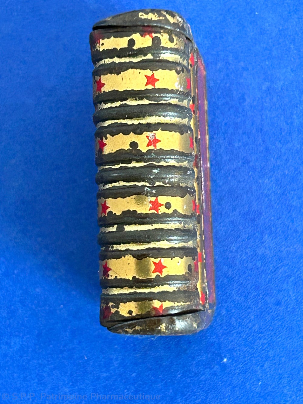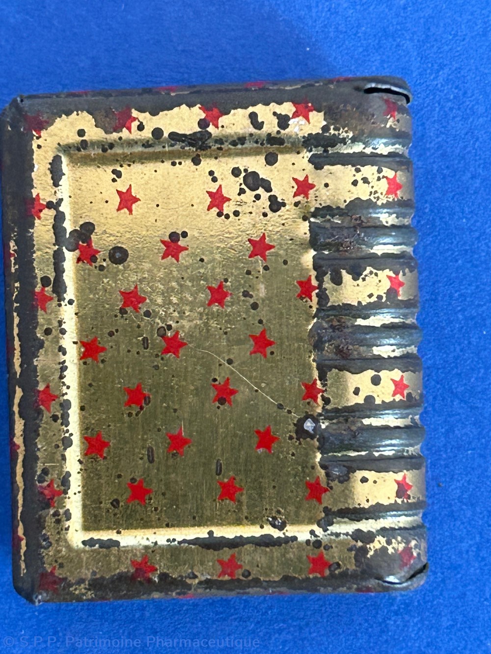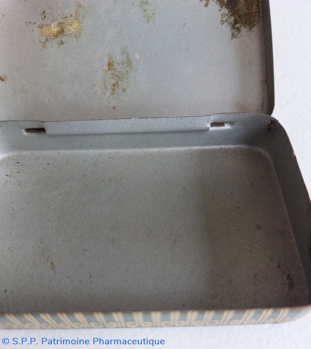 Minuscule boite métallique imitant la forme d'un livre relié. avec couvercle inséré. Aucune marque de fabricant ni d'indications thérapeutiques.