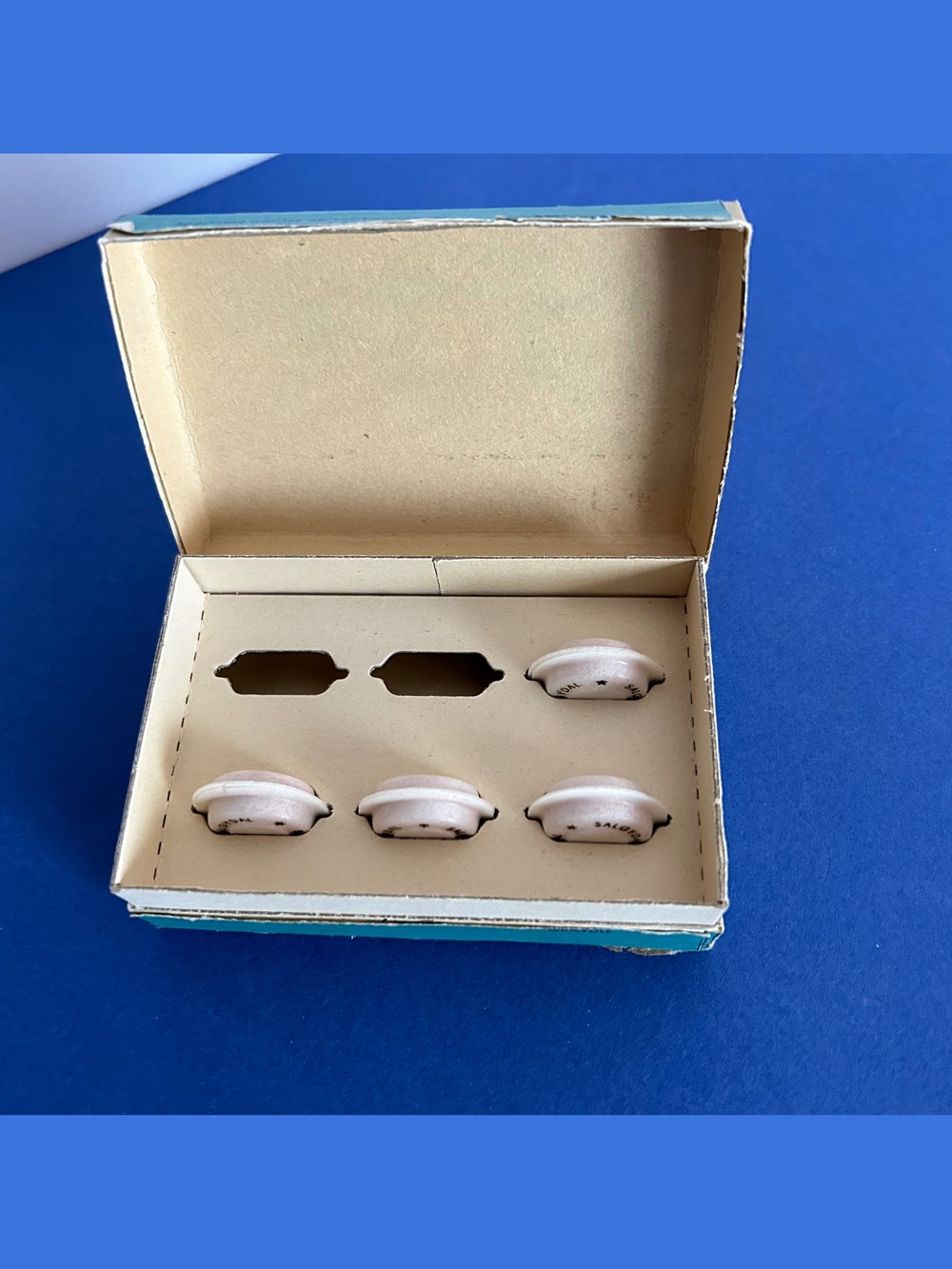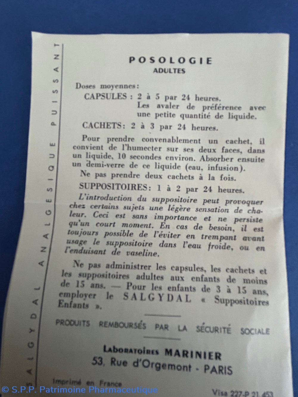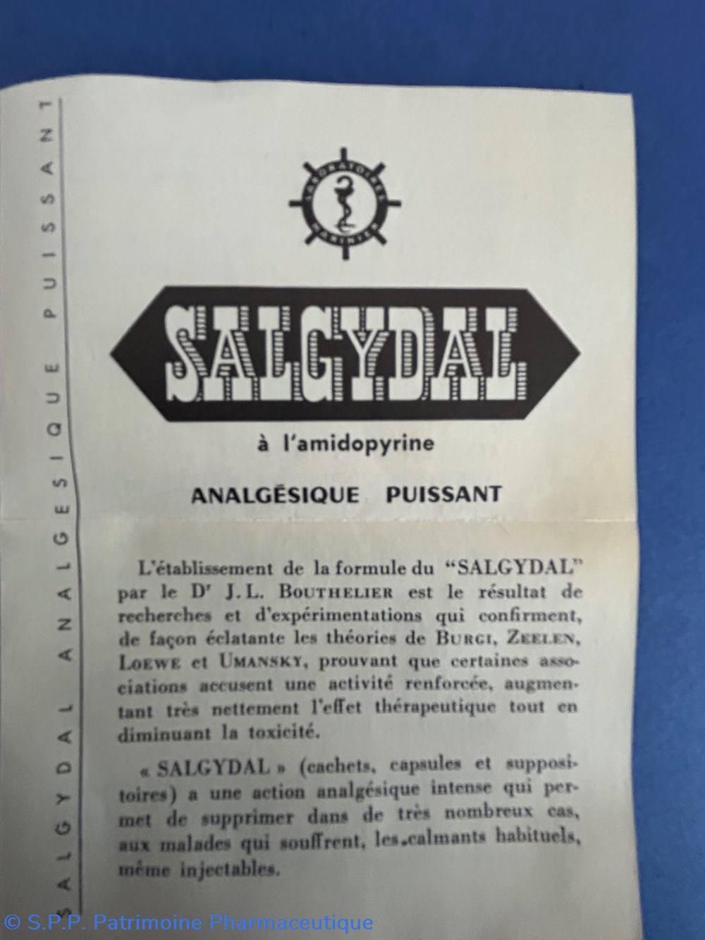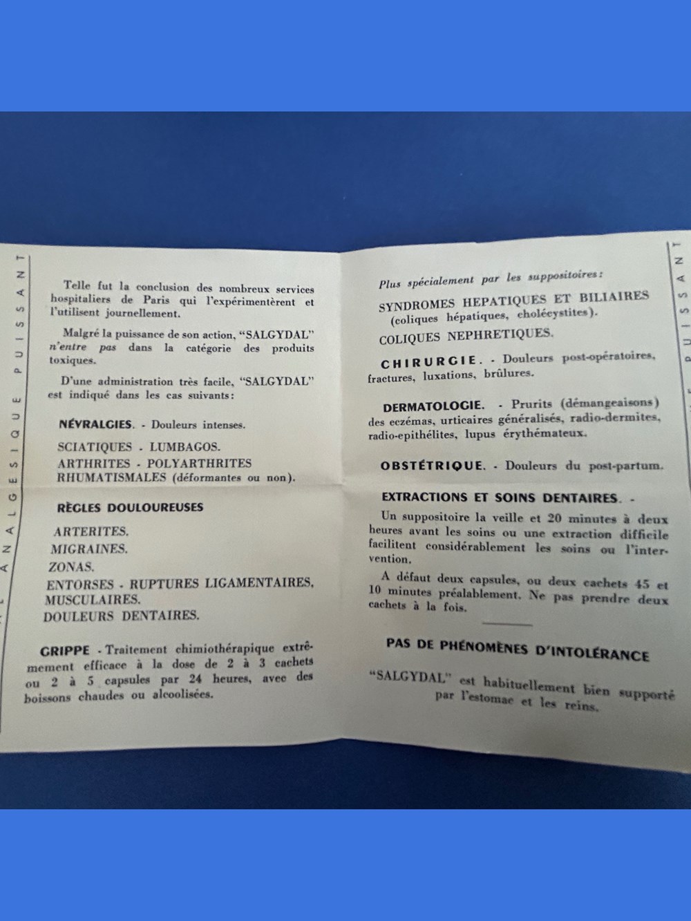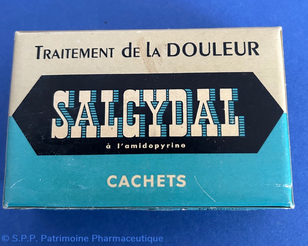 Petite boite en carton de forme parallélépipèdique avec couvercle inséré. Le sessus du couvercle porte la marque : SALGYDAL avec la mention : Traitement de la douleur.Les doses moyennes de posologie ainsi que la formule du médicament sont au verso de la boîte. Quatre xachets sont encore disposés à l'intérieur dans des compartiments s'adaptant à leur forme. Une notice d"taillée est également présentz.