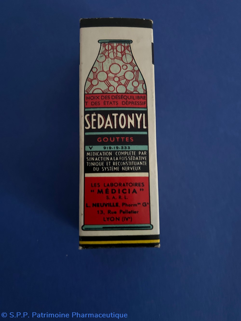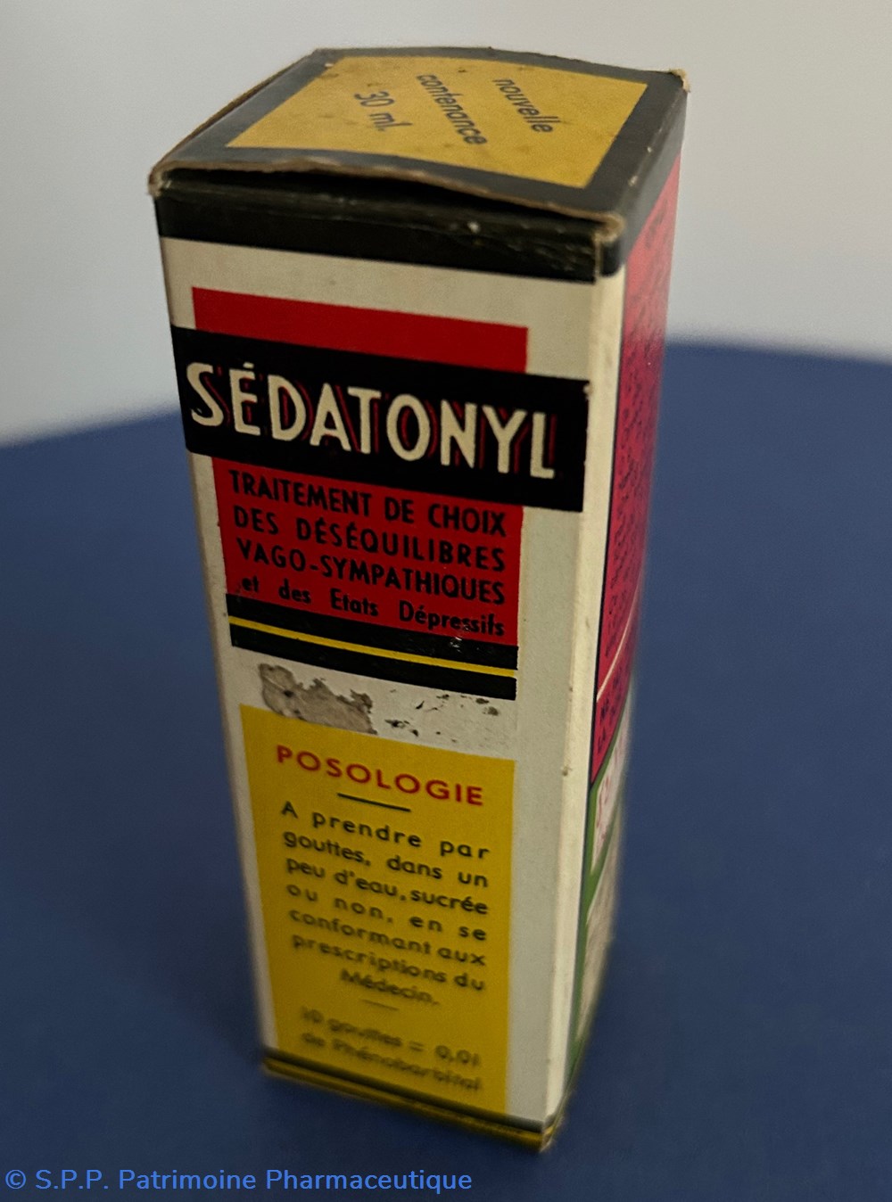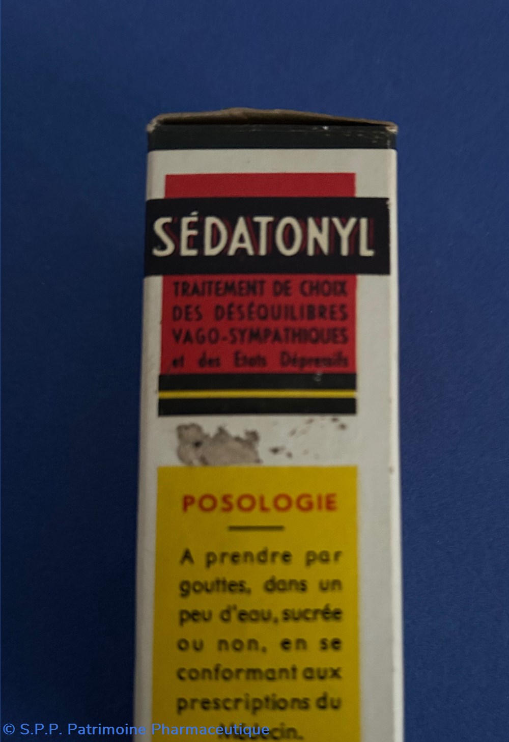 Petite boîte en carton de forme parallélépipèdique imprimée sur toutes les faces. A l'intérieur un flacon compte gouttes avec des traces foncées sur les parois. Egalement une notice d'utilisation et un emballage de carton ondulé de protection pour le flacon.