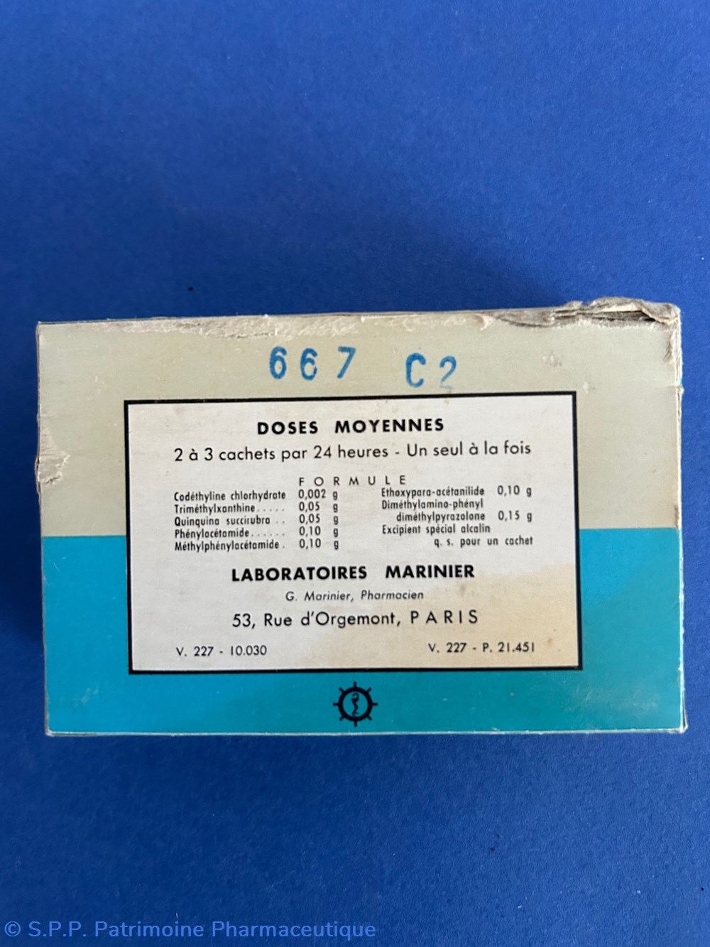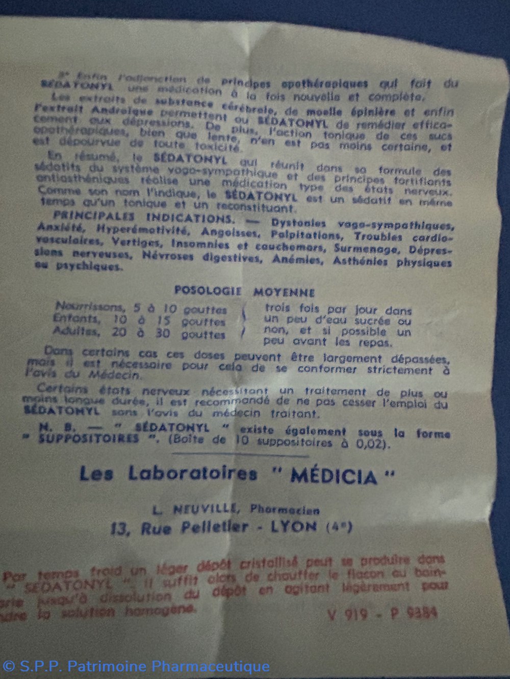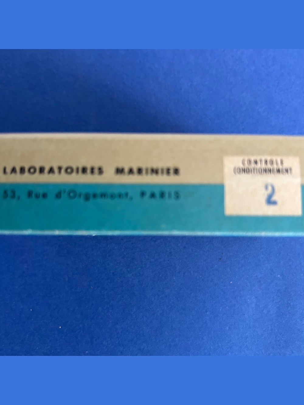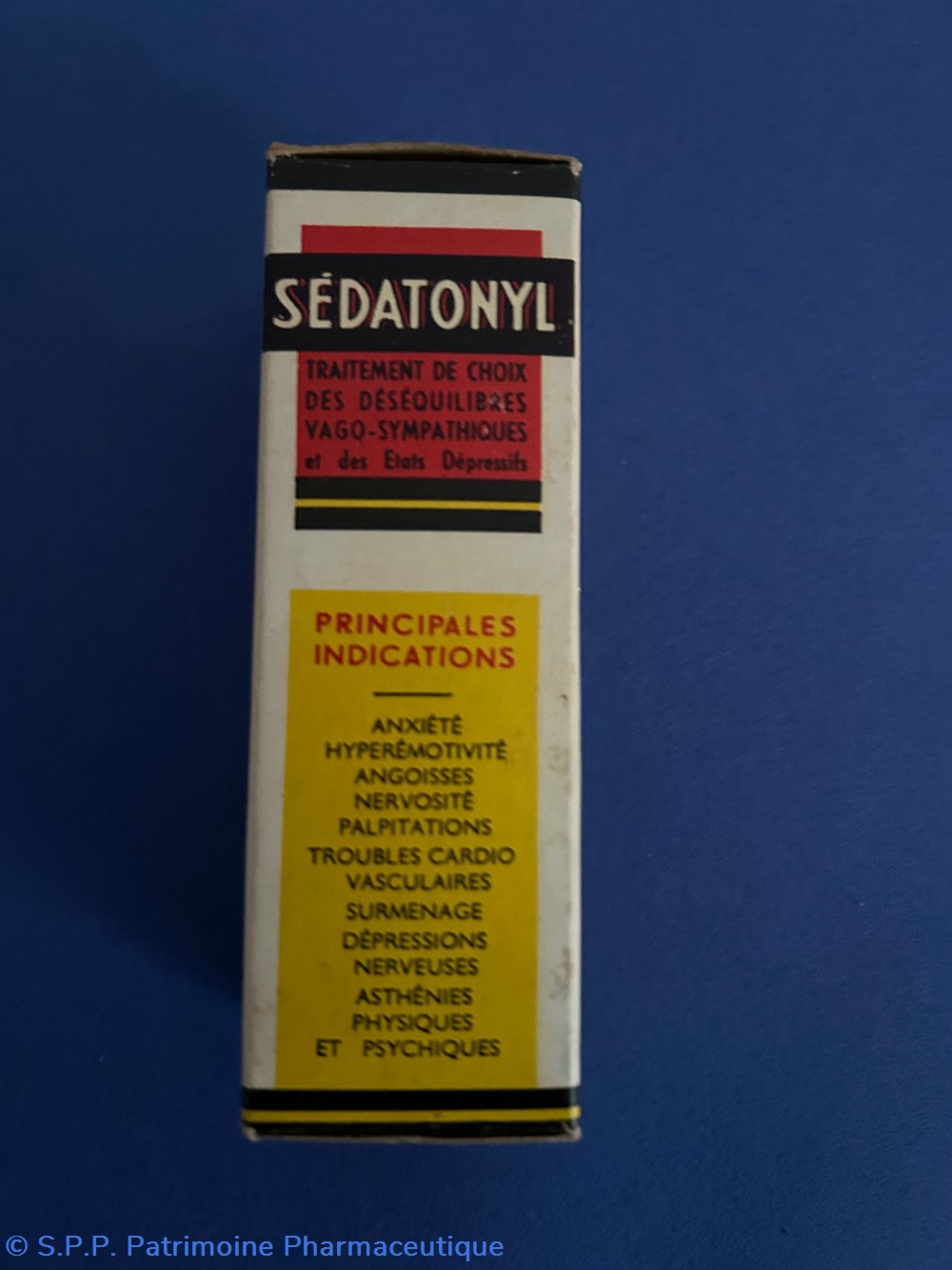 Petite boîte en carton de forme parallélépipèdique imprimée sur toutes les faces. A l'intérieur un flacon compte gouttes avec des traces foncées sur les parois. Egalement une notice d'utilisation et un emballage de carton ondulé de protection pour le flacon.