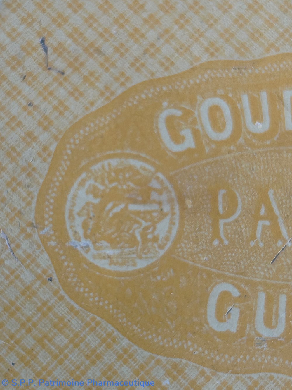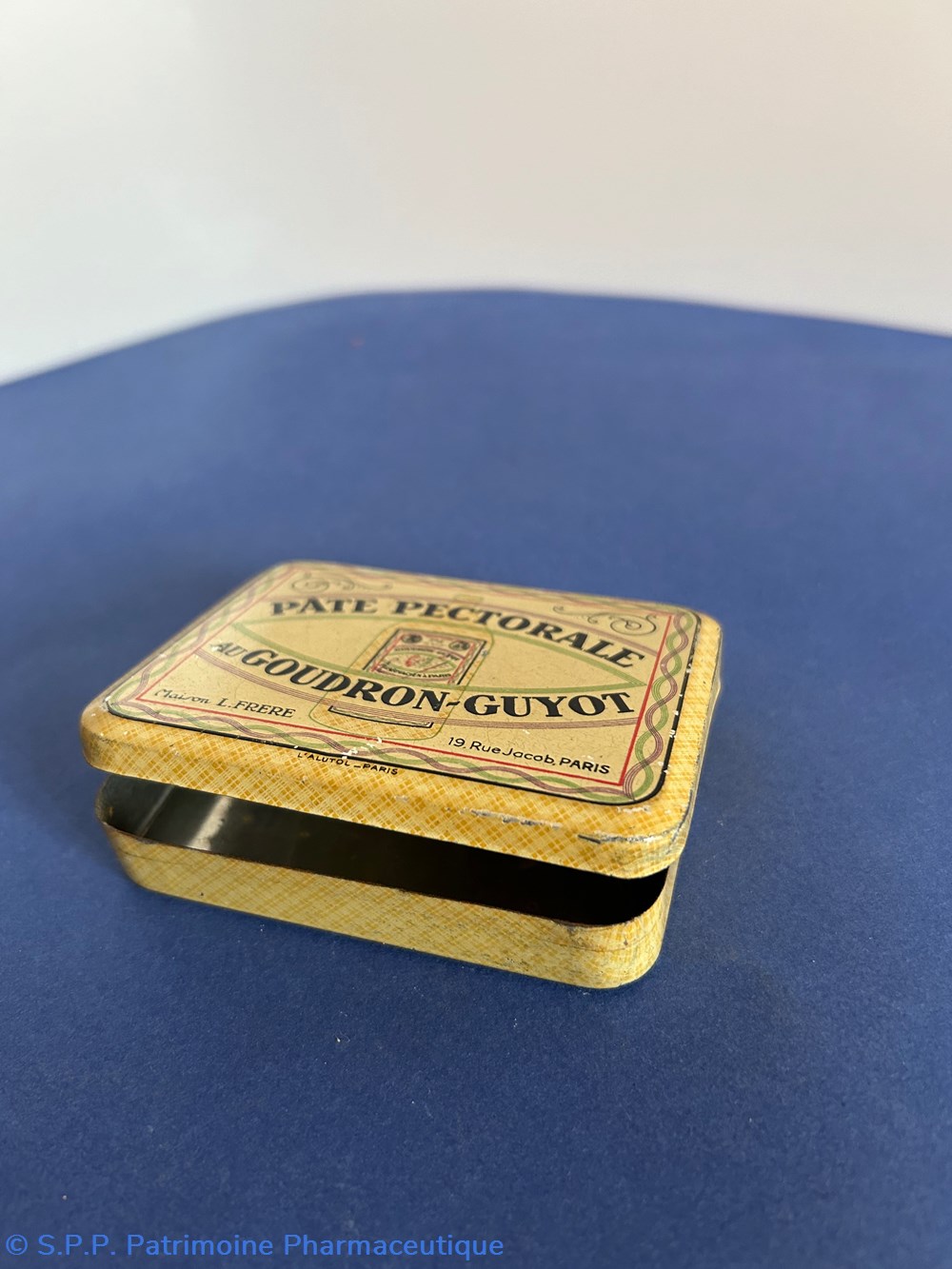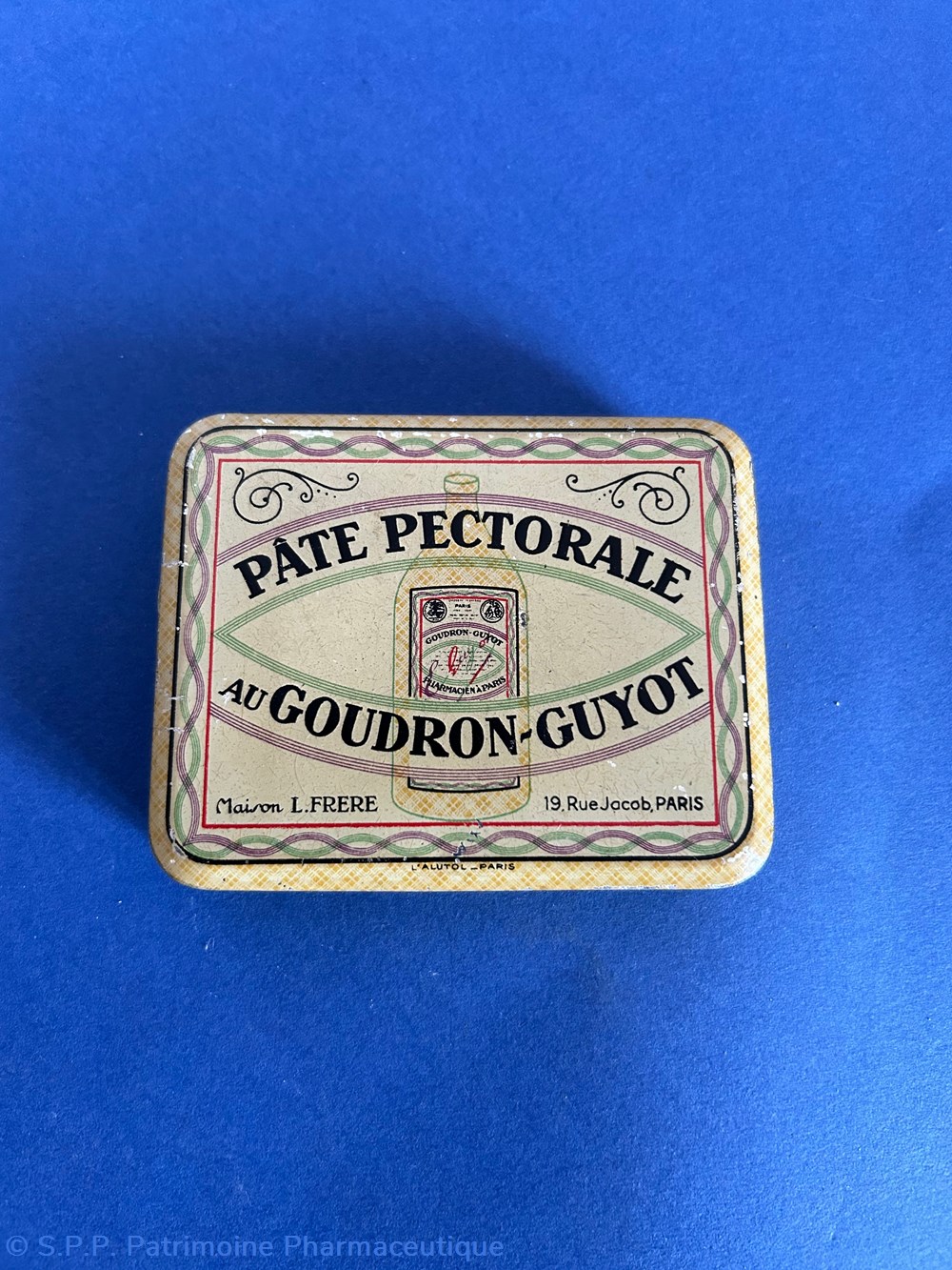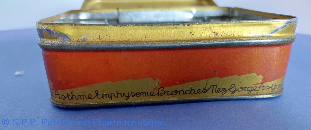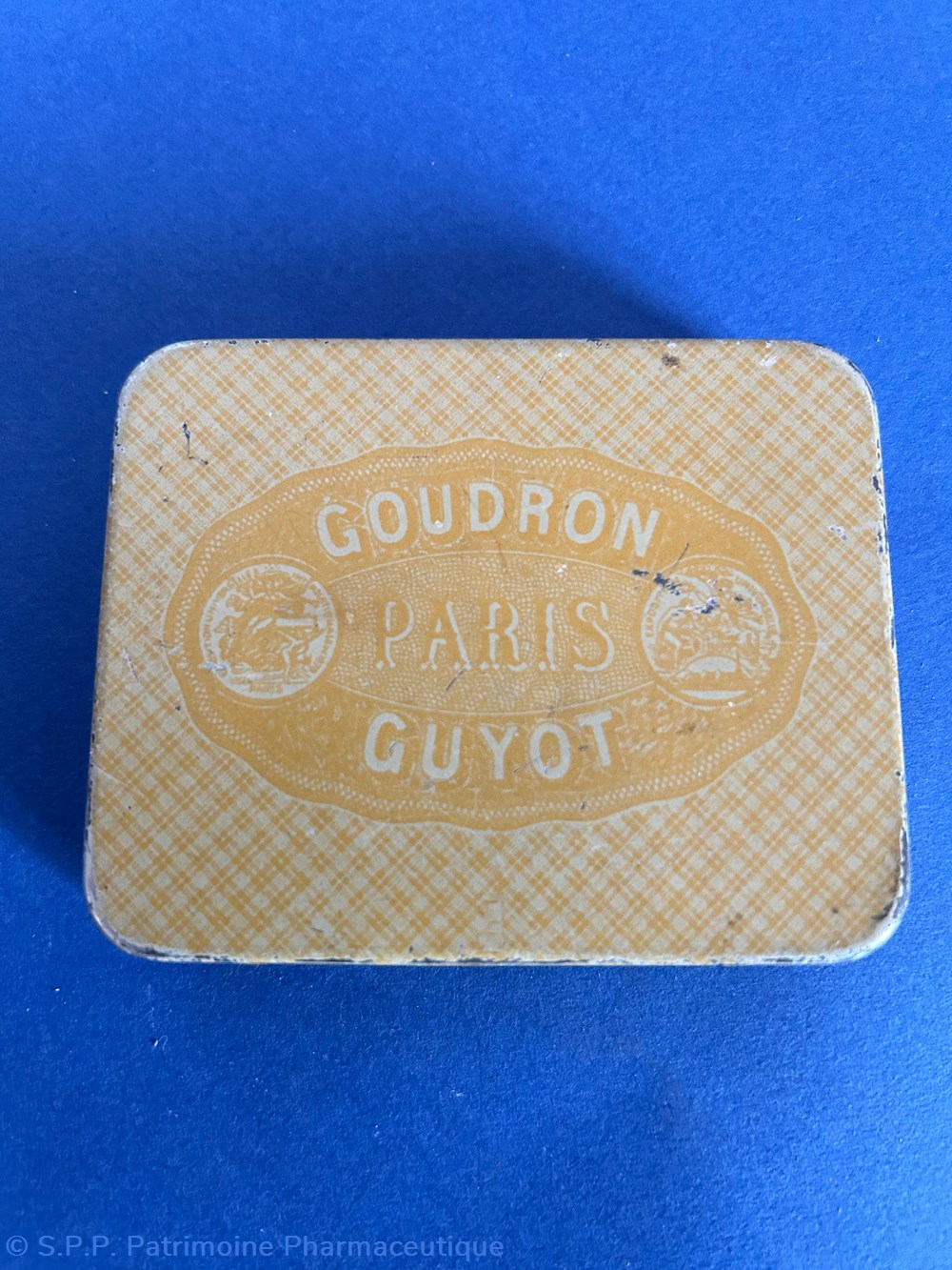 Petite boîte métallique de forme parallelepipèdique avec couvercle inséré. Sur le couvercle est imprimé le nom de la spécialité et du fabricant ave de nombreuses ornementtations. Sur le verso est imprimé un rappel du Goudron Guyot avec des médailles . Boîte vide.