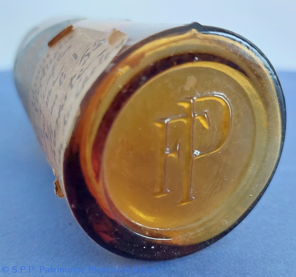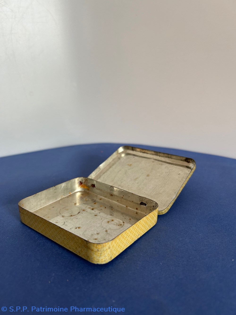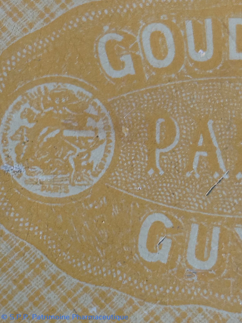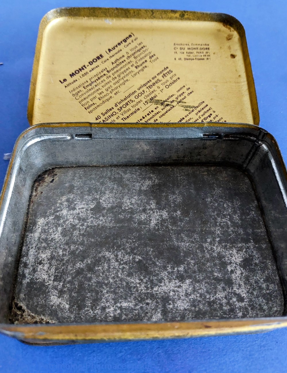 Petite boîte métallique de forme parallelepipèdique avec couvercle inséré. Sur le couvercle est imprimé le nom de la spécialité et du fabricant ave de nombreuses ornementtations. Sur le verso est imprimé un rappel du Goudron Guyot avec des médailles . Boîte vide.