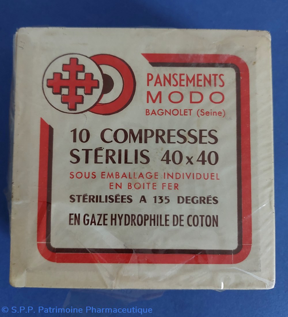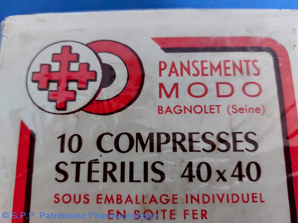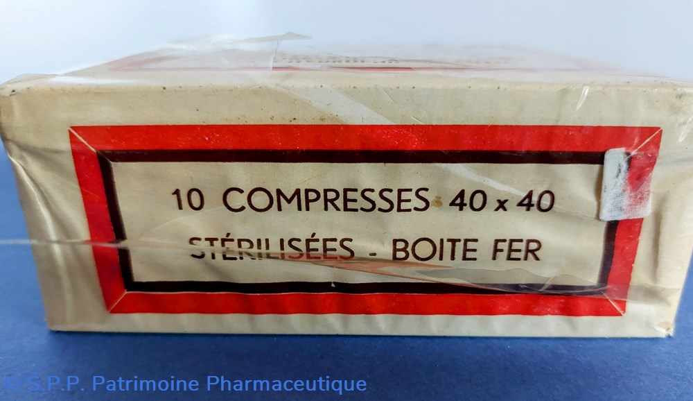 Boîte métallique sous emballage d'origine forme parallélépipèdique 17,5*12,5 H et 4,5 cm. Boîte contenant 10 Compresses 40*40 stérilisées à 135 degrés en gaze hydrophile de coton