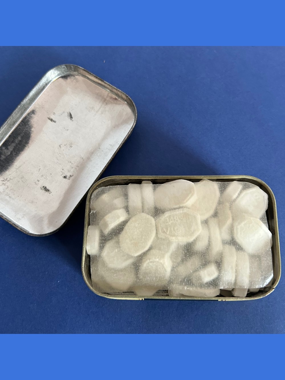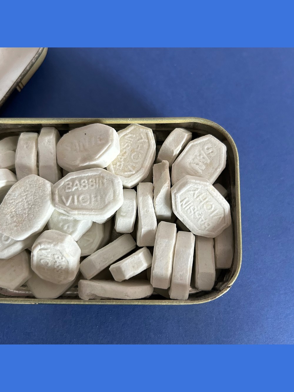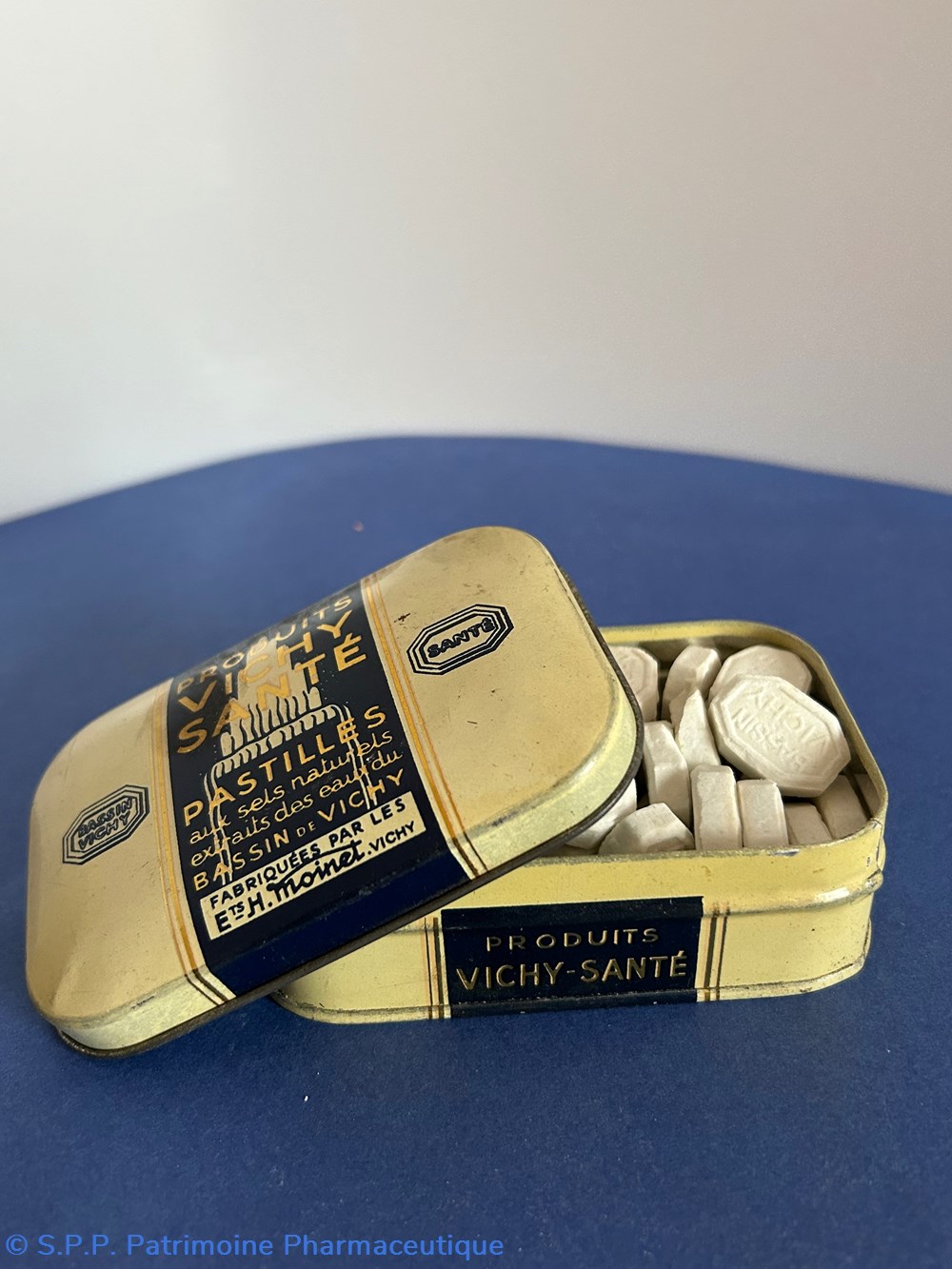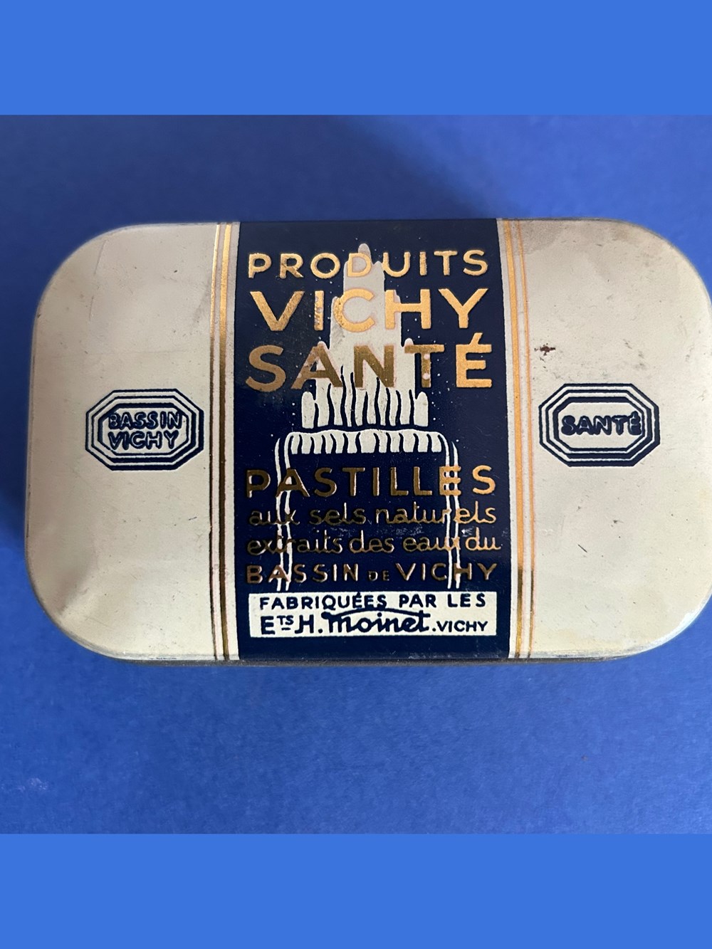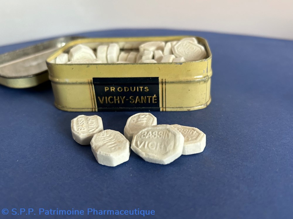 Boîte métallique de format parallélépipèdique avec couvercle emboîté. Sur le couvercle est imprimé le nom générique de la marque.Sur le verso est indiqué le nom du fabricant : H. Moinet La boîte est remplie de pastilles qui sont protégées par une feuille de cellophane. Les pâstilles sont marquées : Bassin Vichy.