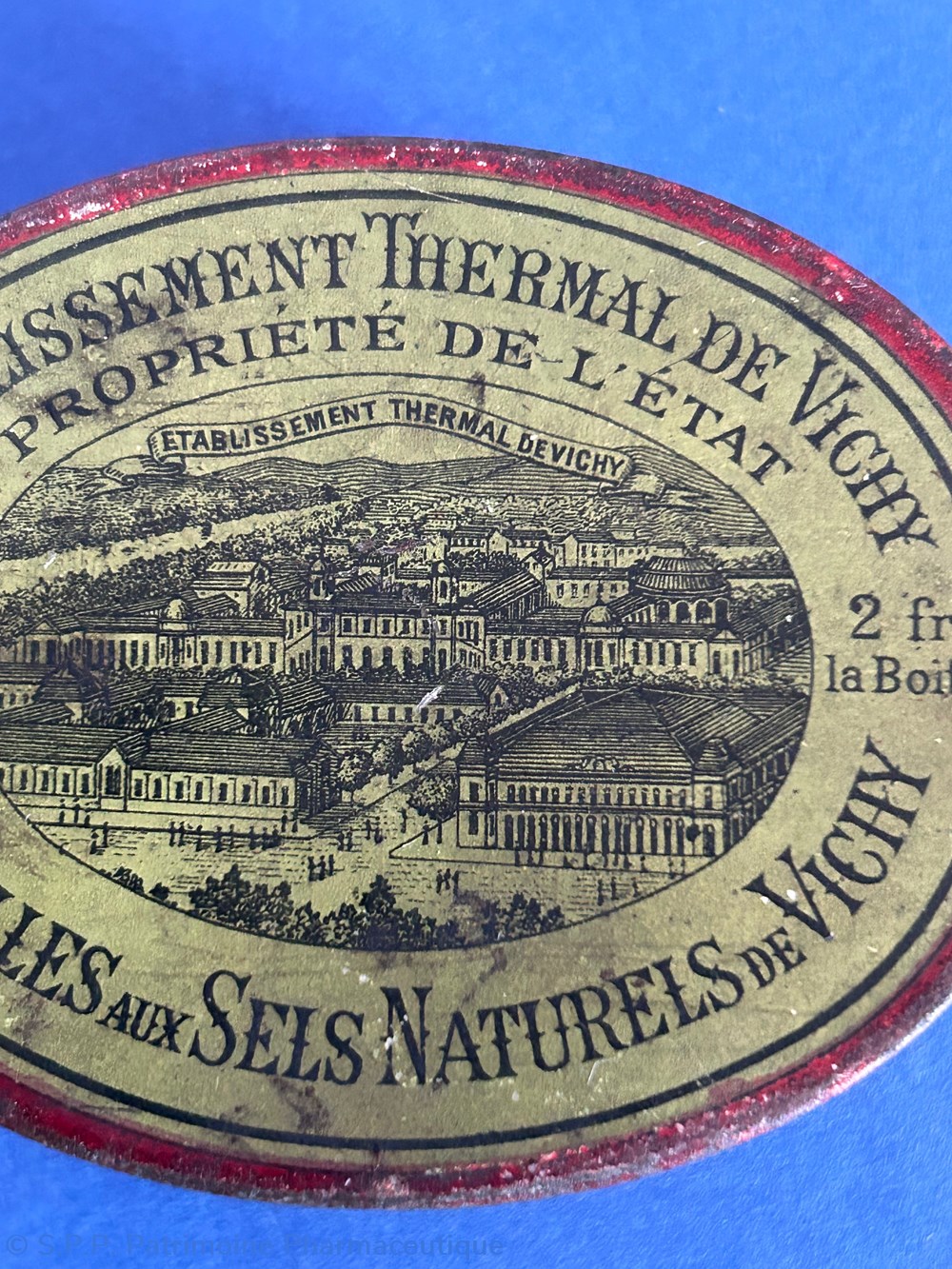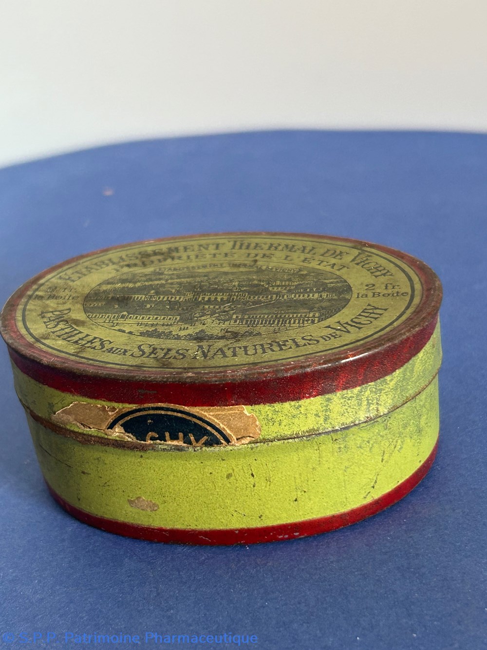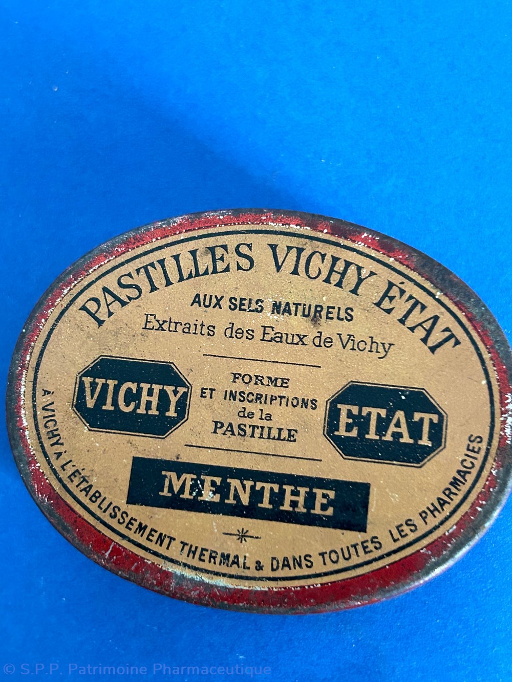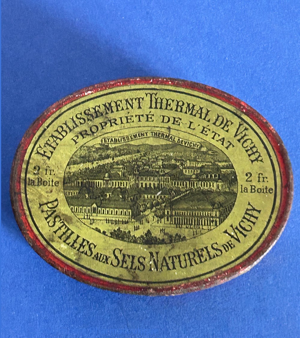 Petite boîte ovale en métal. Sur le couvercle provenance et nature du contenu avec le dessin de l'établissemsnt thermal de Vichy.