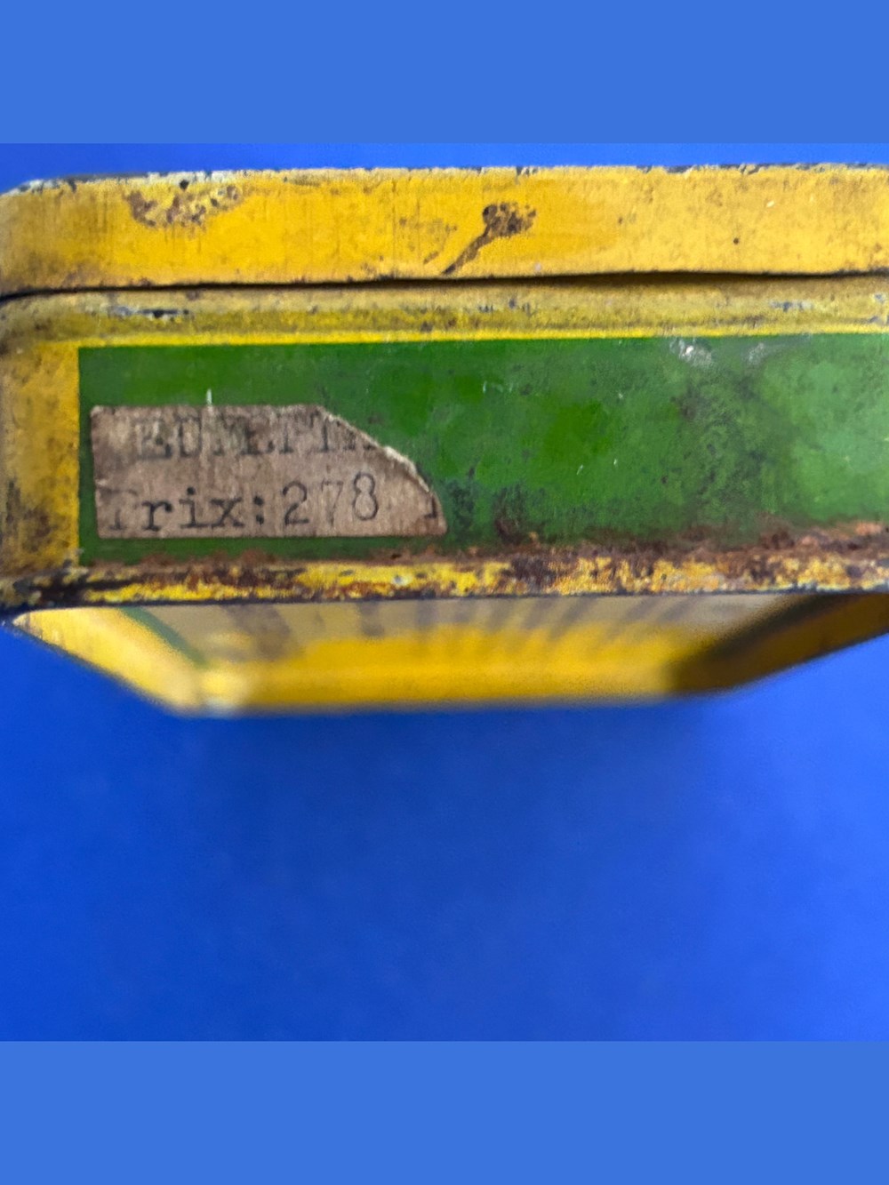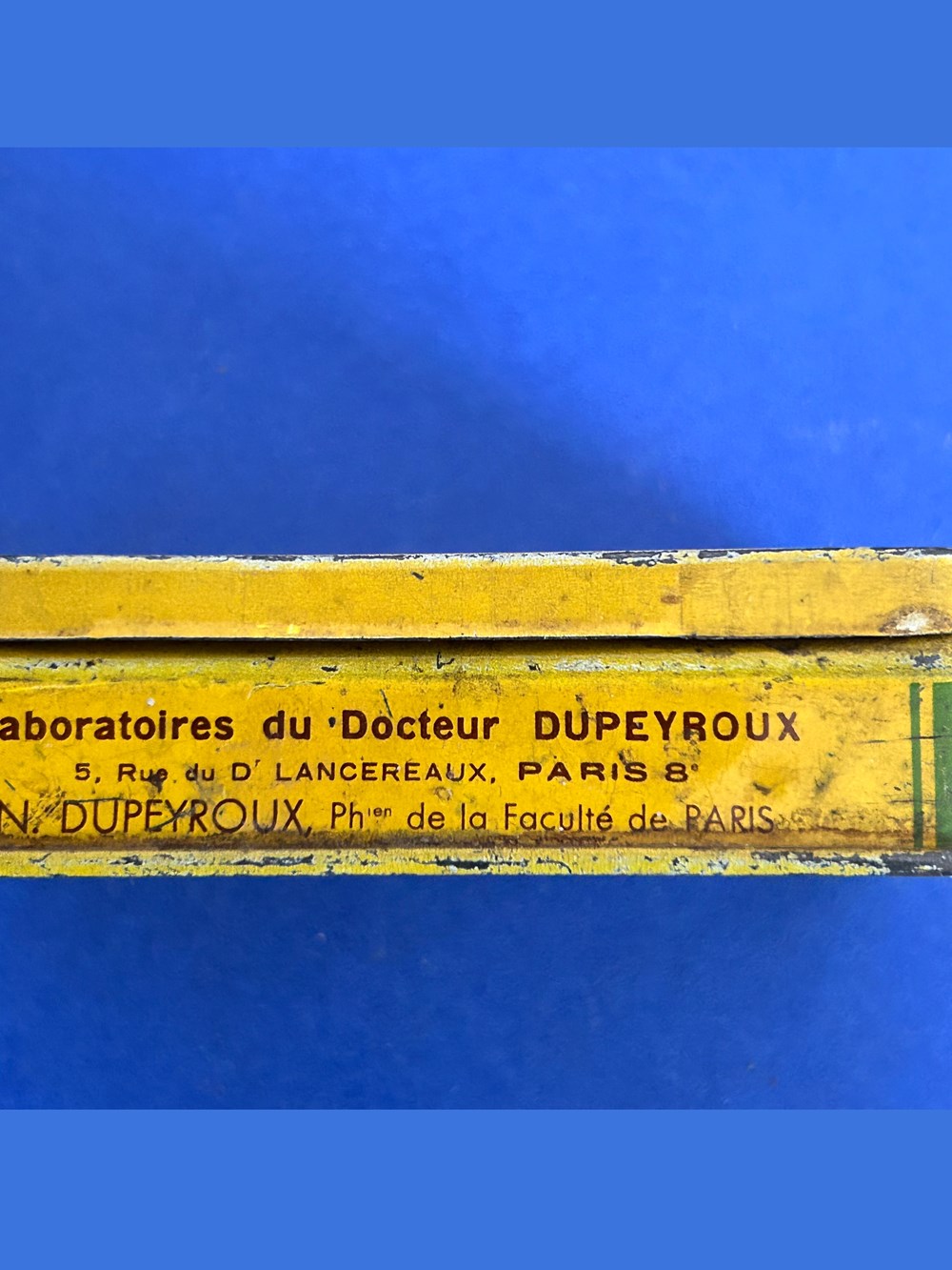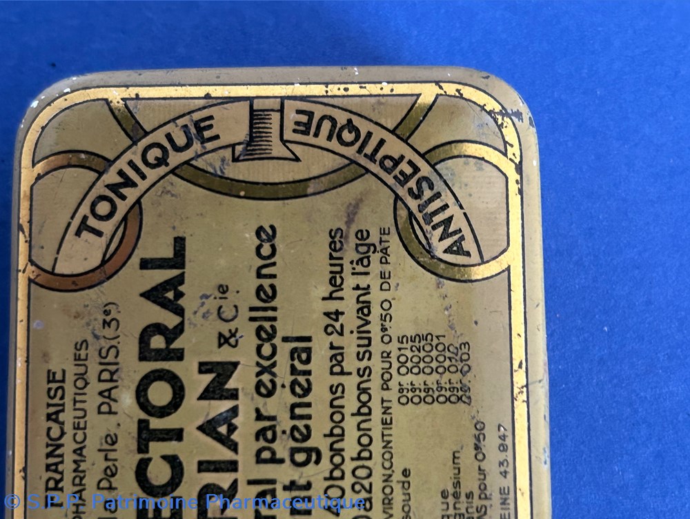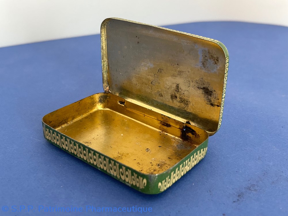 Petite boîte métallique parallelépipèdique avec des ornementations dorées.Le couvercle inséré comporte les inscriptions générales et la formule du médicament.