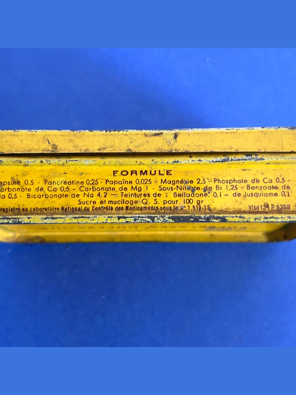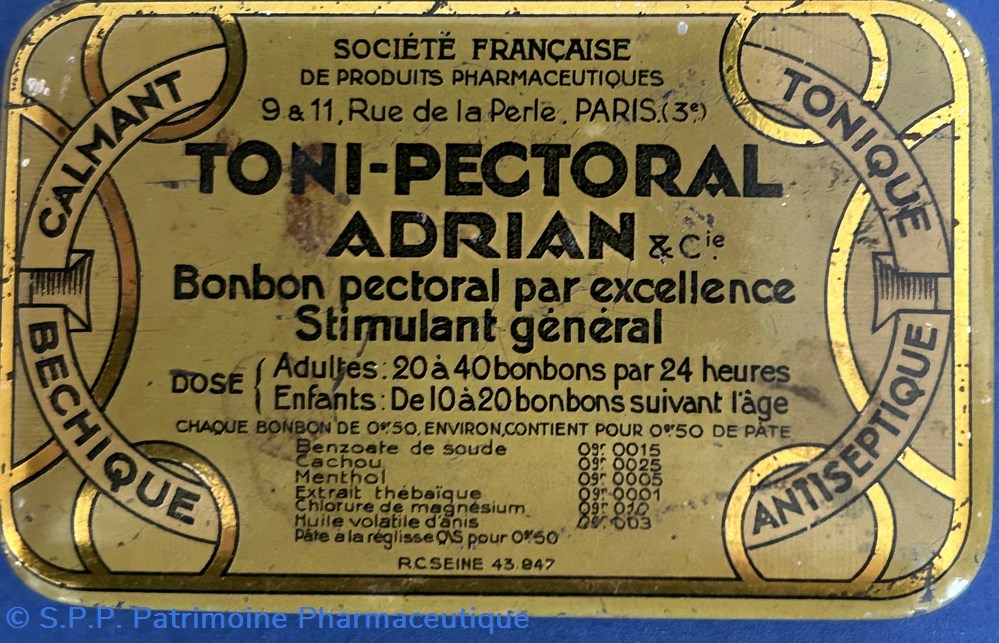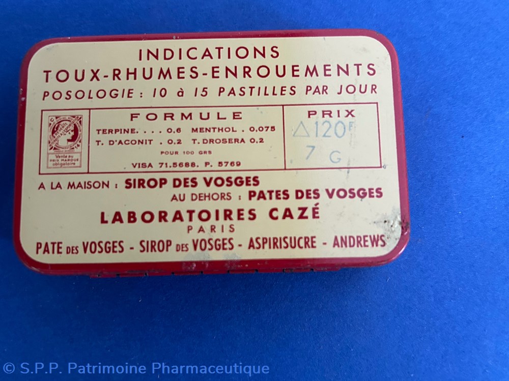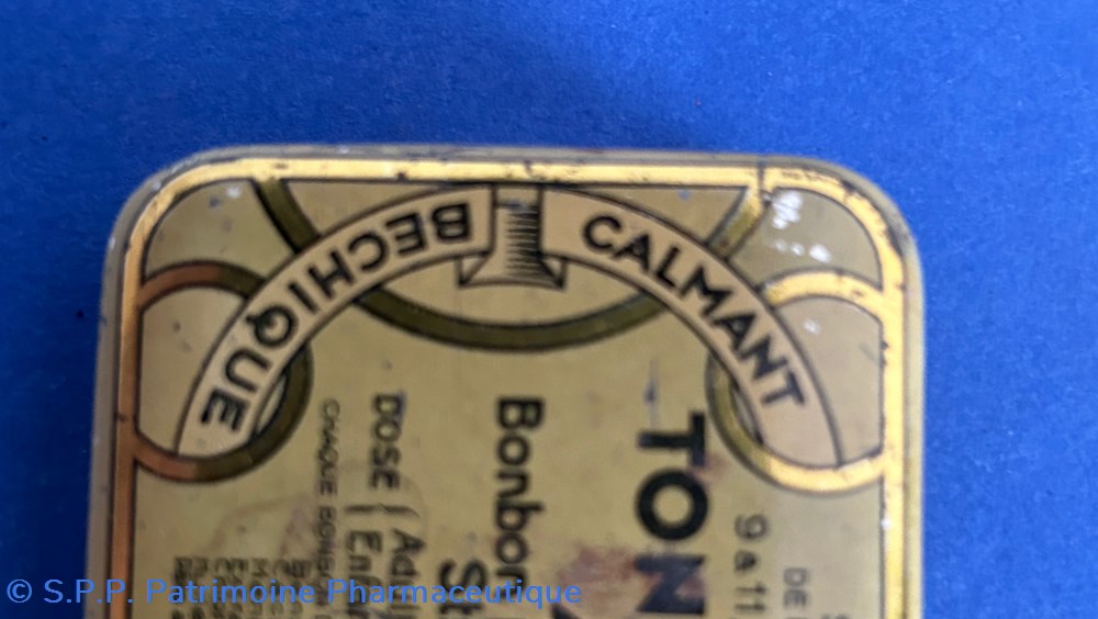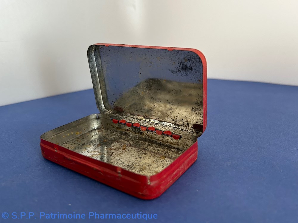 Petite boîte métallique de forme parallèlepipèdique. avec couvercle emboité. Sur le couvercle est imprimé le nom du médicament ainsi que les indications. Sue le verso est imprimé le mode d'emploi. Sur la tranche de face est imprimée la formule. Une petite étiquette est collée sur le côté pour indiquer le prix.