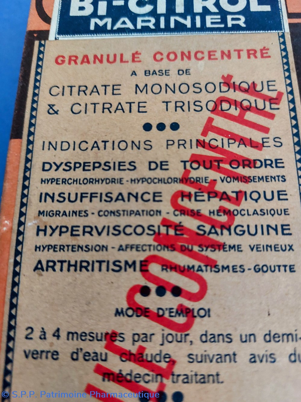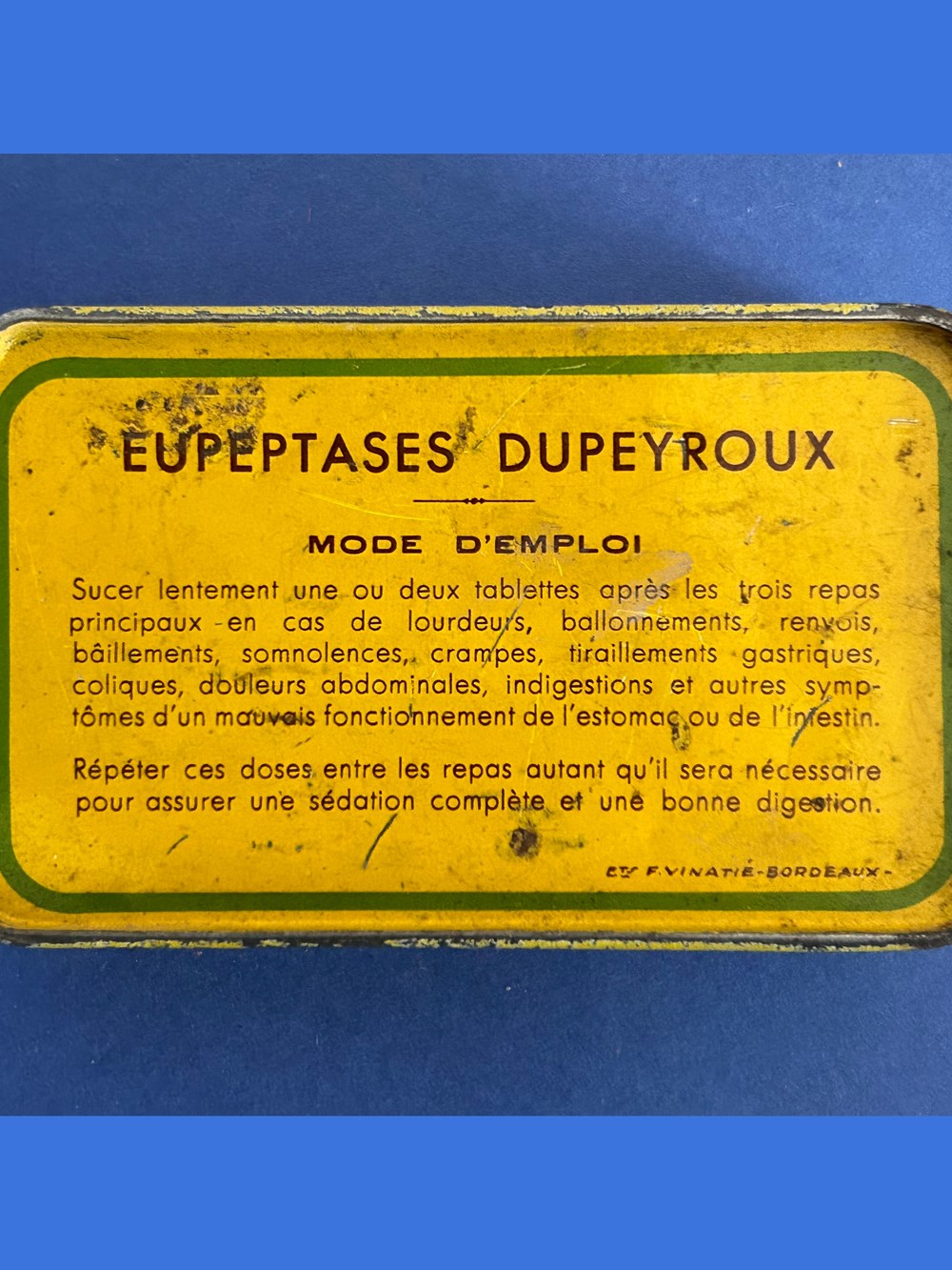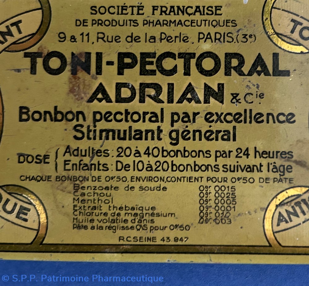 Petite boîte métallique de forme parallèlepipèdique. avec couvercle emboité. Sur le couvercle est imprimé le nom du médicament ainsi que les indications. Sue le verso est imprimé le mode d'emploi. Sur la tranche de face est imprimée la formule. Une petite étiquette est collée sur le côté pour indiquer le prix.