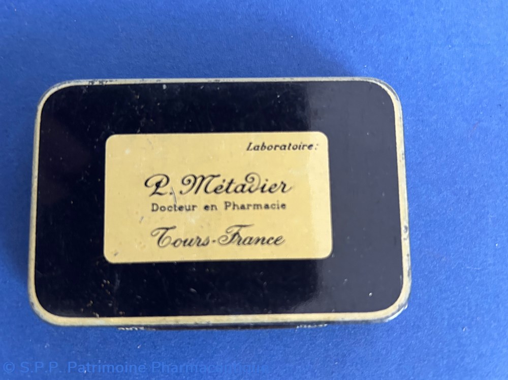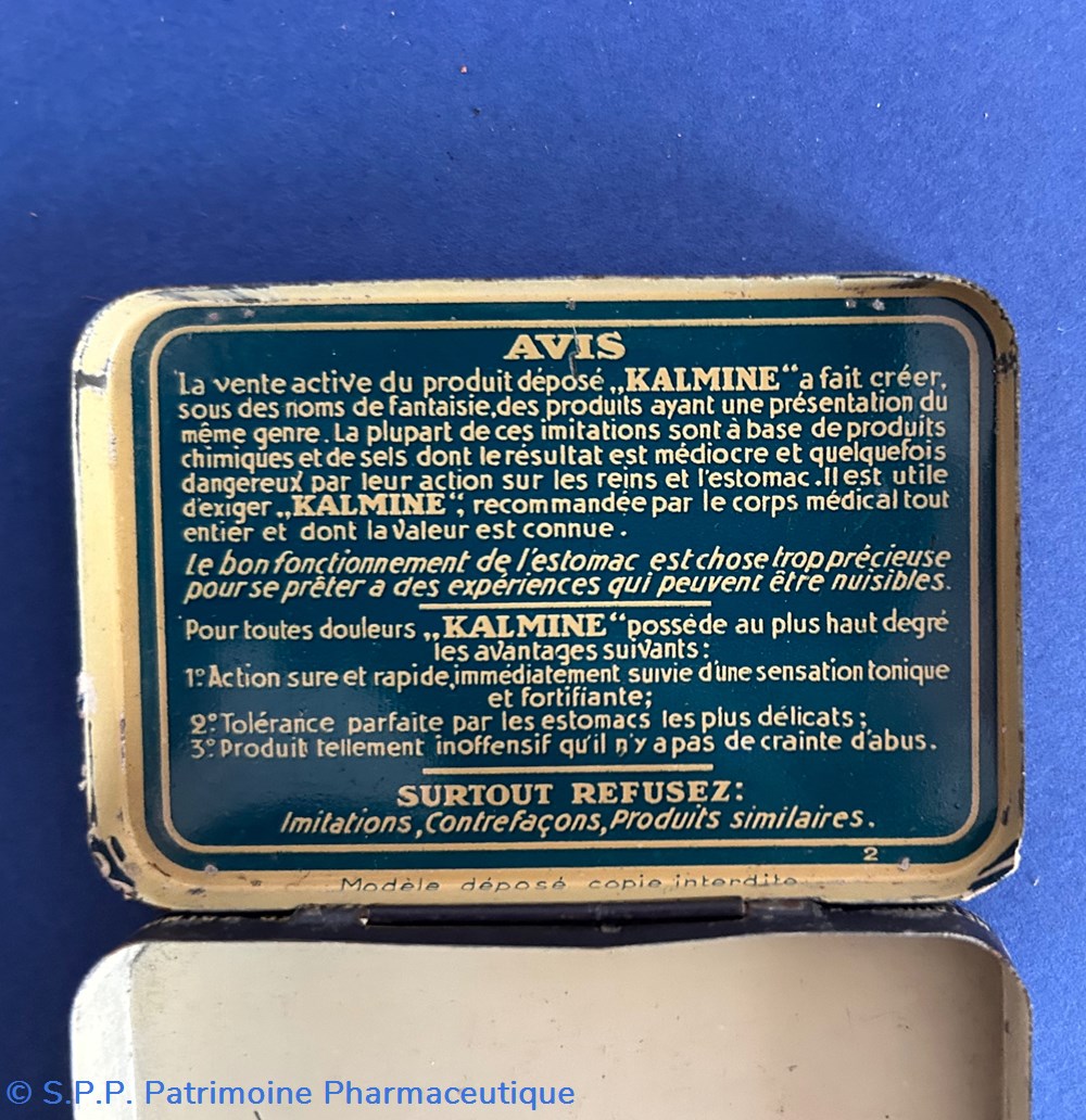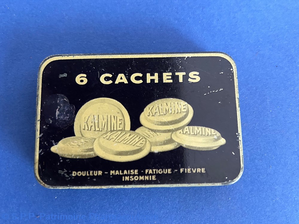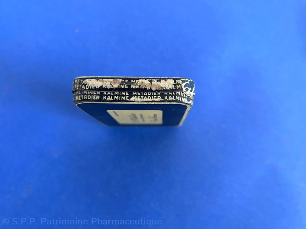 Très petite boite métallique avec couvercle inséré. Le couvercle porte la mention de 6 cachets avec le dessin des cachets portant la dénomination Kalmine et les indications du médicament. Le verso porte la marque du fabricant : P. Métadier à Tours.. Une frise entoure le pourtour de la boite "Kalmine Métadier"