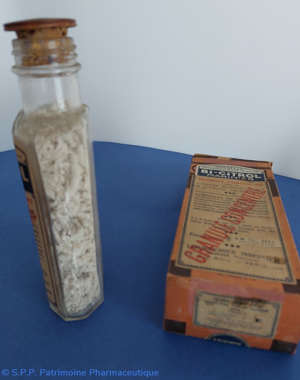 Flacon en verre transparent H17 cm base 6,2 *3,2 cm contenant des granulés blancs à base de citrate monosodique et citrate trisodique.