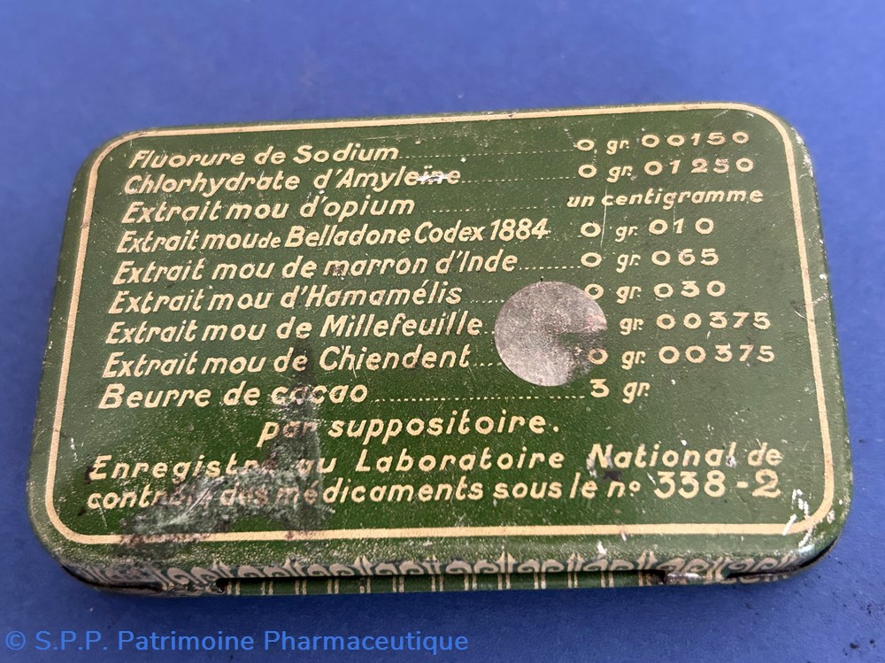 Petite boîte en métal de forme parallelepipèdique avec couvercle inséré. portant la marque et l'origine du contenu. Sur le verso est imprimé la formule du suppositoire. Boîte verte et blanche vide.
