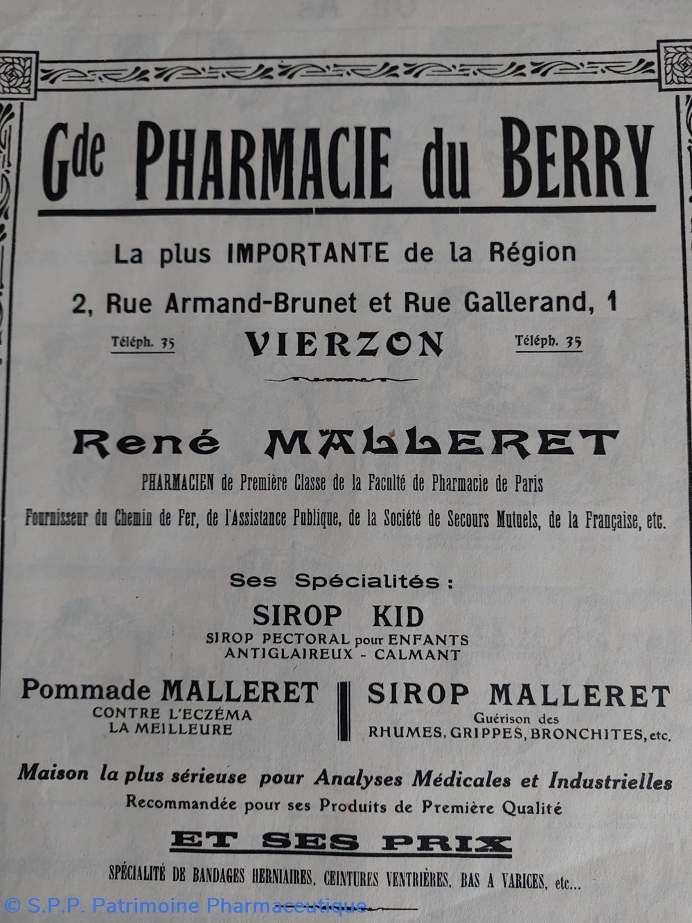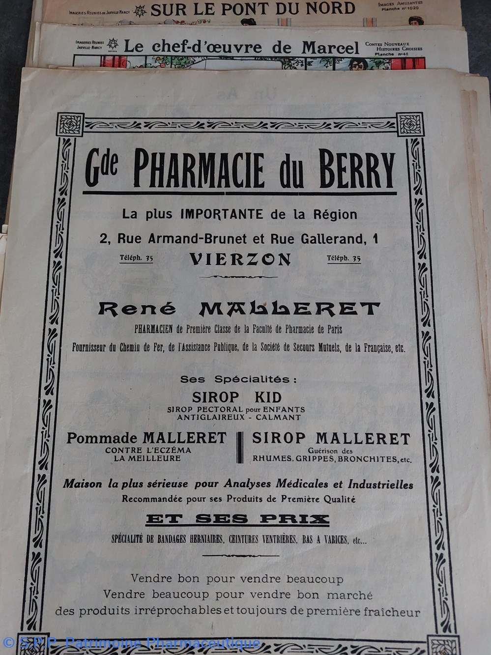 Au verso les références et spécialités de la Grande Pharmacie du Berry René Malleret à la Vierzon