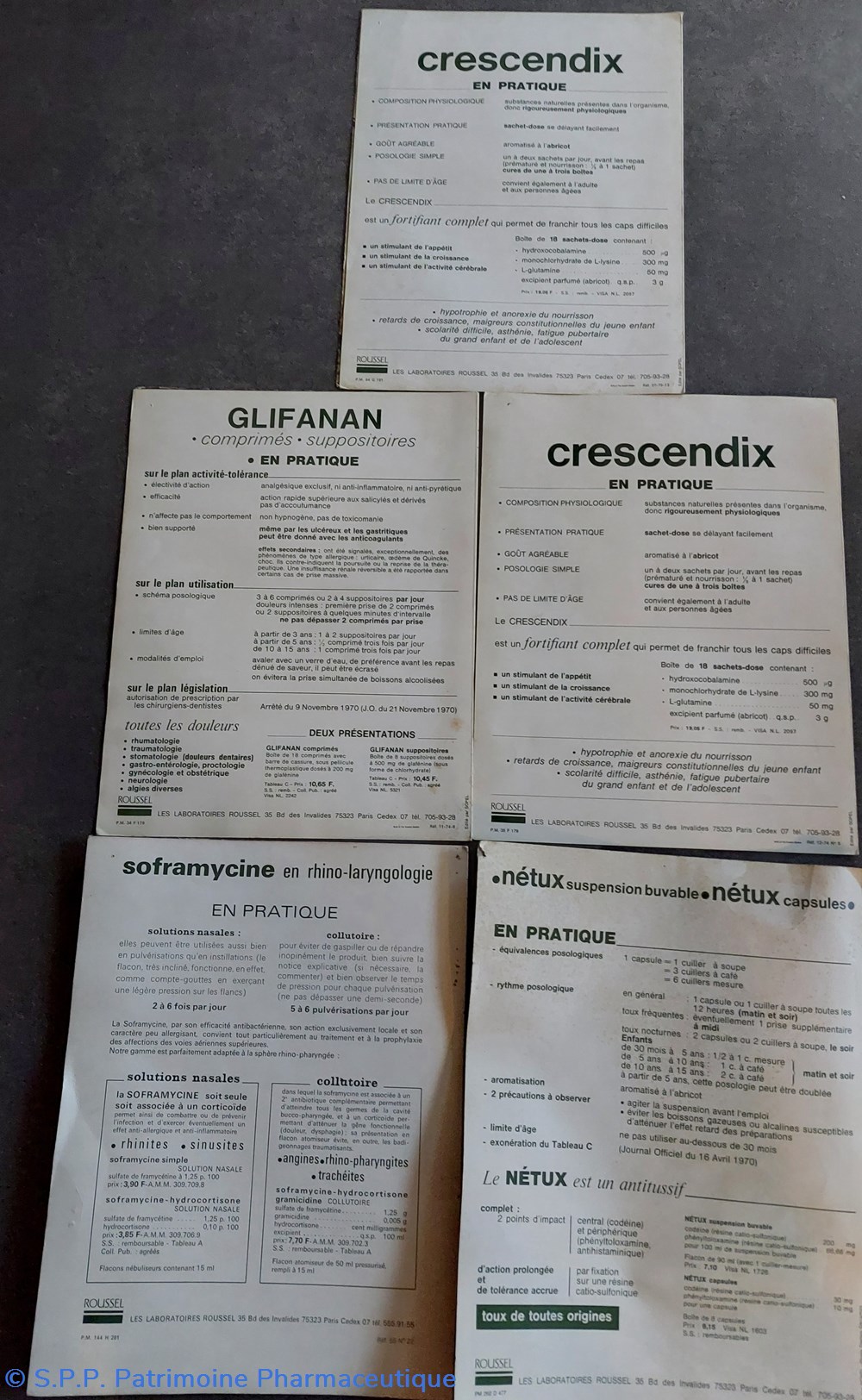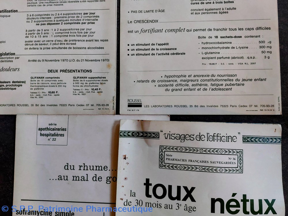 Chaque plaquette de 4 pages présente en double page une photo couleur d'une apothicairerie ou d'une pharmacie "historique" . En première et dernière page des arguments et informations d'un médicament des Laboratoires ROUSSEL