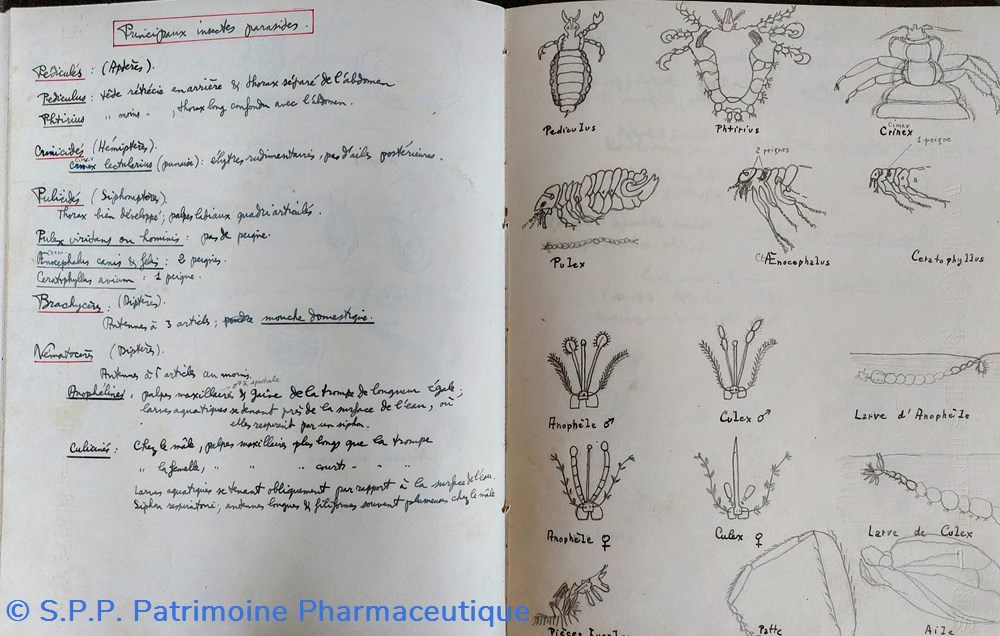 Notes détaillées (pages de gauche) et schémas ou dessins ( pages de droite). Travaux d'études sur des végétaux et des insectes.