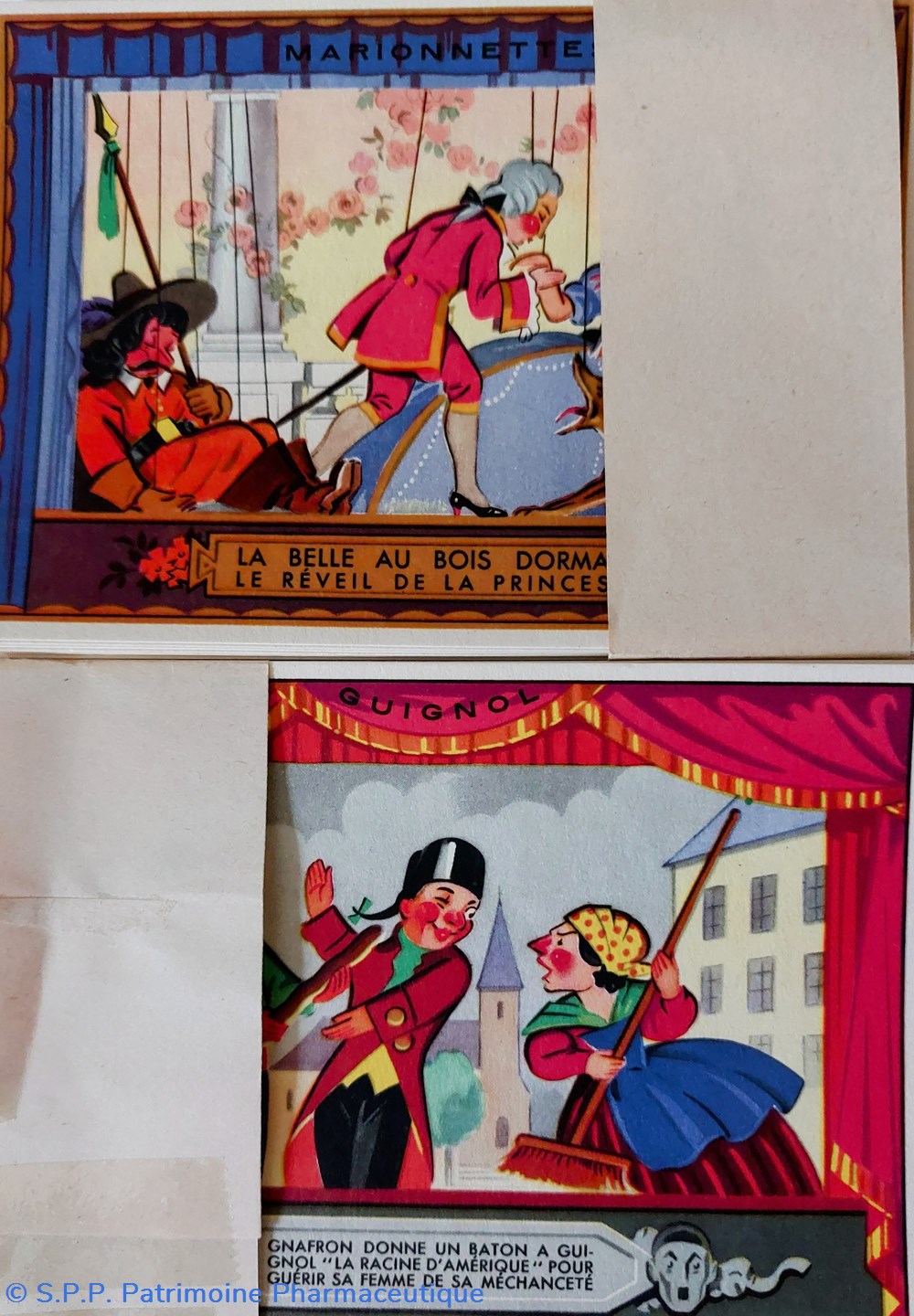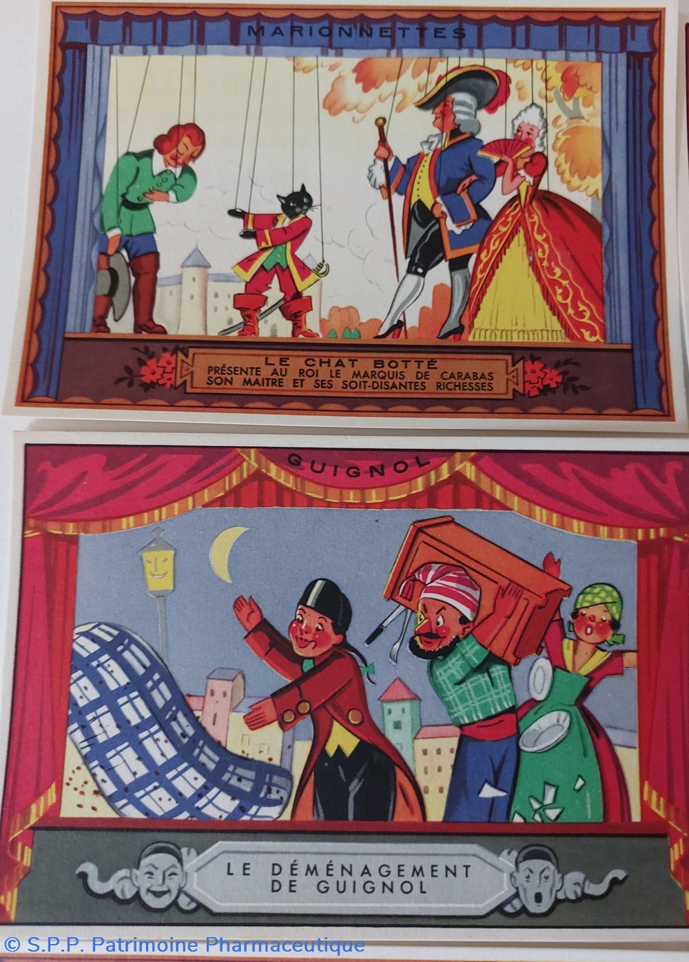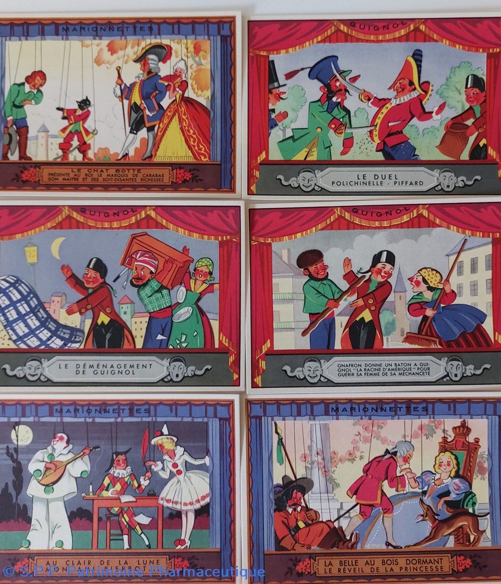Cartes en couleur de scènes de "Marionnettes Guignol" de collection au recto.