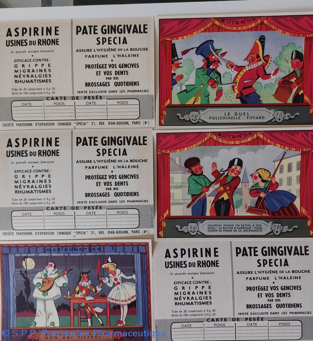 Le verso est destiné à PROMOUVOIR '' Aspirine Usines du Rhône et pâte Gingivale SPECIA. S'y ajoute une carte de pesée oooooôô9ho