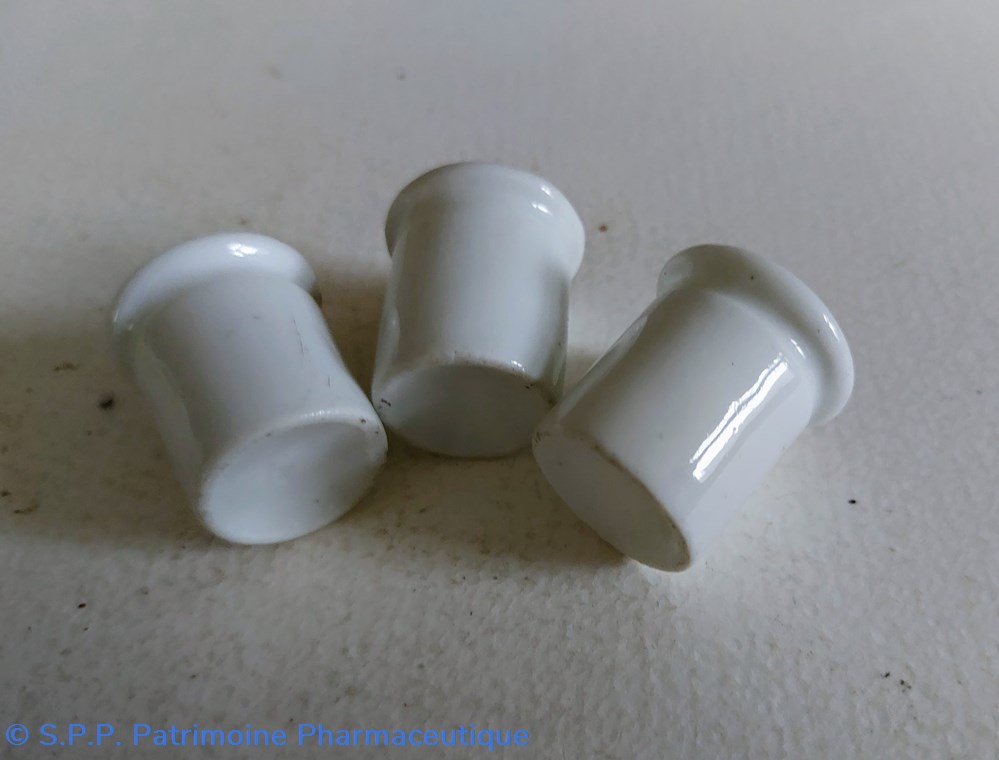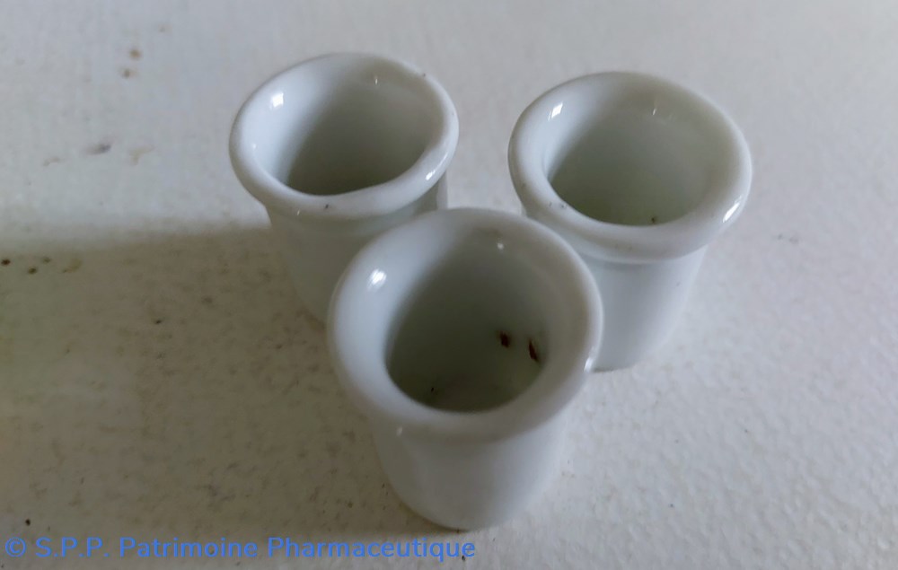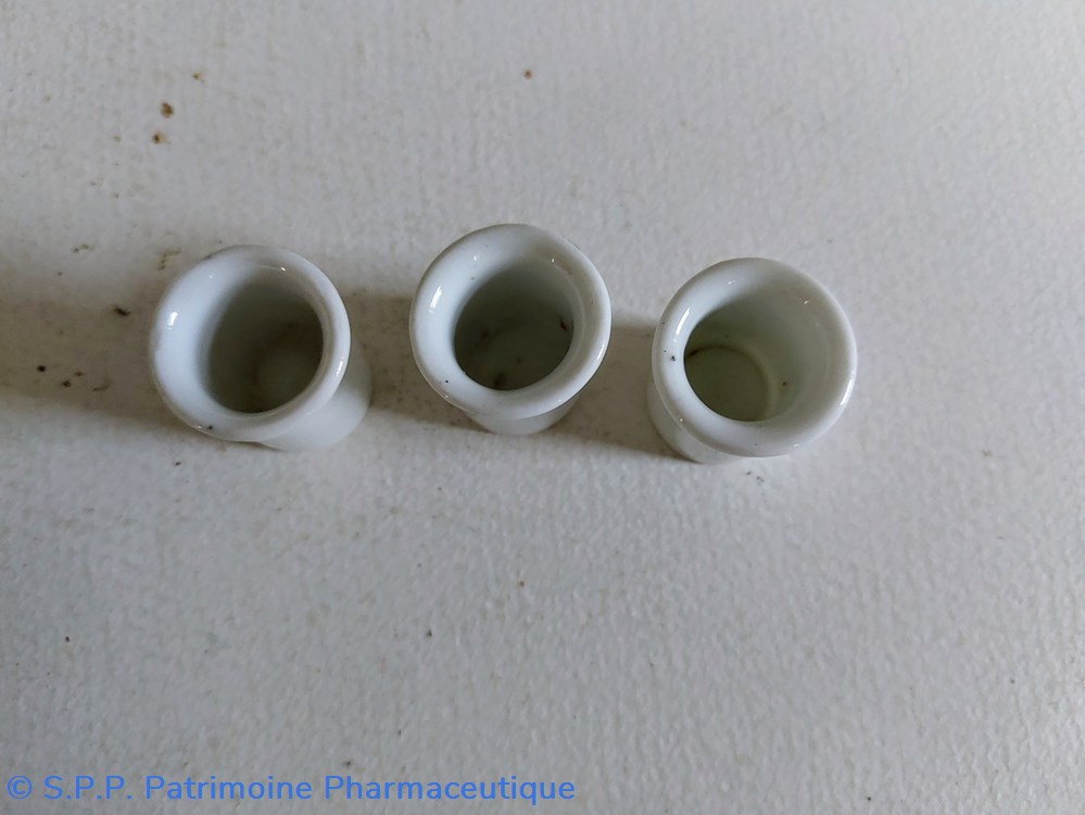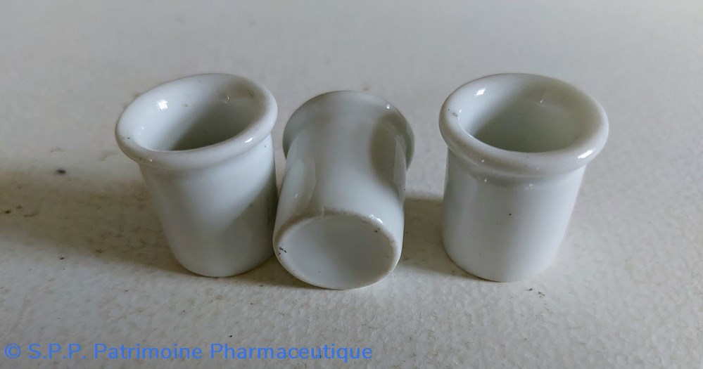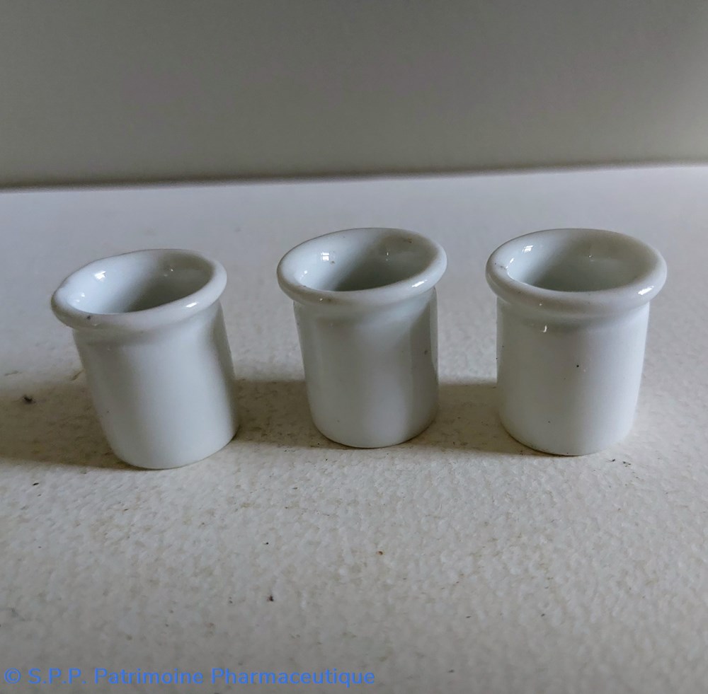Lot de trois très petits récipients en porcelaine de forme cylindrique provenant d'une pharmacie.