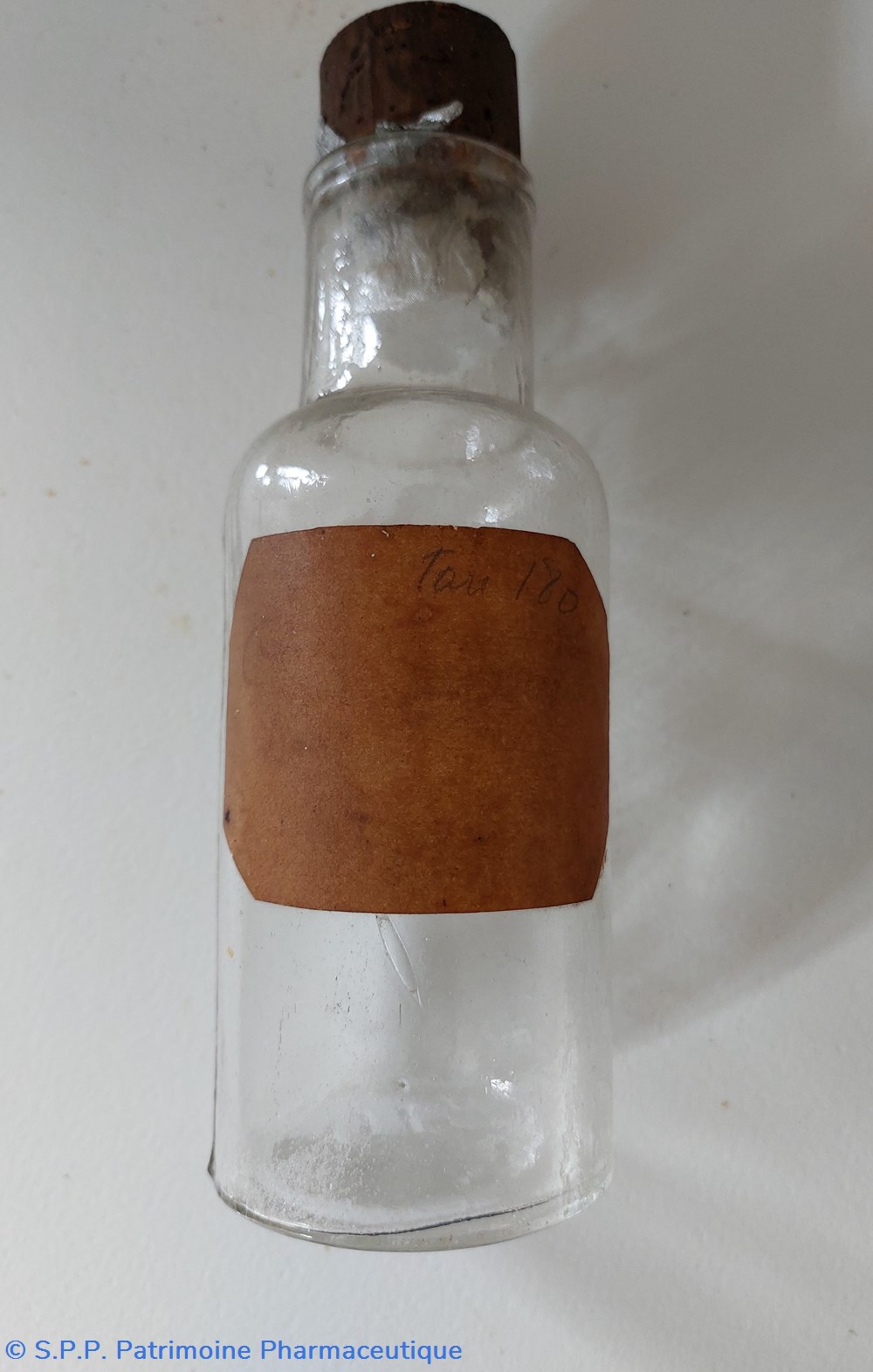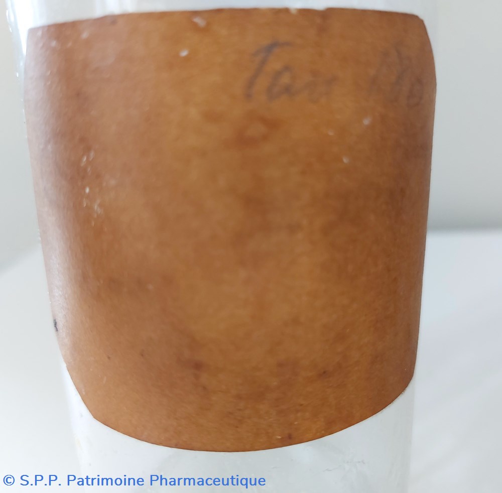 Flacon cylindrique contenant un liquide figé couleur caramel fermé avec un bouchon en liège.