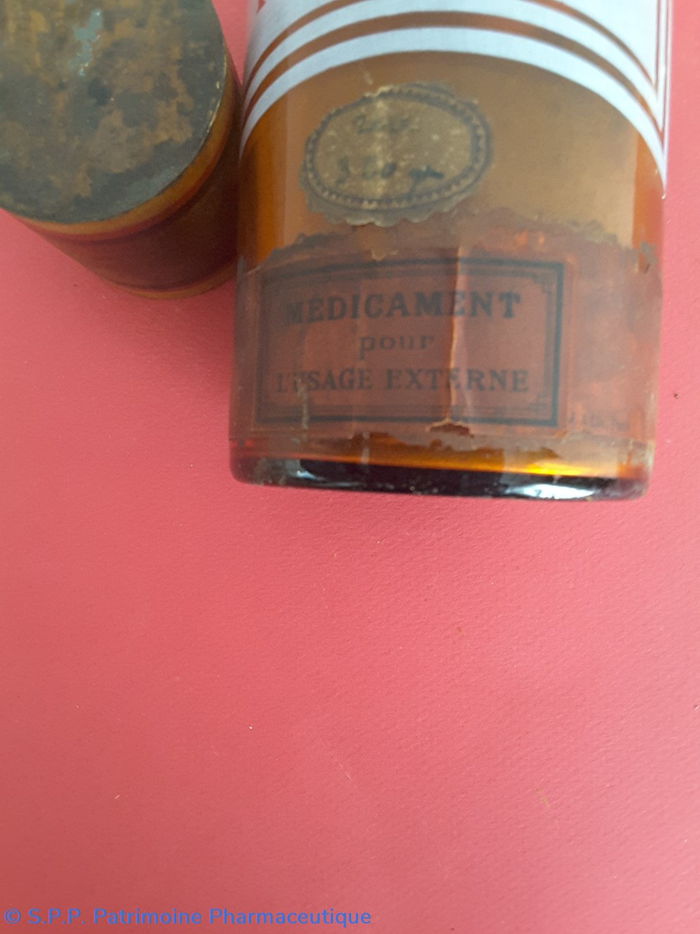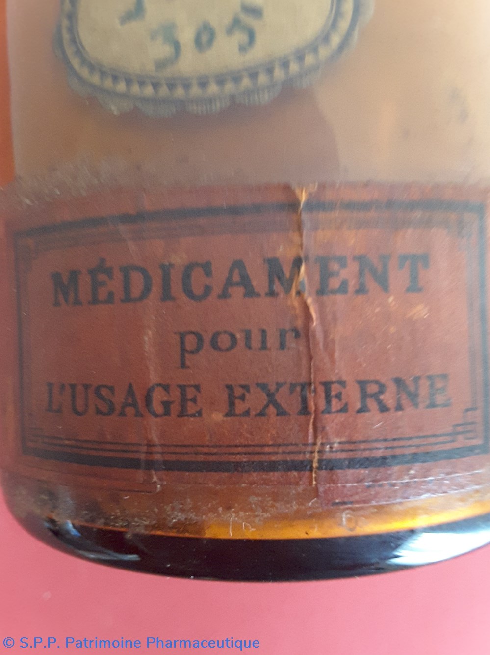 Mention TOXIQUE Médicament pour usage externe sur une étiquette collée à la base du flacon