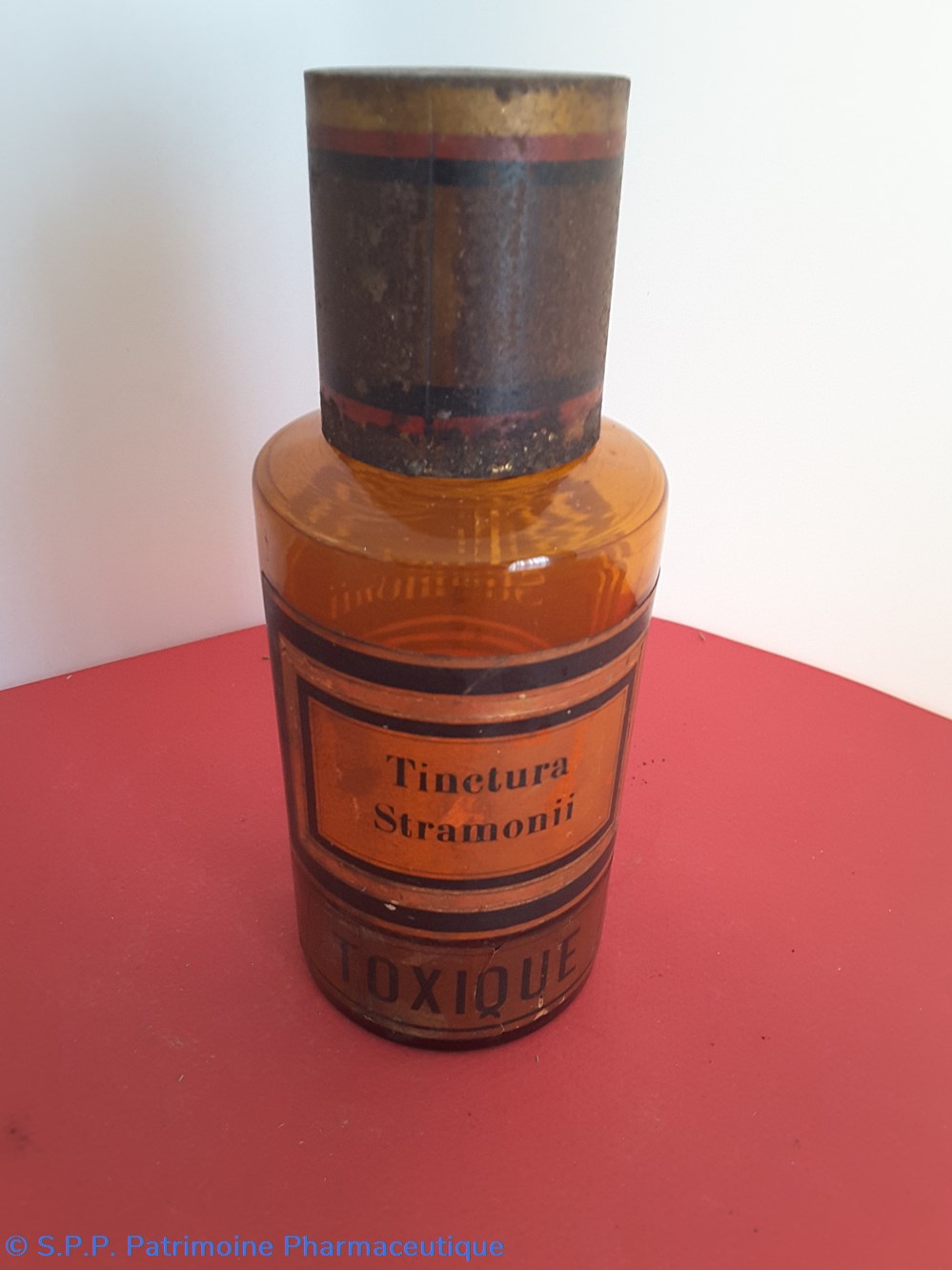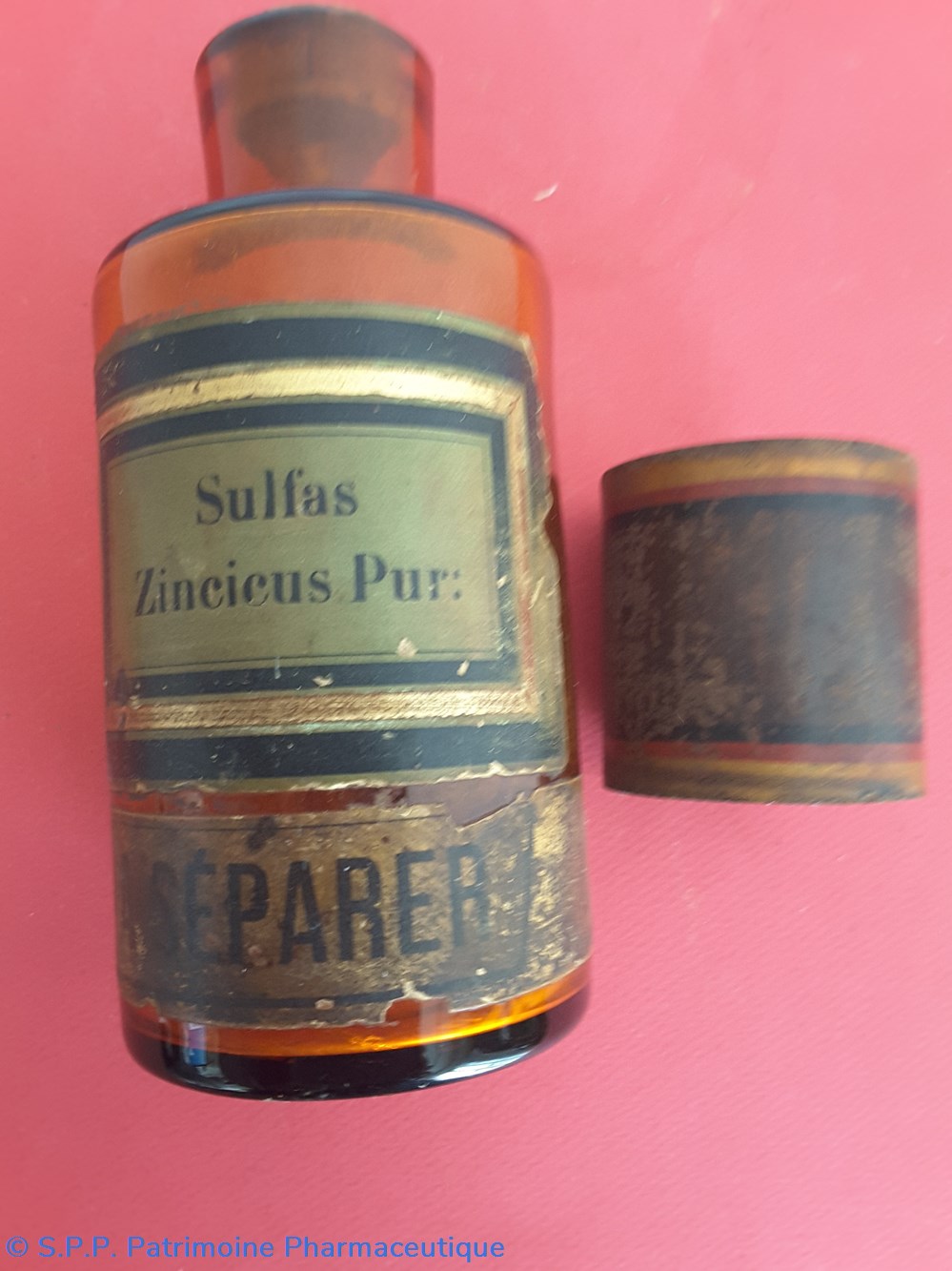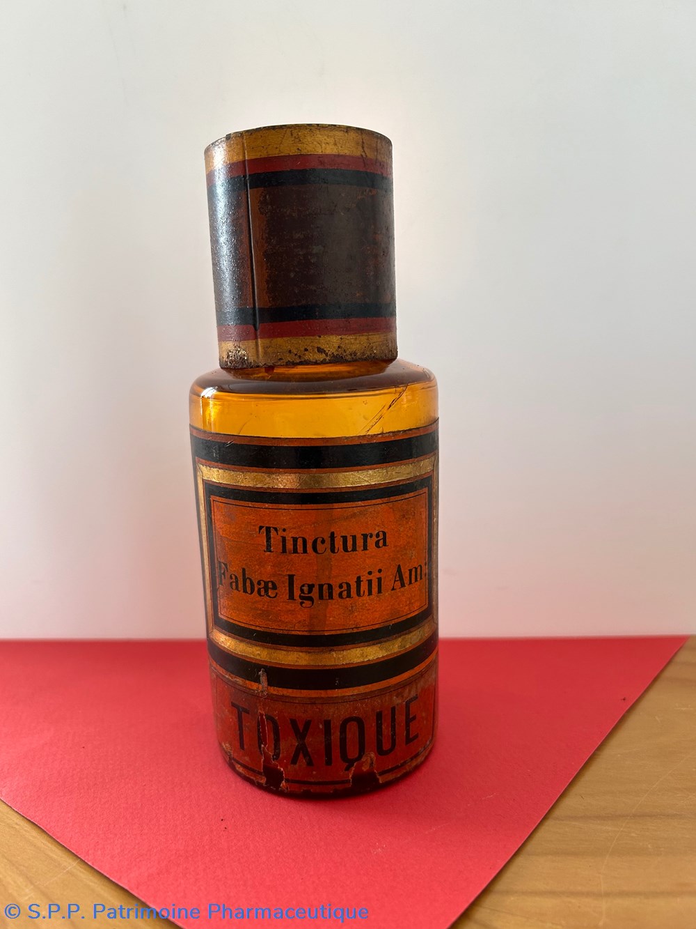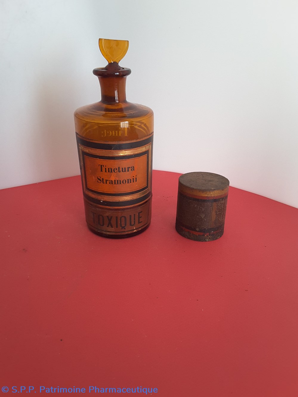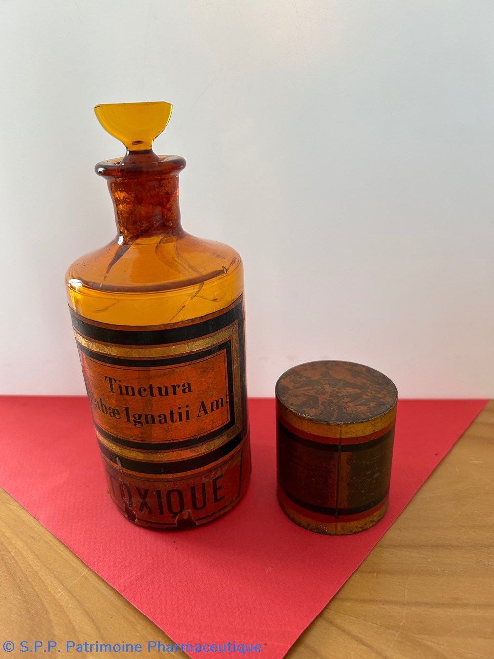 Flacon en verre ambré transparent avec étiquette imprimée de façon écran de soie.sur une face et une étiquette en papier sur l'autre face encadrée de bandes or, rouge et noir, avec intérieur rouge et lettres noires. Couvercle très abimé en tôle de couleur marron avec des bandes dorées.rouge et or. Goulot étroit fermé à l'émeri avec un bouchon en verre