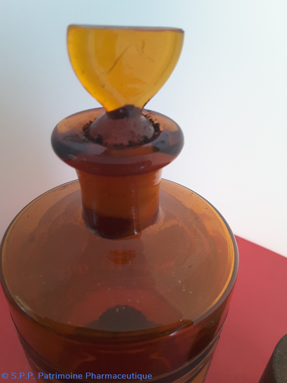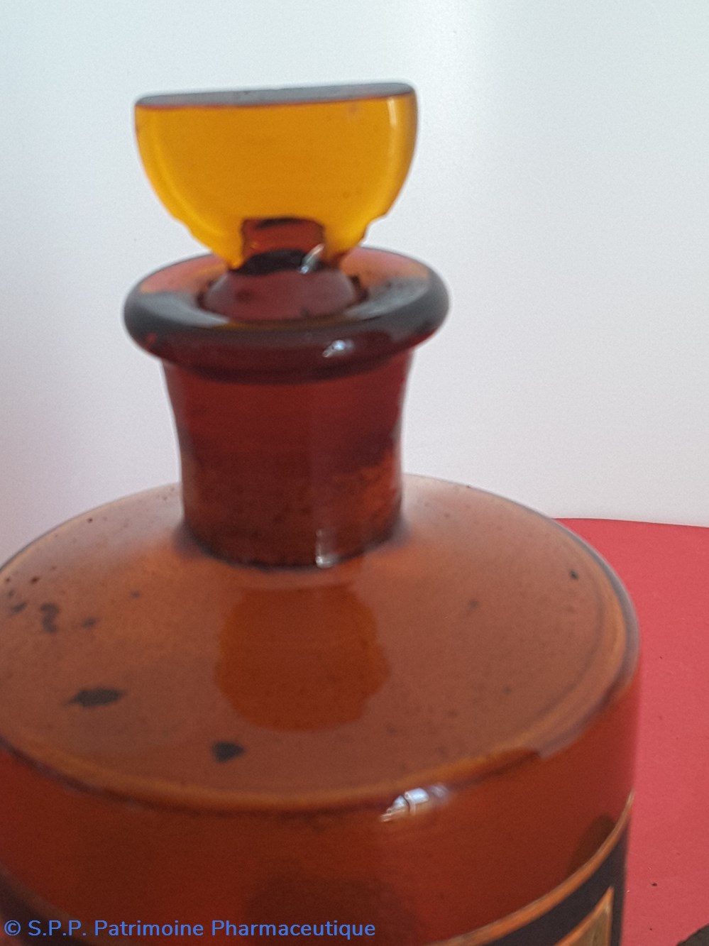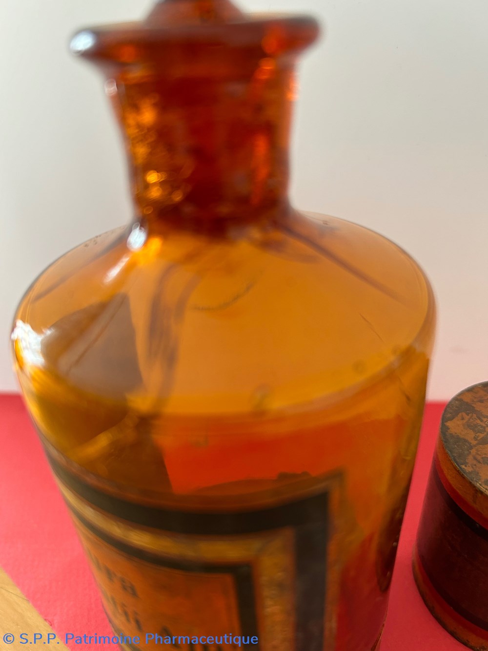Pot en verre ambré transparent avec étiquette en papier sur l'autre face encadrée de bandes or, rouge et noir, avec intérieur rouge et lettres noires. Couvercle en tôle de couleur marron avec des bandes dorées.rouge et or. Goulot étroit fermé à l'émeri ave un bouchon en verre. Fêlures dans le haut du flacon