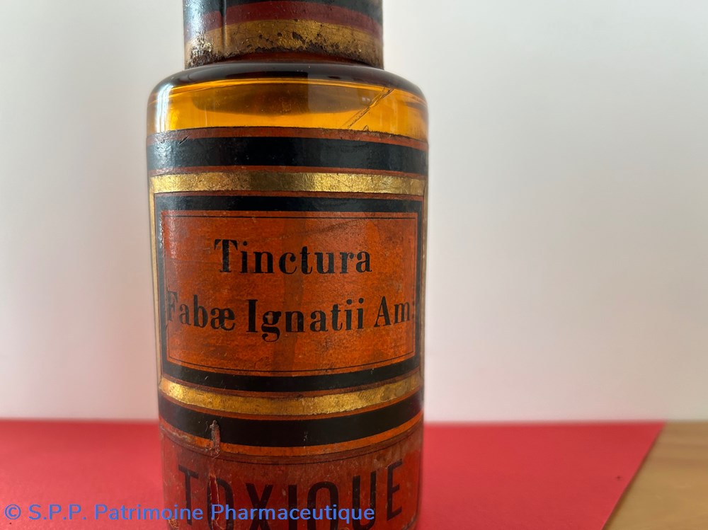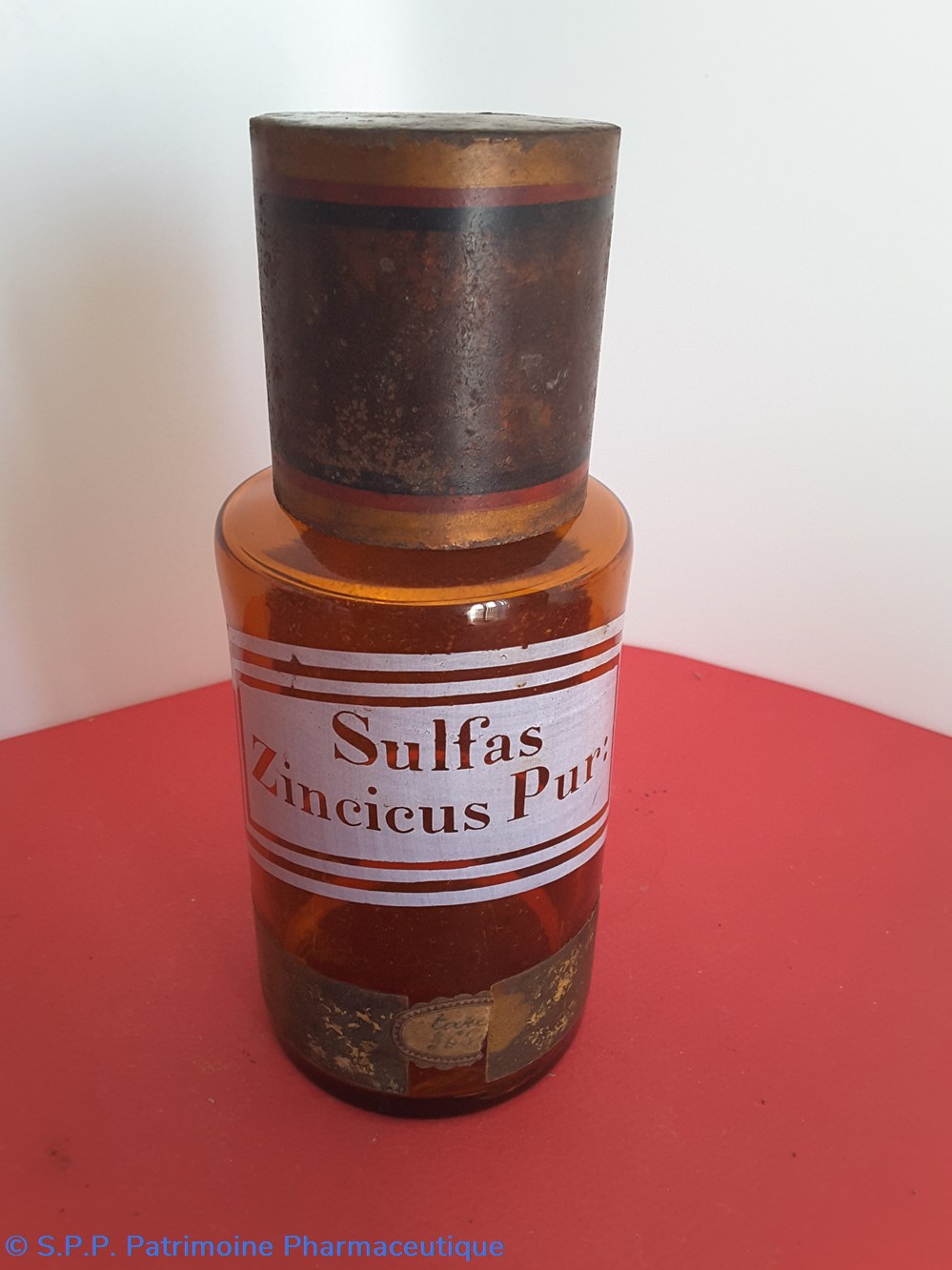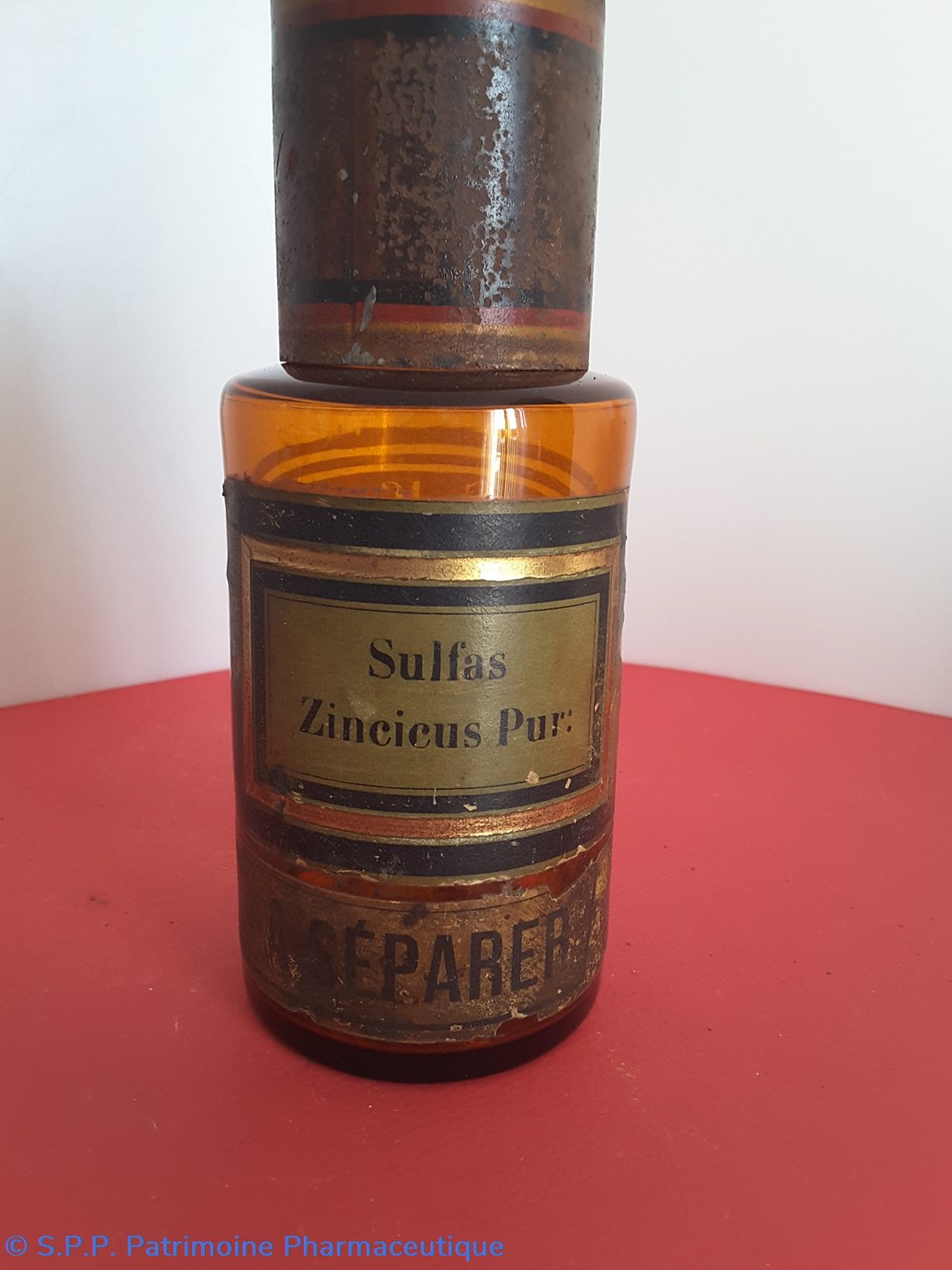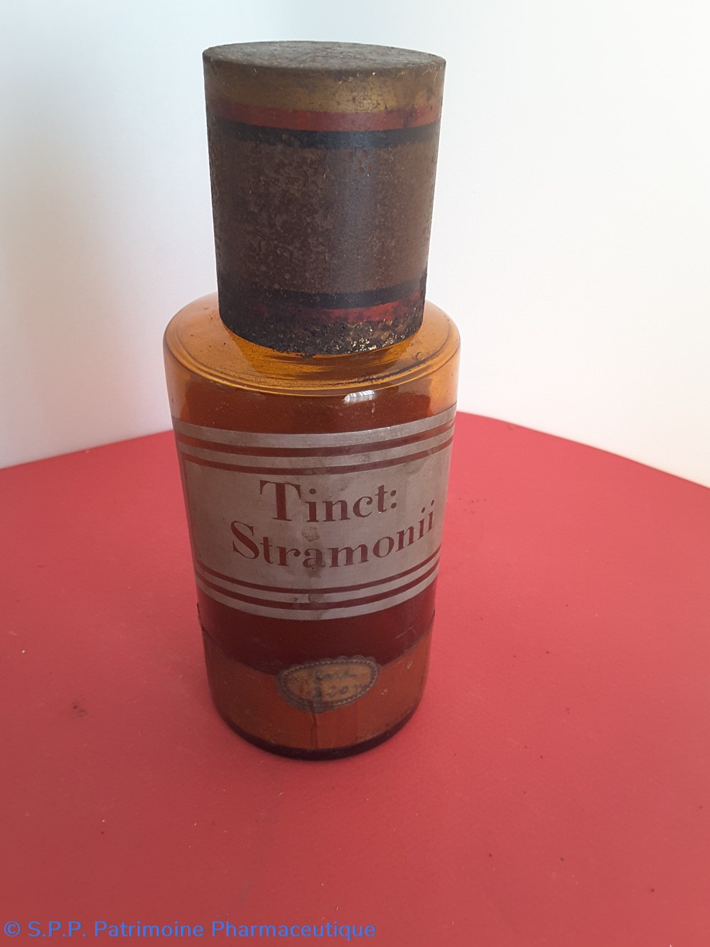 Pot en verre ambré transparent avec étiquette en papier sur l'autre face encadrée de bandes or, rouge et noir, avec intérieur rouge et lettres noires. Couvercle en tôle de couleur marron avec des bandes dorées.rouge et or. Goulot étroit fermé à l'émeri ave un bouchon en verre. Fêlures dans le haut du flacon