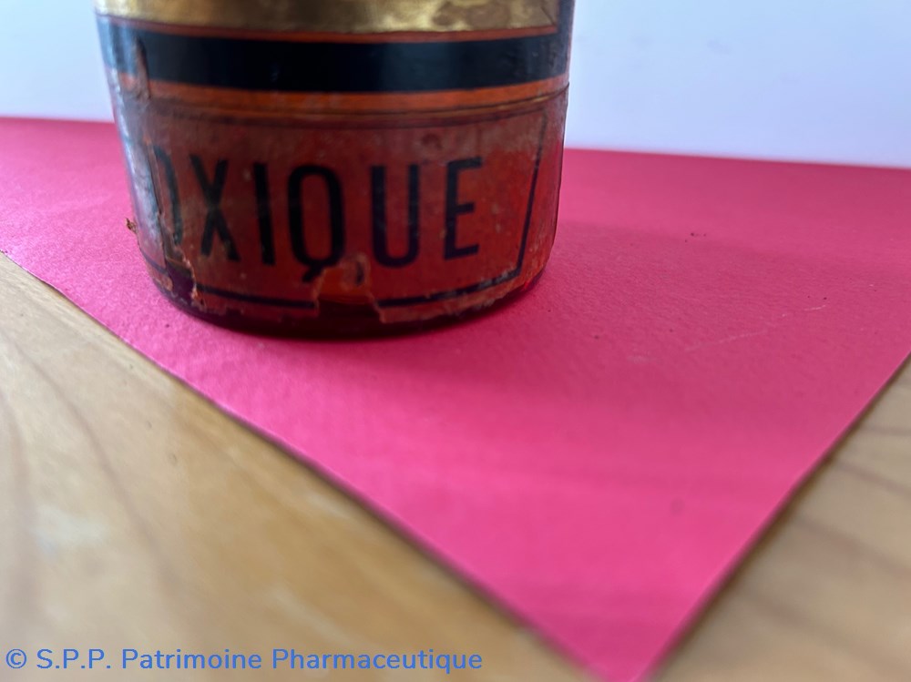 Mention "TOXIQUE" sur une étiquette collée sur la base du flacon.