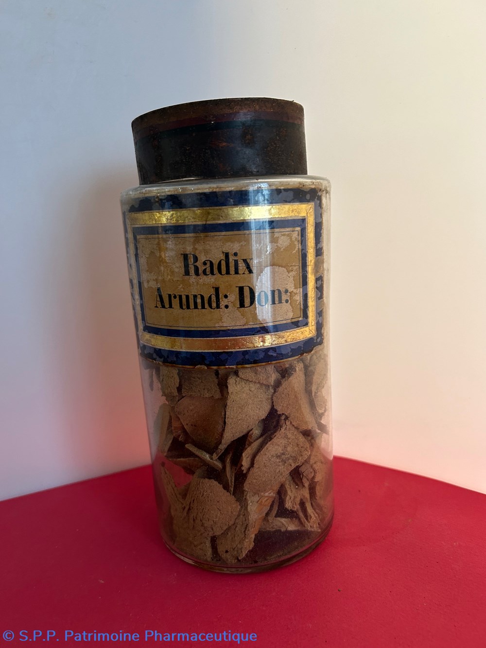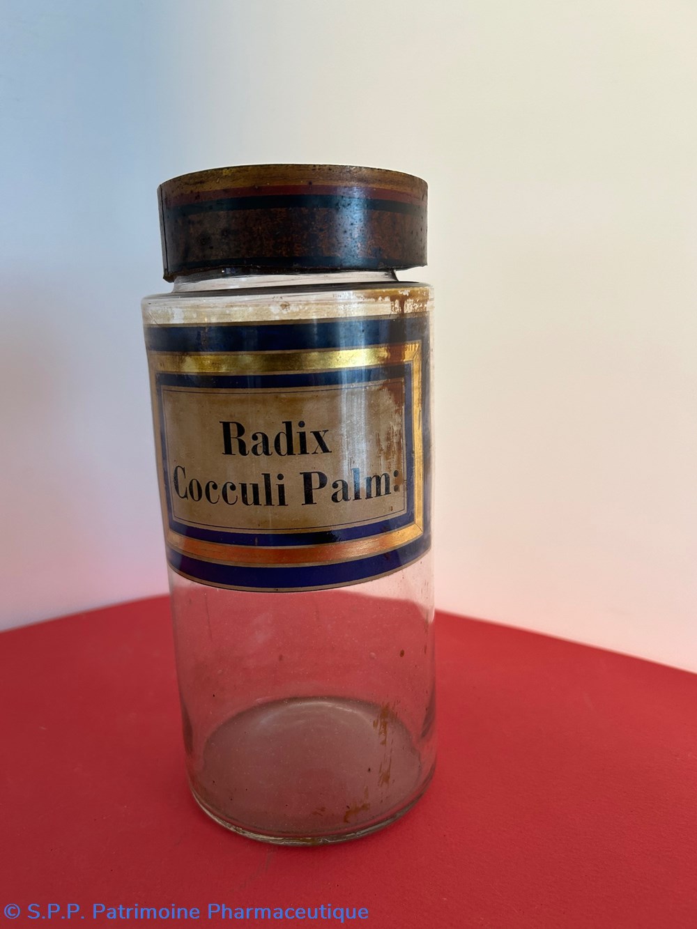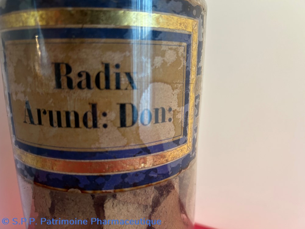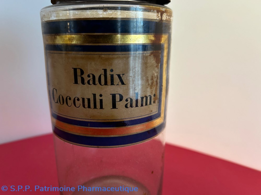 Flacon de pharmacie en verre soufflé à large ouverture supérieure permettant l'introduction facile de plantes ou de poudre. Etiquette collée à l'intérieur très joliment ornée d'encadrements alternés bleu et or . Le nom est inscrit en noir au milieu d'un rectangle beige. Un couvercle en tôle peinte surmonte le flacon sans bouchon intérieur. Ce couvercle était initialement décoré à sa base et dans la partie supérieure de filets dorés et rouges. Le flacon est vide. Les parois internes sont recouvertes de poudre brune.
