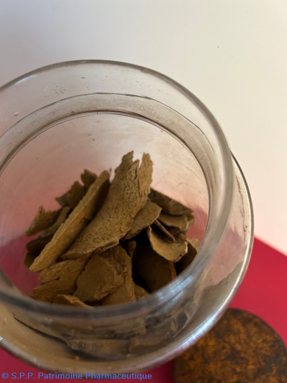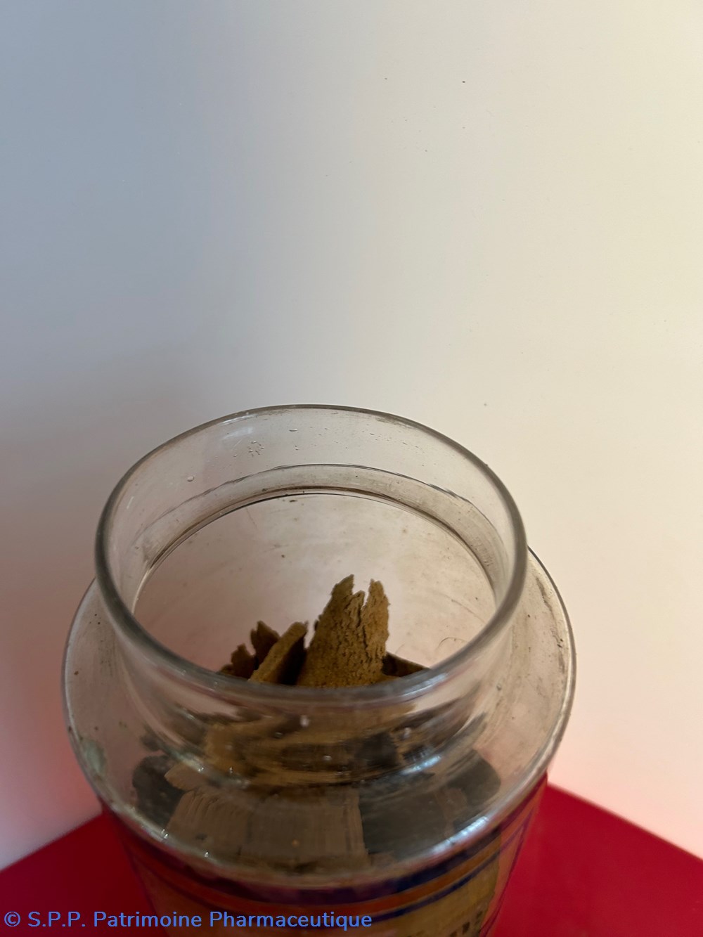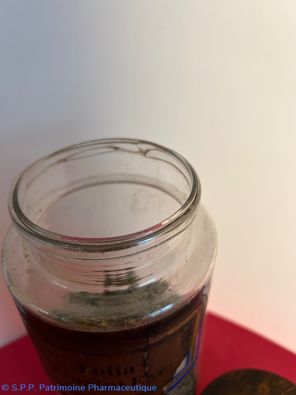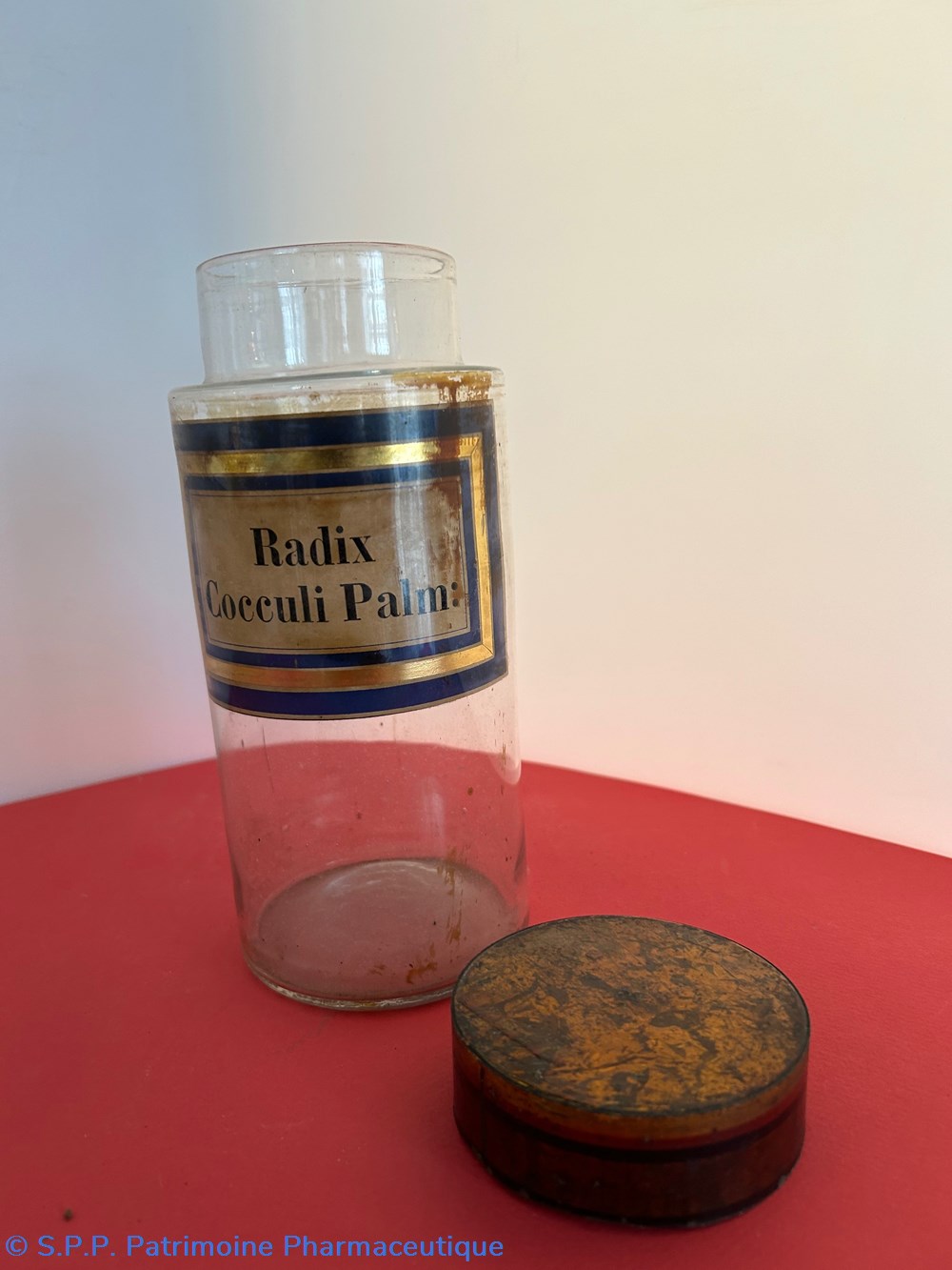 Flacon de pharmacie en verre soufflé à large ouverture supérieure permettant l'introduction facile de plantes ou de poudre. Etiquette collée à l'intérieur très joliment ornée d'encadrements alternés bleu et or . Le nom est inscrit en noir au milieu d'un rectangle beige. Un couvercle en tôle peinte surmonte le flacon sans bouchon intérieur. Ce couvercle était initialement décoré à sa base et dans la partie supérieure de filets dorés et rouges. Le flacon est vide. Les parois internes sont recouvertes de poudre brune.
